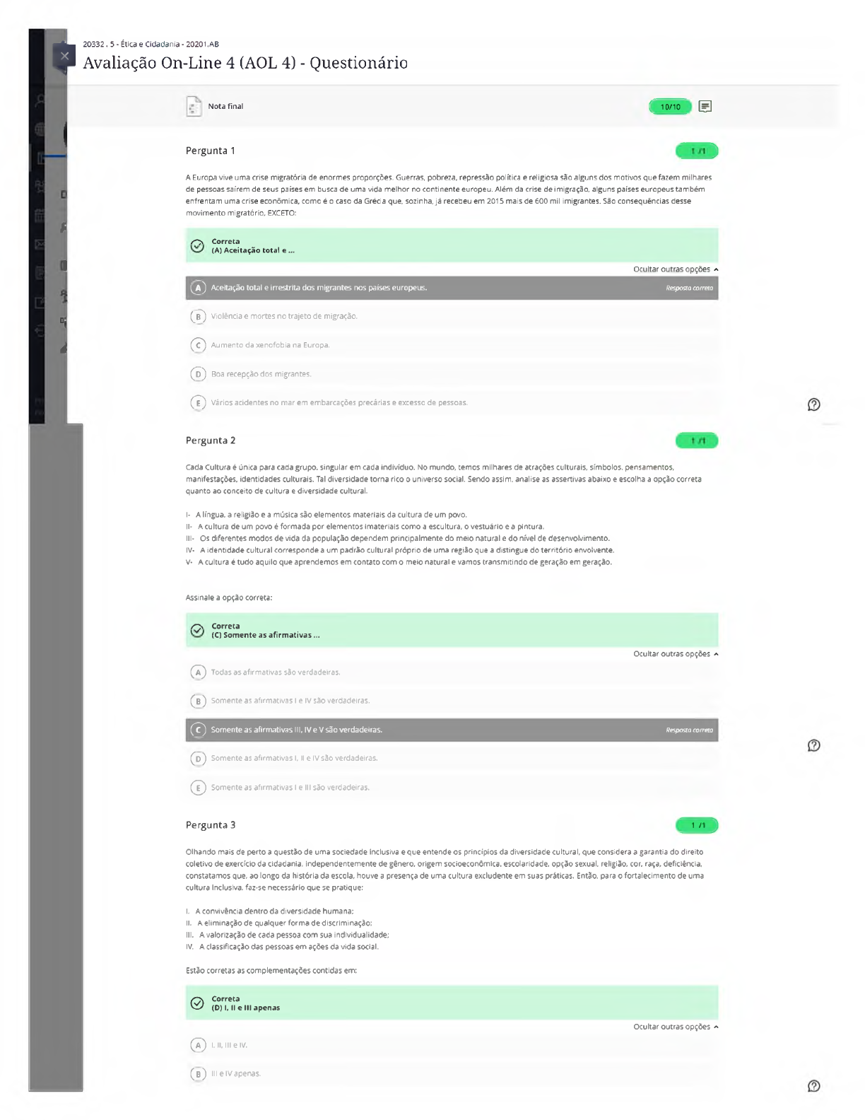 k> f- °; ò 20332.5 • Ética e Cidadania - 20201 .AB Avaliação On-Line 4 (AOL 4) - Questionário Nota final ( 1 0 /1 0 g ] Pergunta 1 1 A Europa vive uma crise migratória de enormes proporções. Guerras, pobreza, repressão política e religiosa são alguns dos motivos que fazem milhares de pessoas saírem de seus países em busca de uma vida melhor no continente europeu. Além da crise de imigração, alguns países europeus também enfrentam uma crise econômica, como é o caso da Grécia que, sozinha, já recebeu em 2015 mais de 600 mil imigrantes. São consequências desse movimento migratório, EXCETO: -O , Correta (A) Aceitação total e ... Ocultar outras opções * QA) Aceitação total e irrestrita dos migrantes nos países europeus. Resposta correta (jT ) Violência e mortes no trajeto de migração. ( ? ) Aumento da xenofobia na Europa. ( 5 ) Boa recepção dos migrantes. ( ? ) Vários acidentes no mar em embarcações precárias e excesso de pessoas. Pergunta 2 Cada Cultura é única para cada grupo, singular em cada indivíduo. No mundo, temos milhares de atrações culturais, símbolos, pensamentos, manifestações, identidades culturais. Tal diversidade torna rico o universo social. Sendo assim, analise as assertivas abaixo e escolha a opção correta quanto ao conceito de cultura e diversidade cultural. I- A língua, a religião e a música são elementos materiais da cultura de um povo. II- A cultura de um povo é formada por elementos imateriais como a escultura, o vestuário e a pintura. III- Os diferentes modos de vida da população dependem principalmente do meio natural e do nível de desenvolvimento. IV- A identidade cultural corresponde a um padrão cultural próprio de uma região que a distingue do território envolvente. V- A cultura é tudo aquilo que aprendemos em contato com o meio natural e vamos transmitindo de geração em geração. Assinale a opção correta: /^v Correta (C) Somente as afirm ativas... Ocultar outras opções * ( Ã ) Todas as afirmativas são verdadeiras. ( B ) Somente as afirmativas I e IV são verdadeiras. ( ? ) Somente as afirmativas lll. IV e V são verdadeiras. Resposta correta ( d ) Somente as afirmativas I, II e IV são verdadeiras. ( J ) Somente as afirmativas l e lll são verdadeiras. Pergunta 3 1 /1 ) Olhando mais de perto a questão de uma sociedade indusiva e que entende os princípios da diversidade cultural, que considera a garantia do direito coletivo de exercício da cidadania, independentemente de gênero, origem socioeconômica, escolaridade, opção sexual, religião, cor, raça, deficiência, constatamos que, ao longo da história da escola, houve a presença de uma cultura exdudente em suas práticas. Então, para o fortalecimento de uma cultura indusiva, faz-se necessário que se pratique: I. A convivência dentro da diversidade humana: II. A eliminação de qualquer forma de discriminação; III. A valorização de cada pessoa com sua individualidade; IV. A classificação das pessoas em ações da vida social. Estão corretas as complementaçôes contidas em: 0 Correta(D) I. II e III apenas Ocultar outras opções * ( Ã ) I, II, lll e IV. ( b ) lll e IVapenas. ( 7 ) II e IV apenas. ( d ) I. II e III apenas. © I e ill apenas Pergunta 4 1 n A Lei 10.639, de 9 de janeiro de 2003, inclui no currículo dos estabelecimentos de ensino fundamental e médio, oficiais e particulares, a obrigatoriedade do ensino sobre História e Cultura Afro-Brasileira e determina que o conteúdo programático incluirá o estudo da História da África e dos africanos, a luta dos negros no Brasil, a cultura negra brasileira e o negro na formação da sociedade nacional, resgatando a contribuição do povo negro nas áreas social, econômica e política pertinentes à História do Brasil, além de instituir, no calendário escolar, o dia 20 de novembro como data comemorativa do "Dia da Consciência Negra". Disponível em: http://www.planalto.gov.br. Acesso em: 27 jul. 2010 (adaptado). A referida lei representa um avanço não só para a educação nacional, mas também para a sociedade brasileira, porque: 0 Correta(D) Impulsiona o ... © © © Garante aos afrodescendentes a igualdade no acesso à educação. Legitima o ensino das ciências humanas nas escolas. Reforça a concepção etnocêntrica sobre a África e sua cultura. Ocultar outras opções * @ Impulsiona o reconhecimento da pluralidade étnico-racial do país. © Divulga conhecimentos para a população afro-brasileira. Pergunta 5 1 /1 Um dos maiores desafio da humanidade no século XXI é promover o enfrentamento dos conflitos originados das relações étnicas e raciais. Nos últimos vinte anos um cenário preocupante, relacionado ao crescimento de tais conflitos, tem nos chamado a atenção. Nesse sentido, avalie as assertivas abaixo e em seguida, responda ao que se pede. I. As relações étnico-raciais tem se constituído tema recorrente nos debates acadêmicos e educacionais, entretanto, discuti-las, sobretudo na educação básica consiste, ainda, numa tarefa complexa e extremamente difícil. II. Uma das primeiras tarefas na escola que deseja trabalhar na perspectiva da diversidade é desconstruir o tão difundido mito da democracia racial, pois não há como se combater algo que não é concebido como um fato real e frequente no nosso cotidiano. III. As formas de discriminação de qualquer natureza, não nascem na escola, porém o racismo, as desigualdades e as discriminações correntes na sociedade perpassam por ali. Está correta a opção: © Correta (A) I, II, III Ocultar outras opções < (jT ) Apenas I e III. ( J ) Apenas II e III. ( J ) Apenas l. ( J ) Apenas I e II. Pergunta 6 1 /i A superação da igualdade entre todos, é o que a escola tem buscado diante das Políticas Públicas, evoluindo para uma sociedade democrática do qual a pluriétnlca e as questões de gênero sejam respeitados em diversos ambientes, tendo as salas de aulas como um terreno 