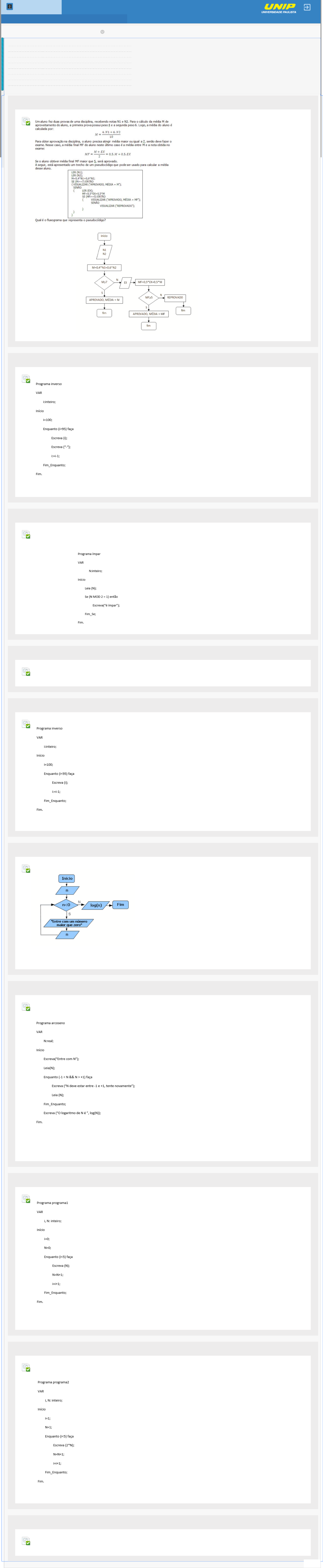 Revisar envio do teste: QUESTIONÁRIO UNIDADE IIPROGRAMACAO DE COMPUTADORES D525_15322_D_20201 CONTEÚDO Sábado, 4 de Abril de 2020 15h31min13s GMT-03:00 Usuário Curso PROGRAMACAO DE COMPUTADORES Teste QUESTIONÁRIO UNIDADE II Iniciado 04/04/20 15:00 Enviado 04/04/20 15:31 Status Completada Resultado da tentativa 5 em 5 pontos Tempo decorrido 30 minutos Resultados exibidos Respostas enviadas, Perguntas respondidas incorretamente Pergunta 1 Resposta Selecionada: a. Pergunta 2 Resposta Selecionada: b. Considere o programa em Português Estruturado a seguir. Qual a saída desse programa? 100-99-98-97-96 Pergunta 3 Resposta Selecionada: c. Classi�camos um número como par quando ele pode ser escrito da forma 2.n, com n = 0,1,2... Classi�camos um número como ímpar quando ele pode ser escrito da forma 2.n+1, com n = 0,1,2... Qual dos programas a seguir diz se um número inteiro dado é ímpar. Pergunta 4 Resposta Selecionada: a. Qual o resultado do cálculo 21 MOD 7? 0 Pergunta 5 Resposta Selecionada: a. Considere o programa em Português Estruturado a seguir. Quantas vezes a estrutura de repetição é executada? 0 Pergunta 6 Resposta Selecionada: c. Considere o fluxograma a seguir. Qual a saída desse fluxograma se o usuário der como entrada os valores –8 e 8? Considere que os números são escritos na tela com 4 casas decimais, sem arredondamento. Entre com um número maior que zero 0,9030 Pergunta 7 Resposta Selecionada: d. O programa a seguir calcula o arco seno de um número N dado. Como o seno de qualquer ângulo está restrito entre os valores –1 e +1, para que calculemos o arco seno de N, este também deve estar restrito entre –1 e +1. Qual a saída do programa se o usuário digitar o número 1,2 e o número 0,5 como entrada? A saída é dada em radianos. Entre com N. N deve estar entre –1 e +1, tente novamente. O logaritmo de N é 0,52. Pergunta 8 Resposta Selecionada: e. Considere o seguinte programa escrito em Português Estruturado. O laço do programa é executado quantas vezes? 5 Pergunta 9 Resposta Selecionada: d. Considere o seguinte programa escrito em Português Estruturado. O laço do programa é executado quantas vezes? 4 Pergunta 10 Resposta Selecionada: d. Qual das expressões a seguir calcula a soma do inverso de dois números, sendo que o primeiro será armazenado na variável A e o segundo na variável B? 1/A+1/B ← OK CONTEÚDOS ACADÊMICOS BIBLIOTECAS MURAL DO ALUNOUNIP 0,5 em 0,5 pontos 0,5 em 0,5 pontos 0,5 em 0,5 pontos 0,5 em 0,5 pontos 0,5 em 0,5 pontos 0,5 em 0,5 pontos 0,5 em 0,5 pontos 0,5 em 0,5 pontos 0,5 em 0,5 pontos 0,5 em 0,5 pontos