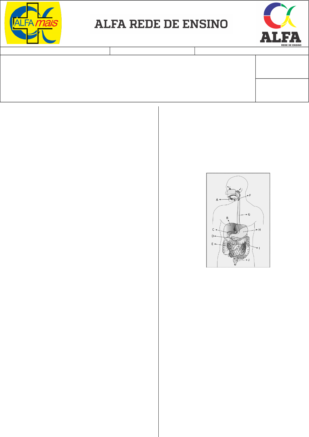 ALFA+1 – 2020 – SEMANA 02 2ª SÉRIE - EM BIOLOGIA F1 NOME: Nicole Leonardi TURMA: 2B NOTA: 01. Nos vertebrados, a digestão é extracelular. Com base nessa afirmação, responda: a) As aves apresentam moela. O que é esta estrutura e para que ela serve? Moela = estrutura muscular presente no sistema digestório das aves cuja função é a digestão do alimento através do processo de trituração. b) No intestino delgado humano desembocam duas glândulas importantes: o pâncreas e o fígado. Qual é a função do fígado para o sistema digestório? Fígado = atua na digestão extracelular dos vertebrados sintetizando a bile, responsável por emulsionar gorduras para facilitar a digestão. 02. Todo animal precisa de substâncias orgânicas obtidas a partir de outros seres, vivos ou mortos. Comer é a palavra-chave na estratégia de sobrevivência animal. Ao longo da evolução, os animais desenvolveram um sistema capaz de transformar o alimento obtido para melhor aproveitá-lo, o sistema digestório. Com relação a esse sistema, diferencie os dois tipos existentes de digestão e cite um exemplo de filo para cada de digestão. Incompleto: poríferos, cnidários e platelmintos Completo: nematodos, anelídeos, moluscos, artrópodes , equinodermo cordados. 03. O pâncreas é uma grande glândula situada paralelamente ao estômago e abaixo dele. As enzimas digestivas pancreáticas são secretadas pelos ácinos pancreáticos, enquanto grande quantidade de bicarbonato de sódio é secretada pelos ductos pequenos e maiores que se originam dos ácinos. Após a entrada do quimo no intestino delgado, a secreção pancreática fica abundante, principalmente em resposta ao hormônio secretina, secretado quando o quimo vindo do estômago penetra no duodeno. Explique de que forma a grande quantidade de íons bicarbonato presente na secreção pancreática contribui para a digestão dos nutrientes. Contribui para a digestão dos nutrientes que atua na facilitação dos meios pelos quais as enzimas digestivas atuam. Ocorre no duodeno e, tal ação alcaliniza o local, por conta da presença do bicarbonato, é a condição ideal para o perfeito funcionamento da enzima. 04. A figura abaixo mostra órgãos do sistema digestório humano. Identifique com a letra correspondente, nomeando‐o, a) o órgão cuja secreção contém bicarbonato de sódio, além de várias enzimas digestivas; pâncreas. b) o principal órgão responsável pela absorção de nutrientes; intestino delgado c) o órgão em que se inicia a digestão de proteínas; estômago d) o órgão que produz substâncias que auxiliam a digestão de gorduras, mas que não produz enzimas: o fígado. 05. A vaca é um ruminante, cujo estômago tem compartimentos onde ocorre o processo de digestão da celulose. Esse processo é auxiliado por microrganismos. a) Que tipo de relação biológica existe entre a vaca e esses outros seres vivos? Justifique. Mutualismo: relação obrigatória, ambos os indivíduos ganham com a associação. O microrganismo encontra um ambiente com alimento e a vaca tem a digestão favorecida. b) Que nutrientes do mesmo grupo da celulose os humanos conseguem digerir? Celulose é um polissacarídeo, assim como o amido e glicogênio.