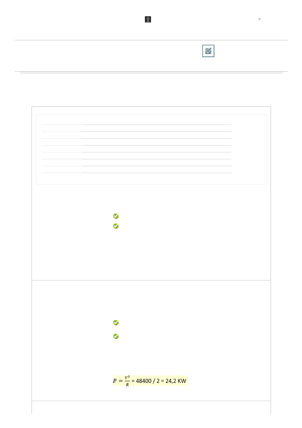 21/05/2019 Revisar envio do teste: <font class="click">AS... https://bb.cruzeirodosulvirtual.com.br/webapps/assessment/review/review.jsp?attempt_id=_45007544_1&course_id=_558714_1&content_id=_46… 1/2 Revisar envio do teste: <font class="click">AS I</font> ANÁLISE DE CIRCUITOS ELÉTRICOS - 60h_Turma_01_042019 (SP) Material Referencial ATIVIDADES DA DISCIPLINA Revisar envio do teste: <font class="click">AS I</font> Usuário Uelton de Souza Rodrigues CRUZ_EAD_Engenharia Elétrica (Semipresencial)_6A_20191 Curso ANÁLISE DE CIRCUITOS ELÉTRICOS - 60h_Turma_01_042019 (SP) Teste <font class="click">AS I</font> Iniciado 30/04/19 15:27 Enviado 30/04/19 16:10 Status Completada Resultado da tentativa 0,8 em 0,8 pontos Tempo decorrido 42 minutos Resultados exibidos Respostas enviadas, Respostas corretas, Comentários Pergunta 1 Resposta Selecionada: c. Resposta Correta: c. Comentário da resposta: A corrente elétrica nos condutores metálicos é constituída de elétrons livres no sentido oposto ao convencional. elétrons livres no sentido oposto ao convencional. Justificativa (comentário da resposta) Dica: É possível retirar fragmentos do material estudado para comentar a resposta. A corrente elétrica é o movimento de elétrons livres pelo condutor, no sentido real do negativo ao positivo; ou convencional, do positivo ao negativo. Pergunta 2 Resposta Selecionada: c. Resposta Correta: c. Comentário da resposta: Considerando que um circuito elétrico é alimentado por 220 VAC e possui resistência de 2 Ω, qual é o valor da potência? 24,2 KW. 24,2 KW. Justificativa (comentário da resposta) Dica: É possível retirar fragmentos do material estudado para comentar a resposta. Para saber a potência do circuito, deve-se aplicar a seguinte fórmula: Acesso MóvelDisciplinas 0,2 em 0,2 pontos 0,2 em 0,2 pontos Uelton de Souza Rodrigues CRUZ_EAD_En... https://bb.cruzeirodosulvirtual.com.br/webapps/blackboard/execute/courseMain?course_id=_558714_1 https://bb.cruzeirodosulvirtual.com.br/webapps/blackboard/content/listContent.jsp?course_id=_558714_1&content_id=_4690160_1&mode=reset https://bb.cruzeirodosulvirtual.com.br/webapps/blackboard/content/listContent.jsp?course_id=_558714_1&content_id=_4690174_1&mode=reset https://bb.cruzeirodosulvirtual.com.br/webapps/portal/execute/tabs/tabAction?tab_tab_group_id=_389_1 https://bb.cruzeirodosulvirtual.com.br/webapps/portal/execute/tabs/tabAction?tab_tab_group_id=_379_1 https://bb.cruzeirodosulvirtual.com.br/webapps/login/?action=logout 21/05/2019 Revisar envio do teste: <font class="click">AS... https://bb.cruzeirodosulvirtual.com.br/webapps/assessment/review/review.jsp?attempt_id=_45007544_1&course_id=_558714_1&content_id=_46… 2/2 Terça-feira, 21 de Maio de 2019 09h06min35s BRT Pergunta 3 Resposta Selecionada: a. Resposta Correta: a. Comentário da resposta: Quais são as fórmulas para tensão de pico a pico, tensão média e tensão e�caz? VPP = 2 · VP, Vmed = 0,637 x Vmax, Vef = 0,707 x Vmax VPP = 2 · VP, Vmed = 0,637 x Vmax, Vef = 0,707 x Vmax Alternativa correta: E Justificativa (comentário da resposta) Dica: É possível retirar fragmentos do material estudado para comentar a resposta. Pergunta 4 Resposta Selecionada: c. Resposta Correta: c. Comentário da resposta: Imagine que ao ler o manual de instalação de um equipamento, você se depare com a seguinte informação: V = 127 VAC. I = 10 A. R 5 Ω. Qual é o tipo, valor de tensão que se deve ligar ao equipamento, assim como a corrente que este consome? Tensão alternada, 10 A. Tensão alternada, 10 A. Justificativa (comentário da resposta) Dica: É possível retirar fragmentos do material estudado para comentar a resposta. A representação VAC indica se tratar de uma tensão alternada, enquanto a referência a 10 A sinaliza a corrente apropriada. ← OK 0,2 em 0,2 pontos 0,2 em 0,2 pontos javascript:launch('/webapps/gradebook/do/student/viewAttempts?course_id=_558714_1&method=list&nolaunch_after_review=true');