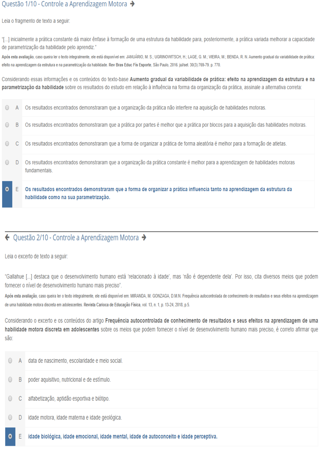 0:07:28 Questão 4/10 - Controle da Aprendizagem Motora D Ler em voz alta Leia a citação: "Observamos que, no núcleo [...] [de exemplos esportivos],...