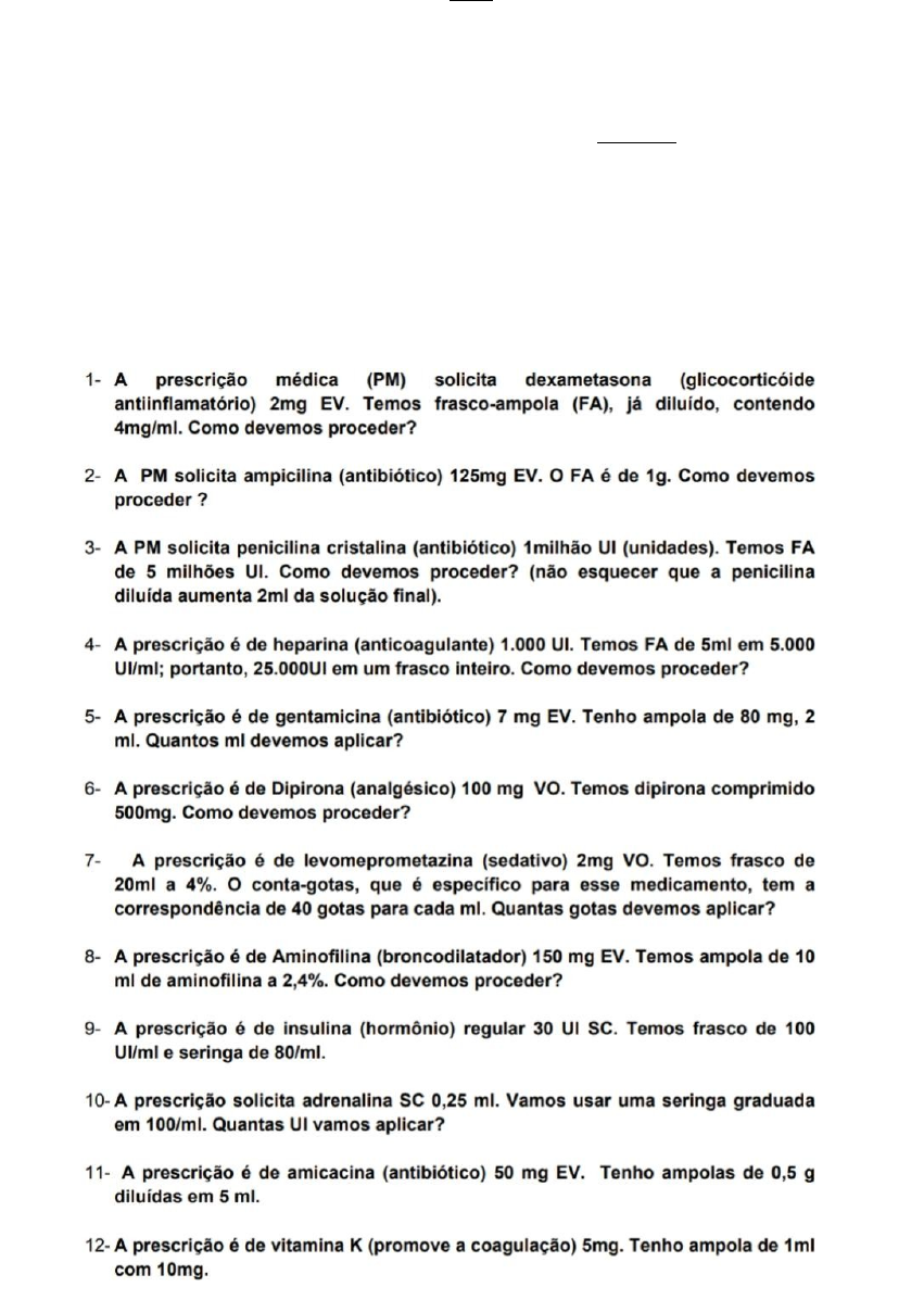 1) Prescrição médica (PM) solicita dexametasona (glicocorticóide anti-inflamatório) 2mg EV. Temos frasco-ampola (FA), já diluído, contendo 4 mg/ml. Como podemos proceder? F > S 4mg ------- 1ml 4x = 2.1 P > X 2mg ------- x x = 2 = 0,5ml 4 2) A PM solicita ampicilina (antibiótico) 125mg EV. O FA é de 1g. como devemos proceder? 1g ------- 1000mg 1000mg ----------- 10ml x = 1.250 = 1,25 ml 125mg ----------- x 1000 3) A PM solicita ampicilina (antibiótico) milhão UI (unidades). Temos FA de 5 milhões UI. Como devemos proceder? (Não esquecer que a penicilina diluída aumenta 2ml da solução final).
