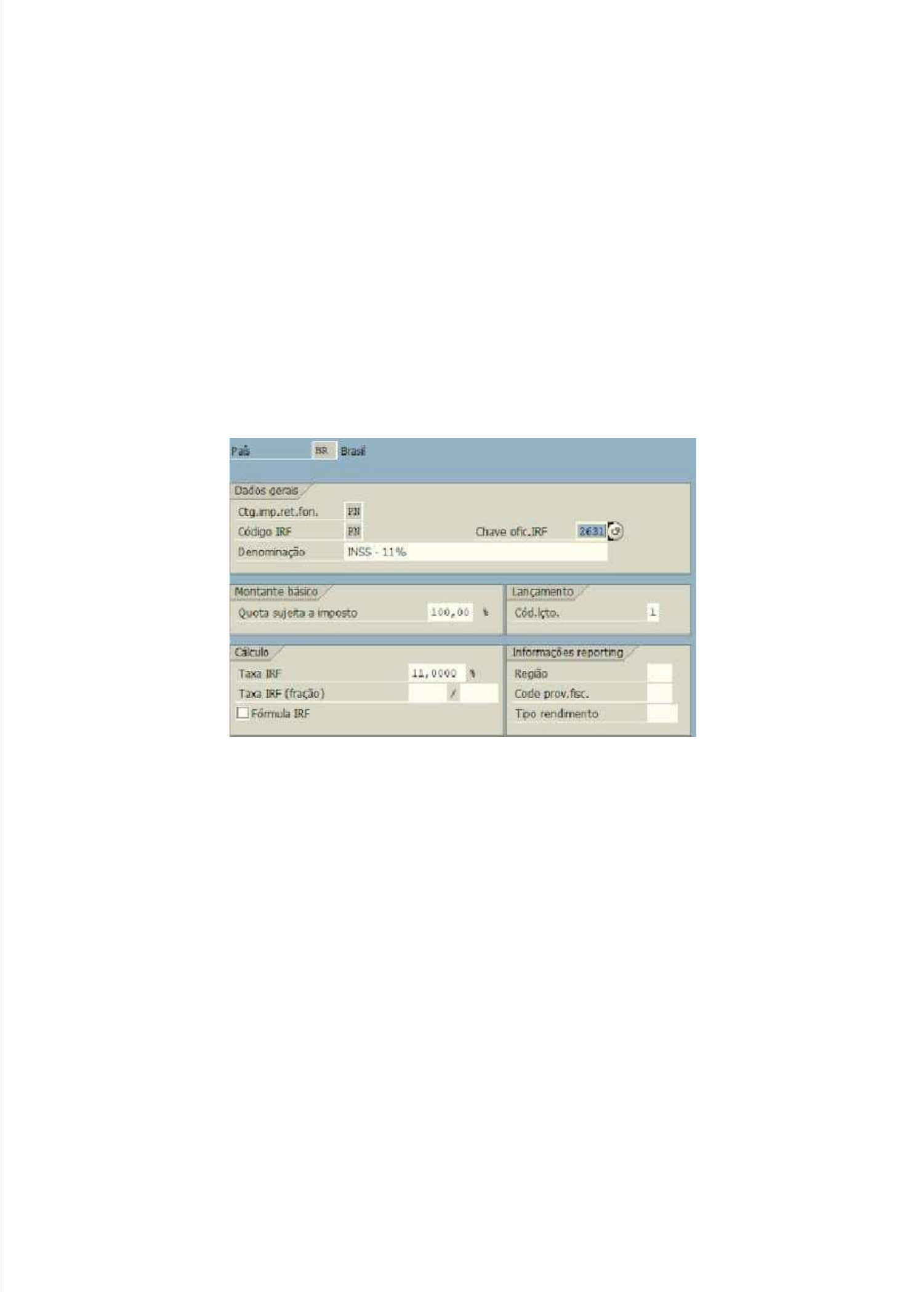 SAP Configurar Imposto INSS PatronalSAP Configurar Imposto INSS Patronal Dias atrás foi solicitado que configuração para que fosse possível aDias atrás foi solicitado que configuração para que fosse possível a emissão de notas fiscais de serviço com emissão de notas fiscais de serviço com retenção de imposto e o tal doretenção de imposto e o tal do INSS patronal.INSS patronal. Dando uma quebrada de cabeça chegamos numa configuração que éDando uma quebrada de cabeça chegamos numa configuração que é muito simples apesar de muitos acharem complicado fazer e pmuito simples apesar de muitos acharem complicado fazer e partem paraartem para a criação de novas conditions, amarração no esquema de calca criação de novas conditions, amarração no esquema de calculo e etc, oulo e etc, o que na minha opinião achei desnecessário para este cenário, vamos que na minha opinião achei desnecessário para este cenário, vamos lá:lá: 1) - Criamos um código/categoria de imposto para calcular o INSS de1) - Criamos um código/categoria de imposto para calcular o INSS de 11%, (este valor será retido da conta do cliente)11%, (este valor será retido da conta do cliente) 2) - Criamos um codigo/categoria de imposto para calcular e lançar o2) - Criamos um codigo/categoria de imposto para calcular e lançar o INSS Patronal de 20%, (este valor será jogado em outras contas e INSS Patronal de 20%, (este valor será jogado em outras contas e nãonão deve ser retido da conta do cliente).deve ser retido da conta do cliente). Note que criamos este imposto utilizandoNote que criamos este imposto utilizando a opção de lançamento 3 que a opção de lançamento 3 que fará com quefará com que uma das pernas sejam lançadasuma das pernas sejam lançadas no razão e não será retido da conta cliente ou fornecedor no razão e não será retido da conta cliente ou fornecedor 3) - No customizing abaixo cadastrar o imposto patronal para lançamento da chave 503) - No customizing abaixo cadastrar o imposto patronal para lançamento da chave 50 Imposto retido na fonte (IRF)Imposto retido na fonte (IRF) Imposto retido na fonte ampliadoImposto retido na fonte ampliado LançamentoLançamento Contas para imposto retido na fonteContas para imposto retido na fonte Gravar contas para IRF a pagarGravar contas para IRF a pagar 4) - Na opção do customizing abaixo, cadastramos o lançamento da contrapartida, especifico na chave 40 Imposto retido na fonte (IRF) Imposto retido na fonte ampliado Lançamento Contas para imposto retido na fonte Gravar contas para IRF a pagar Gravar contas p/lançto.de contrapartida imposto retido fonte 5) - Foi criado um IVA para ativar as retenção de ISS e IR, neste caso como a retenção do INSS esta configurada direto em FI não é necessário criar conditions ou atribuições pela J1btax. 6) - E como resultado temos o correto calculo onde visualizamos no contábil contábil: note que foi calculado 11% sobre R$1000,00 e o destacado o patronal de 20% sem reduzir ou agregar ao valor da conta de cliente.