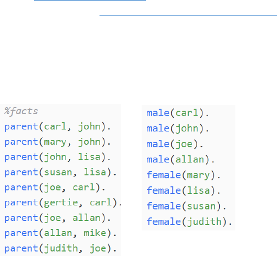 ECOM11 - Prolog – Lista de Exercícios 2 UNIFEI – Universidade Federal de Itajubá Prof. João Paulo Reus Rodrigues Leite -------------------------------------------------------------------------------------------------------------------------------------- Os exercícios abaixo devem ser resolvidos utilizando a linguagem Prolog (SWI-Prolog), e enviados via SIGAA na tarefa “Trabalho 2 - Prolog”, em formato de código-fonte (extensão “.pl”). No seu arquivo de respostas, faça um comentário com o número da questão e, logo abaixo, coloque sua resposta. Todas as respostas devem estar em um mesmo arquivo. Prazo para entrega: De 13/05/2020 a 23/06/2020 às 23:59h. O trabalho valerá 30% da nota final da disciplina e deve ser feito INDIVIDUALMENTE. É permitido tirar dúvidas com professor e colegas, consultar materiais de aula, mas trabalhos idênticos não serão corrigidos e terão suas notas zeradas. Para dúvidas, tratar via e-mail (joaopaulo@unifei.edu.br), ou participar da aula do dia 10/06/2020 às 13:30h através do Google Meet, no endereço https://meet.google.com/pdr-bqho-nas. -------------------------------------------------------------------------------------------------------------------------------------- Lista de Exercícios: 1) Entre com os seguintes fatos em sua base de dados do Prolog: A seguir, crie regras para as seguintes relações familiares: grandparent (avós), ancestor (antepassado), sibling (irmãos), mother (mãe), father (pai), spouse (cônjuge), uncle (tio), aunt (tia), cousin (primos). 2) Escreva um predicado em Prolog para solução do problema do enésimo número da sequência de Fibonacci: fibonacci(X, Y). 3) Escreva um predicado em Prolog para solução do fatorial de um dado número inteiro positivo N: fatorial(X, Y). 4) Escreva um predicado em Prolog que verifique se um determinado número inteiro é primo: is_prime(X). mailto:joaopaulo@unifei.edu.br https://meet.google.com/pdr-bqho-nas Implemente predicados para o tratamento de listas que: 5) Insira um elemento no final de uma lista. 6) Insira um elemento na enésima posição de uma lista. 7) Insira um elemento em uma lista ordenada, de maneira a manter a ordem na lista resultante. 8) Remova um elemento de uma lista. 9) Inverta uma lista. 10) Verifique se duas listas possuem os mesmos elementos. Ainda com relação a listas em Prolog: 11) Escreva um programa em Prolog para verificar se uma determinada lista de inteiros é um palíndromo. Um palíndromo, nesse caso, é uma lista cuja sequência de inteiros é a mesma, quer começando da esquerda para a direita ou da direita para a esquerda. 12) Escreva um programa em Prolog que substitua todas as ocorrências de um determinado elemento de uma lista por outro elemento, passado pelo usuário. 13) Escreva um programa em Prolog que calcule o somatório de todos os itens de uma lista. Obs.: Não utilize predicados fornecidos para a linguagem, caso eles forneçam diretamente a resposta para as questões. No entanto, caso seja necessário, você pode utilizar algum dos predicados que você mesmo construiu para resolver uma questão subsequente. Bom trabalho!