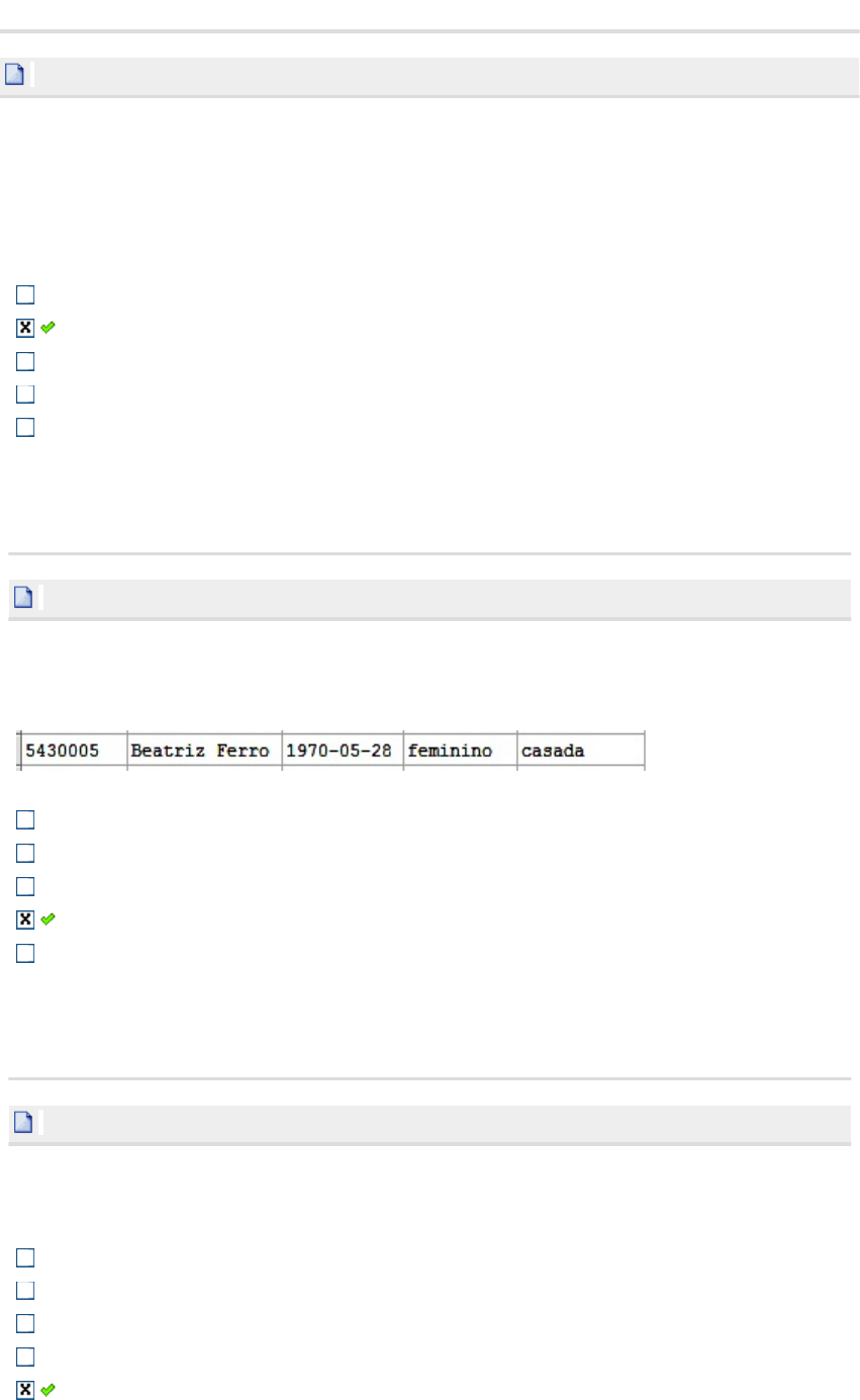 1a Questão Para o comando apresentado a seguir, indique a alternativa que apresenta o resultado obtido com a sua execução: DROP TABLE Funcionario; O banco de dados Funcionario é excluído. A tabela Funcionario é removida do banco de dados. Todos os registros da tabela Funcionario são excluídos. O banco de dados Funcionario é criado. A tabela Funcionario é criada no banco de dados. Respondido em 11/05/2020 19:25:57 2a Questão Para incluir a tupla mostrada abaixo na tabela PACIENTE executaríamos o seguinte comando: ADD INTO paciente VALUES (5430005, Beatriz Ferro, 1970-05-28, feminino, casada); INSERT INTO paciente (5430005, Beatriz Ferro, 1970-05-28, feminino, casada); ADD INTO paciente SET (5430005, Beatriz Ferro, 1970-05-28, feminino, casada); INSERT INTO paciente VALUES (5430005, Beatriz Ferro, 1970-05-28, feminino, casada); INSERT INTO paciente SET (5430005, Beatriz Ferro, 1970-05-28, feminino, casada); Respondido em 11/05/2020 19:26:50 3a Questão Considere o modelo de banco de dados abaixo: medico (CRM, NomeMedico, Idade,Cidade,Especialidade); paciente (Ident,NomePaciente,Idade,Cidade,Doenca); consulta (Ident, CRM, Data, Hora); Qual alternativa altera a idade do paciente "Fulano de tal"?. alter paciente set idade=25 update paciente where nomePaciente="Fulano de tal" insert into paciente (idade) values (25) where nomePaciente="Fulano de tal" alter paciente set idade=25 where nomePaciente="Fulano de tal" update paciente set idade=25 where nomePaciente="Fulano de tal" Respondido em 11/05/2020 19:28:02 4a Questão Como ficaria o comando SQL para criar a tabela a seguir? CREATE TABLE X_PROD ( CODIGO NUMBER(5) PRIMARY KEY, DESCRICAO VARCHAR2(40) NOT NULL UNIQUE, QUANTIDADE NUMBER(8), VALOR_UNIT NUMBER(9,2) ) CREATE TABLE X_EMPR ( CODIGO NUMBER(5) PRIMARY KEY, DESCRICAO VARCHAR2(40) NOT NULL, QUANTIDADE NUMBER(8), VALOR_UNIT NUMBER(9,2) ) CREATE TABLE X_EMPR ( CODIGO NUMBER(5) PRIMARY KEY, DESCRICAO VARCHAR2(40) NOT NULL UNIQUE, QUANTIDADE NUMBER(8), VALOR_UNIT NUMBER(9,2) ) CREATE TABLE X_PROD ( CODIGO NUMBER(5) PRIMARY KEY, DESCRICAO VARCHAR2(40) NOT NULL, QUANTIDADE NUMBER(8), VALOR_UNIT NUMBER(9,2) ) CREATE TABLE X_PROD ( CODIGO VARCHAR2(5) PRIMARY KEY, DESCRICAO VARCHAR2(40) NOT NULL UNIQUE, QUANTIDADE NUMBER(8), VALOR_UNIT NUMBER(9,2) ) Respondido em 11/05/2020 19:30:45 5a Questão Qual dos comandos SQL abaixo pode ser utilizado para incluir na definição da tabela aluno o atributo CPF com 11 caracteres? alter table aluno add cpf char(11); update table aluno insert cpf char(11); add into aluno cpf char(11); alter table aluno insert cpf char(11); insert into aluno cpf char(11); Respondido em 11/05/2020 19:31:31 6a Questão O diagrama acima apresenta uma classe denominada Municipio, para armazenar informações sobre determinado município, seu código, nome, tamanho e o estado a que pertence. Também há uma classe denominada Estado, para armazenar dados da unidade da Federação, como seu código e sua denominação. Com base nesse diagrama, e considerando a utilização da linguagem SQL, assinale a opção que apresenta a forma correta de criação da tabela Estado, considerando a criação das chaves primárias (PK) e estrangeiras (FK). create table estado ( codigo_ibge integer primary key, nome_estado varchar (255) ) create table estado ( codigo_ibge pk, nome_estado ) create table estado ( codigo_ibge integer primary key, nome_estado varchar (255), uf primary key ) create table estado ( codigo_ibge integer primary key, nome_estado varchar (255), uf integer FK ) create table estado ( codigo_ibge integer pk, nome_estado varchar(100) ) Respondido em 11/05/2020 19:34:30 7a Questão Partindo da tabela a seguir, considerando que a mesma já foi criada de acordo com essa ordem de atributos, como ficaria o comando SQL para aumentar em 10% o valor unitário de cada produto? UPDATE X_PROD SET VALOR_UNIT = VALOR_UNIT + 10 /100; UPDATE X_PROD SET VALOR_UNIT = VALOR_UNIT + VALOR_UNIT * 10 /100; UPDATE X_PROD SET VALOR_UNIT + 10 /100; UPDATE X_PROD SET VALOR_UNIT + VALOR_UNIT * 10 /100; UPDATE X_PROD SET VALOR_UNIT = VALOR_UNIT * 10 /100; Respondido em 11/05/2020 19:35:14 8a Questão A linguagem SQL é dividida em subconjuntos de acordo com as operações que queremos efetuar sobre um banco de dados. Indique a alternativa que apresenta um exemplo de comandos DDL (Linguagem de Definição de Dados): DROP TABLE ALUNOS UPDATE ALUNOS SET NOME = JOSÉ DA SILVA WHERE ID = 10 SELECT NOME, TURMA, IDADE FROM ALUNOS SELECT NOME FROM ALUNOS WHERE ID IN (1, 2, 3) DELETE * FROM ALUNOS