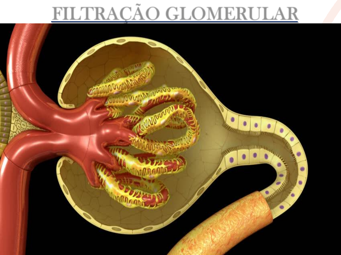 FILTRAÇÃO GLOMERULAR Profa. Glaucia Vilar TRÊS COMPONENTES BÁSICOS DA FUNÇÃO RENAL 1) FILTRAÇÃO GLOMERULAR 2) REABSORÇÃO TUBULAR 3) SECREÇÃO TUBULAR Processos que determinam a formação da urina FUNÇÃO RENAL Caminhos de uma substância após filtração glomerular: FUNÇÃO RENAL Indicadores de Função Renal FLUXO RENAL PLASMÁTICO – FRP TAXA DE FILTRAÇÃO GLOMERULAR - TFG FUNÇÃO RENAL FRP - Quantidade de plasma que entra pela artéria renal (mL/min) FLUXO RENAL PLASMÁTICO (FRP) FPR é de cerca de 600 - 625ml/min. FRAÇÃO DE FILTRAÇÃO A fração de filtração é a proporção do plasma que entra nos rins e que posteriormente é filtrada no glomérulo e passa para os túbulos renais. Em outras palavras, 20% do FRP é convertido em filtrado glomerular a cada minuto. Na imagem mostra os volumes de sangue filtrados por um único néfron em uma hora. A TFG é definida como volume de plasma filtrado por unidade de tempo. TFG é em média 180 L/dia ou 125mL/min TAXA DE FILTRAÇÃO GLOMERULAR (TFG) Permeabilidade capilar → endotélio, podócitos, membrana basal. Pressão hidrostática que expulsa o fluido dos capilares Pressão oncótica dentro dos capilares, que se opõem à saída do fluido TAXA DE FILTRAÇÃO GLOMERULAR (TFG) Os fatores envolvidos na taxa de filtração pelos capilares glomerulares são os mesmos para a filtração em qualquer leito capilar: TAXA DE FILTRAÇÃO GLOMERULAR (TFG) Passagem pela barreira de filtração Endotélio Membrana basal Epitélio sangue P TAXA DE FILTRAÇÃO GLOMERULAR (TFG) A filtração glomerular ocorre cerca de 100 vezes mais rápido que a filtração por capilares em outro lugar! Então, o que é responsável pela taxa de filtração glomerular muito alta (180 L/dia)? A permeabilidade e a área de superfície dos capilares glomerulares são maiores que nos capilares em outros lugares. Isso se deve, em parte, a fenestrações na camada de células endoteliais dos capilares glomerulares. Estes poros de 60-80 nm permitem a passagem livre de fluidos, solutos e até proteínas. O gradiente de pressão que impulsiona a filtração glomerular também é maior que nos capilares em outros lugares. TAXA DE FILTRAÇÃO GLOMERULAR (TFG) 180 litros de plasma são filtrados por dia Endotélio do capilar glomerular TAXA DE FILTRAÇÃO GLOMERULAR (TFG) MEDIÇÃO DA FILTRAÇÃO Os rins consistem em ~2 milhões de néfrons funcionais (~1 milhão em cada rim). Na doença renal, há uma perda progressiva desses néfrons. A avaliação da TFG é vista como o melhor marcador de função renal em indivíduos saudáveis ou doentes. Se uma substância fosse filtrada livremente no glomérulo e depois não fosse reabsorvida nem secretada pelos túbulos, que quantidade da substância apareceria na urina? a) Mais que a quantidade filtrada. b) Menos que a quantidade filtrada. c) O mesmo que a quantidade filtrada. TAXA DE FILTRAÇÃO GLOMERULAR (TFG) MEDIÇÃO DA FILTRAÇÃO Os rins consistem em ~2 milhões de néfrons funcionais (~1 milhão em cada rim). Na doença renal, há uma perda progressiva desses néfrons. A avaliação da TFG é vista como o melhor marcador de função renal em indivíduos saudáveis ou doentes. Se uma substância fosse filtrada livremente no glomérulo e depois não fosse reabsorvida nem secretada pelos túbulos, que quantidade da substância apareceria na urina? a) Mais que a quantidade filtrada. b) Menos que a quantidade filtrada. c) O mesmo que a quantidade filtrada. VxU P TFG = V = volume de urina (ml/min) U= concentração na urina (mg/ml) P= concentração plasmática (mg/ml) CLEARANCE Clearance (C; mL/min) é a quantidade de uma substância filtrada por minuto, dividida por sua concentração plasmática. Pode ser calculada dividindo a quantidade de substância excretada por minuto na urina (VxU) pela concentração da substância no plasma (P). A clearance para qualquer substância pode ser calculada. Se a substância é filtrada livremente e não é reabsorvida ou secretada, esta proporção nos permite estimar a taxa em que o fluido é filtrado no glomérulo (ou seja, a TFG). TAXA DE FILTRAÇÃO GLOMERULAR (TFG) A substância X é filtrada livremente. No entanto, a clearance da substância X (calculada usando VU/P) é inferior à TFG. O que isso diz sobre o manejo renal da substância X? a) A substância X não é nem secretada nem reabsorvida nos túbulos. b) A substância X torna-se ligada a uma proteína nos túbulos. c) Existe reabsorção líquida da substância X. d) Existe secreção líquida da substância X. CLEARANCE Clearance (C; mL/min) é a quantidade de uma substância filtrada por minuto, dividida por sua concentração plasmática. Pode ser calculada dividindo a quantidade de substância excretada por minuto na urina (VU) pela concentração da substância no plasma (P). A clearance para qualquer substância pode ser calculada. Se a substância é filtrada livremente e não é reabsorvida ou secretada, esta proporção nos permite estimar a taxa em que o fluido é filtrado no glomérulo (ou seja, a TFG). TAXA DE FILTRAÇÃO GLOMERULAR (TFG) A substância X é filtrada livremente. No entanto, a clearance da substância X (calculada usando VU/P) é inferior à TFG. O que isso diz sobre o manejo renal da substância X? a) A substância X não é nem secretada nem reabsorvida nos túbulos. b) A substância X torna-se ligada a uma proteína nos túbulos. c) Existe reabsorção líquida da substância X. d) Existe secreção líquida da substância X. SUBSTÂNCIAS UTILIZADAS PARA MEDIR A TFG A avaliação da TFG é baseada na depuração de substâncias. As características de uma substância ideal para essa avaliação incluem ausência de metabolismo sistêmico filtração livre pelos glomérulos ausência de secreção ou absorção através dos túbulos renais Substâncias utilizadas para medir a TFG: Inulina iohexol Creatinina TAXA DE FILTRAÇÃO GLOMERULAR (TFG) Existem diversas formas de calcular a 