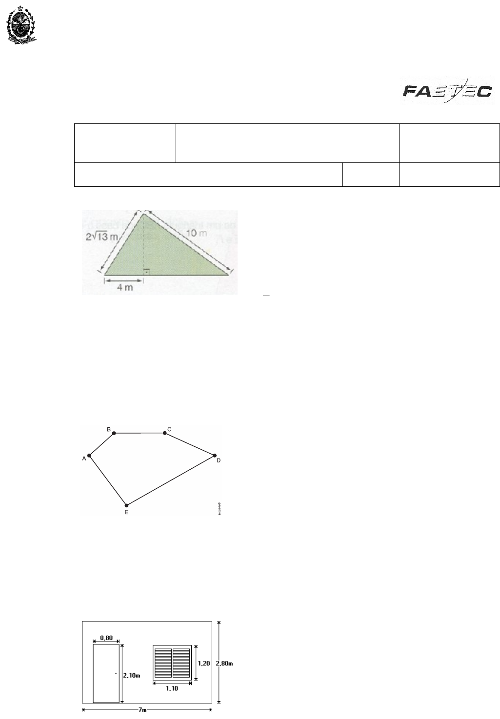 E.T.E. Ferreira Viana GOVERNO DO ESTADO DO RIO DE JANEIRO SECRETARIA DE ESTADO DE CIÊNCIA E TECNOLOGIA FUNDAÇÃO DE APOIO À ESCOLA TÉCNICA Profª Madalena LISTA 2 DE EXERCÍCIOS MATEMÁTICA Data: ___/___/2019 Aluno(a): TURMAS 2201 e 2202 1) Calcule a área do triângulo abaixo: 2) A altura de um trapézio isósceles mede m, a base maior, 14m, e o perímetro, 34m. Determine a área desse trapézio. 3)A base e a altura de um triângulo formam par ordenado (b,a) que soluciona o sistema de equações: Determine a área desse triângulo. 4) Uma pessoa possui um terreno em forma de um pentágono, como ilustrado na figura. Sabe-se que a diagonal AD mede 50 m e é paralela ao lado BC, que mede 29 m. A distância do ponto B a AD é de 8 m e a distância do ponto E a AD é de 20 m. A área, em metro quadrado, deste terreno é igual a: a) 658 b) 700 c) 816 d) 1132 e) 1632 5)Queremos revestir uma parede usando azulejo de 20 cm x 20 cm. Já dispondo de 342 peças desse azulejo, qual a quantidade de peças a serem compradas? 6) A figura abaixo é uma representação plana de certo apartamento, feita na escala 1:200, ou seja, 1cm na representação plana corresponde a 200 cm na realidade. Vão ser colocados rodapé e carpete no salão. Cada metro de rodapé custa R$ 14,00. O preço do carpete é de R$ 20,00 o metro quadrado. Quanto vai ser gasto no total? O resultado que vai ser obtido é aproximado, devido à presença de, pelo menos, uma porta. 7) Um terreno tem o formato de um trapézio retângulo ABCD, conforme mostra a figura adiante: O lado AB tem a mesma medida que AD e vale 6m. O ângulo mede 30°. A área do terreno é igual a: a) m2 b) m2 c) m2 d) m2 e) m2 8) Um canteiro com formato retangular tem área igual a 40 m2 e sua diagonal mede m. Determine o perímetro desse retângulo. 9)Um artista deseja pintar em um quadro uma figura na forma de triângulo equilátero ABC de lado 1 metro. Com o objetivo de dar um efeito diferente em sua obra, o artista traça segmentos que unem os pontos médios D, E e F dos lados BC, AC e AB, respectivamente, colorindo um dos quatro triângulos menores, como mostra a figura. Qual é a medida da área pintada, em metros quadrados, do triângulo DEF? a) b) c) d) e) 10) Calcule a área de um triângulo ABC onde AB = AC = 8 e BÂC = 120o. 11) Calcule a área de um hexágono regular de lado 4 cm. 1. 12) Paula quer pintar um paralelogramo de 36 m2 como fundo de um painel. Se a base desse paralelogramo deve medir 2,4 m, qual deverá ser a altura relativa a ela? 13) No triângulo ABC ilustrado a seguir, as medidas dos lados são números consecutivos. Se o perímetro desse triângulo é igual a 42 cm, determine a área do triângulo. 14) Calcule a área da figura: 15) Um losango apresenta área igual a 60 m2. Sabendo que a diagonal menor mede 6m, encontre a medida da diagonal maior. 16) Jonas se dedica à jardinagem, nos finais de semana, para se distrair. Ele pretende fazer um jardim circular, cujo contorno tem 12,56m. Nesse jardim, ele irá construir um canteiro de flores em forma de hexágono regular, como mostra a figura. Jonas irá cercar o canteiro de flores com uma tela. Quantos metros de tela Jonas precisará para cercar o canteiro hexagonal? (Adote ) î í ì = - = + 10 3 2 15 y x y x 1 16 3 16 1 8 3 8 3 4