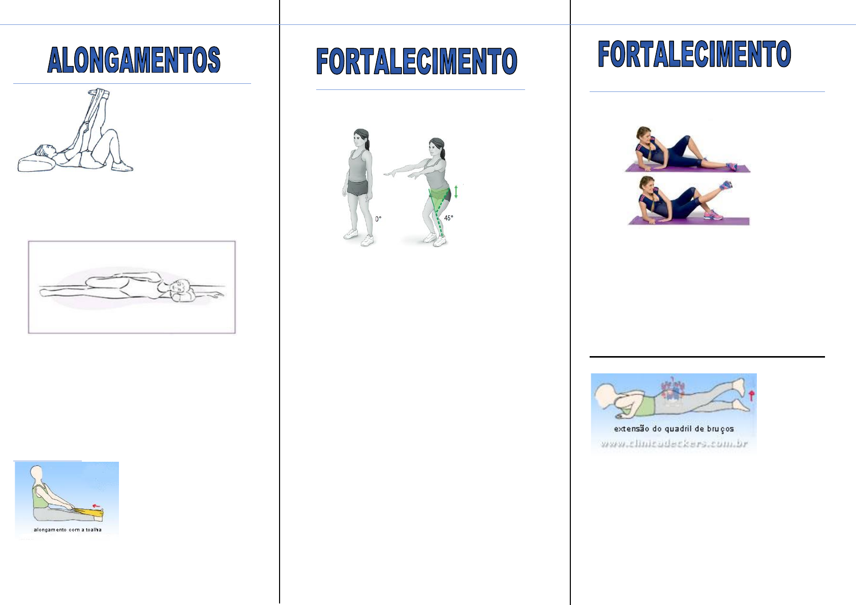 1 4 3 ________________________ _______________________ COM AUXILIO DE UMA TOALHA, MANTER A POSIÇÃO DA IMAGEM POR 30 SEGUNDOS. REPETIR 3X EM CADA PERNA DEITADO DE LADO, PUXAR O PÉ ATÉ ENCOSTAR NO BUMBUM. MANTER POSIÇÃO POR 30 SEGUNDOS 3X EM CADA PERNA. SENTADO, COM AUXILIO DE UMA TOALHA, PUXAR A PONTA DO PÉ EM DIREÇÃO AO ROSTO, ESTICANDO O JOELHO.MANTER 30 SEGUNDOS REPETIR 3X DEITADA DE LADO, A PERNA DE CIMA APOIADA EM UM TRAVESSEIRO, E ELEVAR PERNA DEBAIXO ASSIM COMO NA IMAGEM. REALIZAR 10X O MOVIMENTO. REPEDIR POR 3X EM CADA UMA DAS PERNAS. DEITADA DE BRUÇOS, ELEVAR A PERNA EM SENTIDO PARA TRÁS DESENCOSTANDO A MESMA DA SUPERFÍCIE EM QUE ESTÁ DEITADA. REALIZAR 10X O MOVIMENTO. REPEDIR POR 3X EM CADA UMA DAS PERNAS. MINI AGACHAMENTOS ASSIM COMO MOSTRA NA IMAGEM, AGACHAR JOGANDO O BUM BUM PARA TRÁS COMO SE FOSSE SENTAR EM UMA CADEIRA, DOBRAR O JOELHOS APROXIMADAMENTE 45°. REPETIR 2X 10. NÃO REALIZAR SE SENTIR MUITA DOR. 2 inicio final Fisioterapia - UNIP 2017 GRUPO DE TRATAMENTO JOELHO EXERCÍCIOS PARA JOELHO Fisioterapia 2017 “O CORPO ALCANÇA O QUE A MENTE ACREDITA!” ____________________________________ __ DEITADO, DOBRAR E ESTICAR JOELHO O MAXIMO QUE CONSEGUIR. REPETIR 20X EM CADA. UMA PERNA DOBRADA E OUTRA ESTICADA. ELEVAR A PERNA ESTICADA ATÉ A ALTURA DO OUTRO JOEHO. REALIZAR 3X DE 10 EM CADA PERNA. DEITADO DE LADO, ELEVAR A PERNA DE CIMA ATÉ ALTURA DO QUADRIL. REALIZAR 10X O MOVIMENTO. REPETIR POR 3X EM CADA UMA DAS PERNAS.