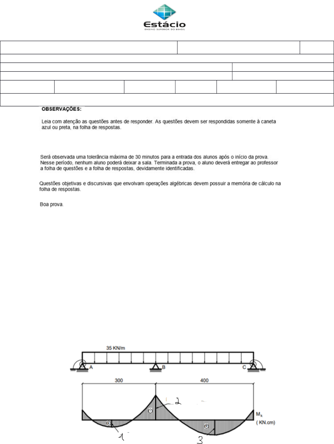 Nome: Matrícula: Unidade: Santa Cruz Preenchido pelo Professor Nome e Código da Disciplina: ESTRUTURAS DE CONCRETO II - CCE0184 Turma: 3012 Professor (a): PAULO CESAR Data da Prova:15/05/2020 Nota Nota por extenso Visto Professor (a) Nota revista Nota por extenso Visto Professor (a) AV1 (X) AV2 ( ) AV3 ( ) Terminada a prova, o aluno deverá entregar ao professor a folha de questões e a folha de respostas,devidamente identificadas. 1. Dimensionar e detalhar as armaduras de flexão da viga contínua da Figura abaixo,admitida com seção transversal constante nos dois vãos : a) M1 = 1000 KN cm (VALOR 2,0 PONTOS) ; b) M2 = 6000 KN cm (VALOR 2,0 PONTOS) ; e c) M3 = 5000 KN cm (VALOR 2,0 PONTOS) bw = 14 cm c= f = 1,4 h = 50 cm C25 s = 1,15 bf = 100 cm CA-50 c = 2,5 cm hf = 8 cm 2. Para o pavimento apresentado na figura abaixo, deseja-se determinar a armadura de flexão da viga central V103, levando em consideração a contribuição da laje. (VALOR 2,0 PONTOS) Dados: C25 ; CA-50 ; c = 2,5 cm c = f = 1,4 ; s = 1,15 par = 13,0 kN/m3 para parede com espessura final de 22 cm e e altura de 2,8 m concr. = 25 kN/m3 3. Determinar a largura efetiva da mesa da viga V2 indicada no esquema abaixo, considerando que a mesma é bi-apoiada, tem vão l = 15,0 m, e está sujeita a uma carga distribuída de 50KN/m. (VALOR 2,0 PONTOS)