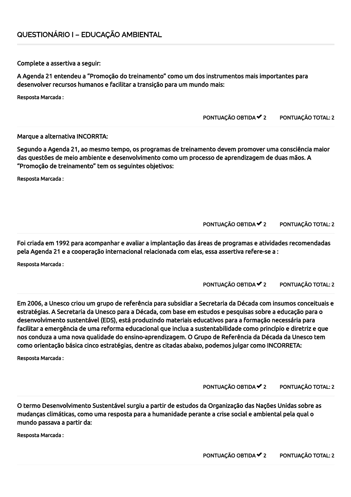 21/05/2020 Course Status – Centro Universitário Faveni https://ava.unifaveni.com.br/course-status/ 1/2 QUESTIONÁRIO I – EDUCAÇÃO AMBIENTAL PONTUAÇÃO TOTAL: 2PONTUAÇÃO OBTIDA 2 Complete a assertiva a seguir: A Agenda 21 entendeu a “Promoção do treinamento” como um dos instrumentos mais importantes para desenvolver recursos humanos e facilitar a transição para um mundo mais: Resposta Marcada : Sustentável PONTUAÇÃO TOTAL: 2PONTUAÇÃO OBTIDA 2 Marque a alternativa INCORRTA: Segundo a Agenda 21, ao mesmo tempo, os programas de treinamento devem promover uma consciência maior das questões de meio ambiente e desenvolvimento como um processo de aprendizagem de duas mãos. A “Promoção de treinamento” tem os seguintes objetivos: Resposta Marcada : Fortalecer a capacidade internacional, particularmente no ensino e treinamento cientí�cos, para permitir que cidadãos, patrões e trabalhadores alcancem seus objetivos de meio ambiente e desenvolvimento e di�cultar a transferência e assimilação de novas tecnologias e conhecimentos técnicos ambientalmente saudáveis e socialmente aceitáveis; PONTUAÇÃO TOTAL: 2PONTUAÇÃO OBTIDA 2 Foi criada em 1992 para acompanhar e avaliar a implantação das áreas de programas e atividades recomendadas pela Agenda 21 e a cooperação internacional relacionada com elas, essa assertiva refere-se a : Resposta Marcada : Comissão de Desenvolvimento Sustentável (CDS) PONTUAÇÃO TOTAL: 2PONTUAÇÃO OBTIDA 2 Em 2006, a Unesco criou um grupo de referência para subsidiar a Secretaria da Década com insumos conceituais e estratégias. A Secretaria da Unesco para a Década, com base em estudos e pesquisas sobre a educação para o desenvolvimento sustentável (EDS), está produzindo materiais educativos para a formação necessária para facilitar a emergência de uma reforma educacional que inclua a sustentabilidade como princípio e diretriz e que nos conduza a uma nova qualidade do ensino-aprendizagem. O Grupo de Referência da Década da Unesco tem como orientação básica cinco estratégias, dentre as citadas abaixo, podemos julgar como INCORRETA: Resposta Marcada : Concretamente, iniciar pela criação e acompanhamento dos trabalhos das comissões internacionais dos continentes. PONTUAÇÃO TOTAL: 2PONTUAÇÃO OBTIDA 2 O termo Desenvolvimento Sustentável surgiu a partir de estudos da Organização das Nações Unidas sobre as mudanças climáticas, como uma resposta para a humanidade perante a crise social e ambiental pela qual o mundo passava a partir da: Resposta Marcada : Segunda metade do século XX. 21/05/2020 Course Status – Centro Universitário Faveni https://ava.unifaveni.com.br/course-status/ 2/2 20 / 20 PONTUAÇÃO TOTAL: 2PONTUAÇÃO OBTIDA 2 Para os governantes, o crescimento econômico gera impostos e uma gestão mais tranquila, pois aumenta a possibilidade de atender às demandas de diversos setores da sociedade, além do fato de que uma economia em crescimento gera menos: Resposta Marcada : Greves e necessidades de recursos para atender desempregados. PONTUAÇÃO TOTAL: 2PONTUAÇÃO OBTIDA 2 A diversidade é um dos aspectos mais fascinantes do mundo vivo. Nos últimos 300 anos, a partir das viagens de exploração – a mais célebre certamente foi a de Darwin a bordo do Beagle – o conhecimento sobre a diversidade da vida cresceu exponencialmente. Fundamentais à sua consolidação foram as teorias sobre a de�nição biológica de espécie. Ainda que não seja um consenso, já que atualmente há diversas de�nições para a espécie, o conceito proposto por Mayr (1999) fundamenta-se em três premissas, EXCETO: Resposta Marcada : A espécie é um grupo de populações individualistas que se reproduzem em grupos diferentes. PONTUAÇÃO TOTAL: 2PONTUAÇÃO OBTIDA 2 A tarefa de apresentar um diagnóstico do estado da biodiversidade brasileira em nível de espécies é gigantesca, considerando sua acentuada riqueza e, ao mesmo tempo, a magnitude daquilo que ainda falta ser conhecido. O estudo mais abrangente até o momento, no que se refere à síntese do conhecimento atual, foi realizado no âmbito do projeto Estratégia Nacional da Biodiversidade, do MMA. A partir de informações obtidas de especialistas nos grupos taxonômicos mais bem conhecidos e catalogados, estimou-se que o país teria, em média, cerca de: Resposta Marcada : 13% do total mundial desses grupos PONTUAÇÃO TOTAL: 2PONTUAÇÃO OBTIDA 2 O isolamento e o cultivo de microrganismos em laboratório respondem também por considerável parcela das inovações nas áreas médica, biotecnológica e ambiental. A despeito de sua importância, há uma signi�cativa defasagem no conhecimento de sua diversidade em relação a outros grupos, tais como animais e plantas superiores. Em nível mundial, estima-se que tenham sido descritos cerca de 5% das espécies estimadas de fungos, 0,1% a 12% dos procariotos (arqueas e bactérias), 31% dos protozoários e de vírus: Resposta Marcada : 4% PONTUAÇÃO TOTAL: 2PONTUAÇÃO OBTIDA 2 Com uma área de aproximadamente 5,5 milhões de km², é a principal cobertura vegetal do Brasil, ocupando 45% do nosso território, além de espaços de mais nove países, sendo também a maior �oresta tropical do mundo. Essas características se referem a: Resposta Marcada : Floresta Amazônica Total