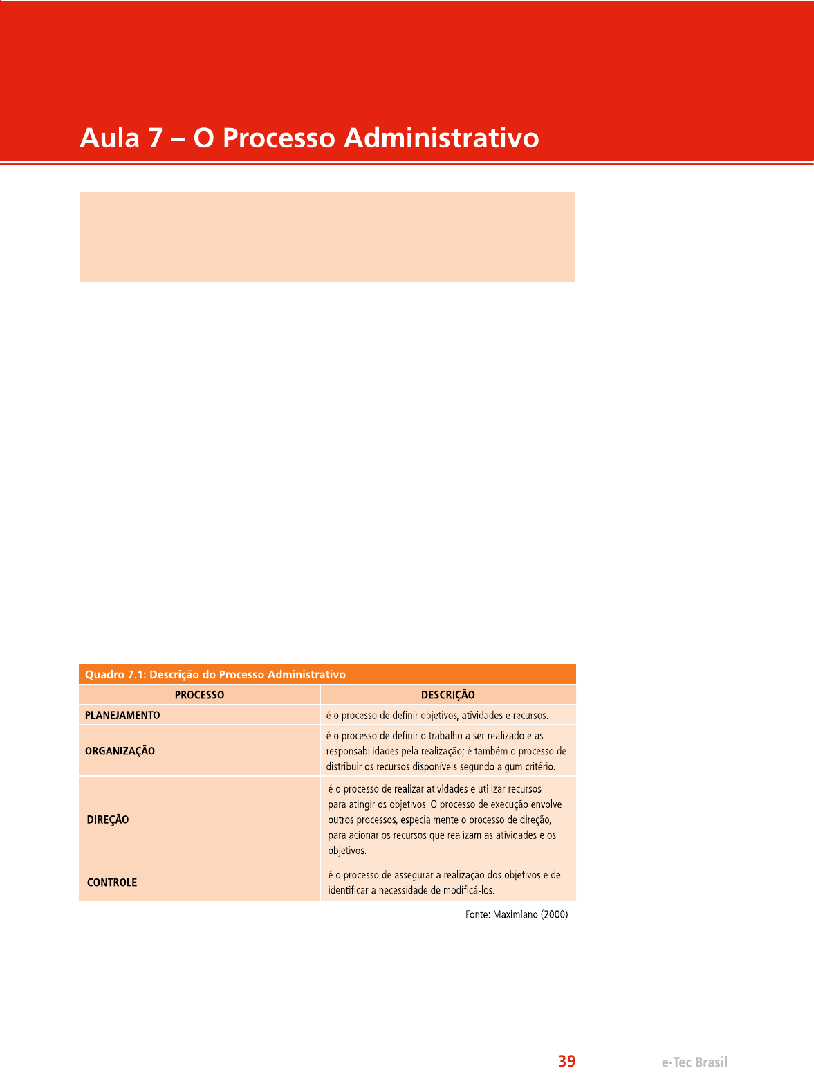 O objetivo desta aula é conhecer o processo administrativo e como ele ocorre dentro das empresas nos mais diferentes níveis organi- zacionais. O cotidiano de um profissional da administração compreende uma série de atividades que são de difícil compreensão, pois em diferentes tipos de em- presas há diversas tarefas que são desempenhadas por estes profissionais. Mas, então, como podemos classificar as suas atividades? O criador da Teoria Clássica da Administração – Henri Fayol foi o primeiro que categorizou o Processo Administrativo como sendo Planejamento, Orga- nização, Coordenação, Comando e Controle, segundo ele, estas atividades seriam comuns a todos os tipos de organizações, sejam elas empresas priva- das, públicas ou de terceiro setor. Anos mais tarde, Peter Drucker atualizou o processo administrativo, sendo aceito até nossos dias como: Planejar, Organizar, Dirigir e Controlar. Observe no quadro 7.1, uma descrição resumida do que vem a ser um processo ad- ministrativo. O processo de planejar é a principal função de um administrador, pois envol- ve a criação de um cenário futuro, sendo a base para tomada de decisões. Quando se aborda a questão da tomada de decisões, devemos lembrar que não há decisão com base no improviso. O planejamento serve justamente para coletar informações do presente e definir os objetivos a longo e médio prazo. No planejamento, são definidas as “estratégias” que a empresa deverá ado- tar para alcançar o resultado desejado. Portanto, a escolha da estratégia é que garante o sucesso ou o insucesso da empresa, por isso planejar é ante- ver o futuro e garantir a tomada de decisão no presente momento. Planejar é o contrário de tomar decisões baseadas no improviso.A possi- bilidade de que os objetivos traçados sejam alcançados é bem maior, pois quando o planejamento não faz parte do dia a dia da empresa, o sucesso de todos fica mais distante. O planejamento se diferencia conforme o tempo de execução, que pode ser estratégico (longo prazo), tático (médio prazo) ou operacional (curto prazo). Vamos conhecer cada um deles somente na nossa próxima aula. Organizar significa reunir todos os recursos organizacionais (humanos, ma- teriais, financeiros e tecnológicos) em função dos objetivos que foram de- terminados na etapa do planejamento. Portanto, organização consiste em sincronizar todos os elementos envolvidos buscando minimizar os esforços e aumentar a eficácia do processo. Esta etapa ocorre logo após o planejamen- to, cuja principal função é mobilizar pessoas, matérias-primas, tecnologias, em busca dos resultados que foram determinados. Deve-se prezar pelo cum- primento dos prazos dos programas que foram definidos, de forma que isto não atrapalhe os resultados finais. Devemos perceber que a organização é uma habilidade muito importante para os gerentes e coordenadores do médio escalão hierárquico, pois esta é uma etapa intermediária entre o planejamento e execução. O processo de direção é quando tudo aquilo que foi planejado e organizado anteriormente entra em AÇÃO. Vale ressaltar que os administradores devem estar à frente das etapas para garantir o sucesso do processo administrativo. Dirigir significa coordenar e comandar todas as pessoas dos demais recursos, e que agora estão sendo efetivamente executados. Esta execução é a etapa operacional do processo administrativo pois envolve todos os funcionários, e aí a Liderança é um fator chave para o alcance dos resultados propostos. O líder deve ser um conciliador dos interesses entre empregados e empregado- res; deve ter conhecimento amplo das normas da empresa, da relação com os demais envolvidos, ter diálogo eficiente e, principalmente, motivar todos os funcionários na execução do trabalho. Também se destaca a coordenação como parte do processo administrati- vo. Aquele que coordena busca o equilíbrio entre o custo e o benefício das ações, ficando atento a todas as decisões tomadas, pois elas é que acarreta- rão em consequências positivas ou negativas. Desta forma, o administrador é o responsável final pelo trabalho de sua equipe. Depois que a etapa da Direção está acontecendo, o administrador passa a controlar os resultados alcançados comparando com o que foi planejado no início do processo administrativo. Este controle é a verificação de que tudo ocorreu de acordo com as ordens e as regras estabelecidas pela empresa na etapa do Planejamento. Devemos perceber que muitas vezes há excesso de planejamento e falta de controle. Por isso, quando o profissional estiver planejando, organizando e dirigindo qualquer tipo de atividade em seu trabalho, lembre-se de criar me- canismos claros, rápidos e eficazes para a elaboração do controle. É a partir do controle que o profissional consegue enxergar a eficácia do processo administrativo, seja uma pequena atividade do dia a dia de trabalho, ou um grande projeto a ser implantado e operacionalizado por meio do Processo Administrativo. É uma ferramenta de verificação do sucesso ou do fracasso de um processo administrativo. O se aplica ao final do processo administrativo, uti- lizando as informações do controle, ou seja, do final do ciclo e comparando com aquilo que foi planejado. Assim, o funciona como uma flecha que liga o fim do processo ao início dele. E isto quer dizer que um processo deve ser cíclico, pois quando o é utilizado constantemente a ponto de torná-lo um hábito, é possível buscar a melhoria contínua nos proces- sos. O permite ainda avaliar todas as etapas do processo, desde o planejamento, a organização e a direção, e assim detectar onde residem as falhas. Tal análise não permitirá mais que os erros façam parte do processo. E agindo desta forma, está se implantando um programa de melhoria con- tínua, por meio da utilização do . Também utilizamos o para dar um retorno sobre a produtividade, as atitudes e o co