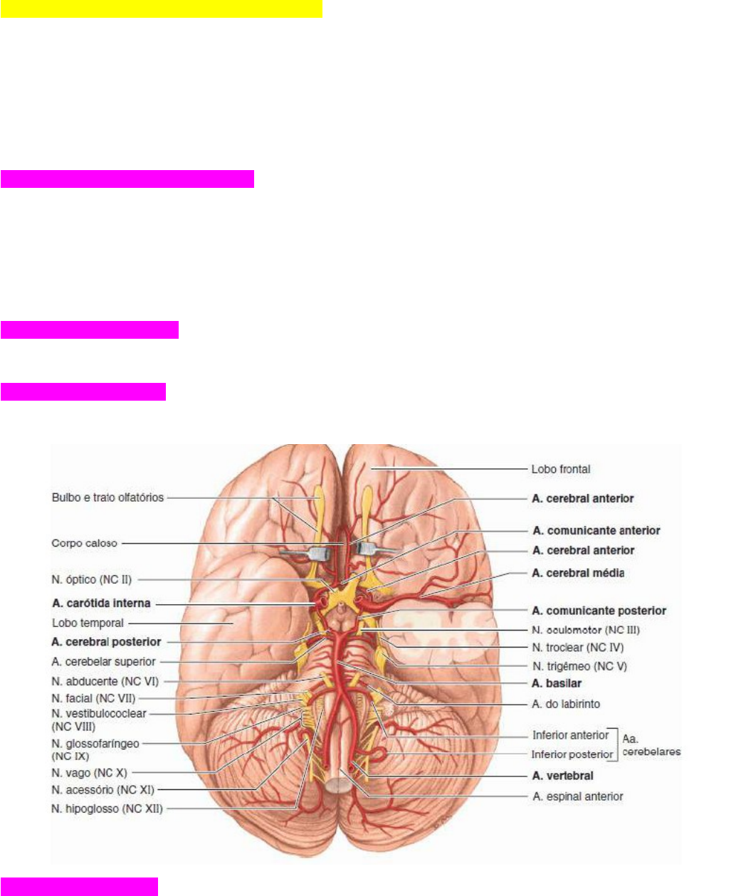 AULA 1 MÓDULO 2 Identificar a anatomia da abóboda craniana Seios Venosos Cerebrais Os seios venosos da dura-máter (ou cerebrais) são espaços revestidos por endotélio entre as lâminas periosteal e meníngea da dura. Formam-se nos locais onde os septos durais se fixam ao longo da margem livre da foice do cérebro e em relação às formações do assoalho do crânio. Grandes veias da superfície do encéfalo drenam para esses seios e a maior parte do sangue do encéfalo drena finalmente através deles para as VJI. Arteria Meningea Média e Anterior A artéria meníngea média, é um ramo da artéria maxilar. Entra no assoalho da fossa média do crânio através do forame espinhoso, segue lateralmente na fossa, e vira-se em sentido superoanterior sobre a asa maior do esfenoide, onde se divide em ramos anterior e posterior. A artéria se divide em dois ramos: anterior e posterior. O ramo anterior irriga a região parietal e a região occipital. O ramo posterior irriga a região temporal. Artéria cerebral anterior Irrigam a maior parte das faces medial e superior do encéfalo e o polo frontal Artéria cerebral média Irrigam a face lateral do encéfalo e o polo temporal Camadas do Escalpo As camadas de 1 a 5 constituem o escalpo, sendo que as três primeiras – pele, tecido conectivo subcutâneo e aponeurose – estão intimamente ligadas. Pele: fina, exceto na região occipital, contêm glândulas sudoríparas e sebáceas e folículos pilosos; especialmente no crânio possui um abundante suprimento arterial e boa drenagem venosa e linfática. A sua irrigação arterial é tão importante que cortes mais profundos produzidos por alguns ferimentos podem causar a perda de grandes volumes de sangue; Tecido conectivo subcutâneo: rica em vasos e nervos cutâneos; Aponeurose: uma lâmina tendínea resistente que cobre o crânio entre os músculos occipital, auricular superior e frontal; Tecido conectivo frouxo: camada semelhante a uma esponja em função de seus muitos espaços potenciais e que permite o movimento do escalpo propriamente dito sobre o crânio; Pericrânio: uma lâmina compacta de tecido conectivo firmemente aderido ao crânio, formando o periósteo externo; Crânio: subdividido em um teto, semelhante a uma abóboda, denominada calvária, e a base craniana. O neurocrânio, denominação dada à porção do crânio que contém o encéfalo, constitui-se dos ossos frontal, dois parietais, dois temporais, occipital, esfenoide e etmoide; Meninges: são três as meninges cranianas, responsáveis pela proteção e sustentação do cérebro no crânio: dura-máter, aracnoide-máter e pia-máter. Enquanto a primeira é mais rígida, a segunda contém o chamado espaço subaracnoideo, preenchido por líquido cefalorraquidiano e numerosos vasos sanguíneos. A última meninge, por sua vez, encontra-se aderida ao córtex cerebral. Inervação da Dura-máter: A dura-máter recebe inervação sensitiva do nervo trigêmeo na fossa anterior e média e de ramos dos nervos cranianos olfatório, oculomotor, vago e hipoglosso. Identificar a anatomia dos nervos cranianos Nervos cranianos são os que fazem conexão com o encéfalo. Os 12 pares de nervos cranianos recebem uma nomenclatura específica, sendo numerados em algarismos romanos, de acordo com a sua origem aparente, no sentido rostrocaudal. Eles estão ligados com o córtex do cérebro pelas fibras corticonucleares que se originam dos neurônios das áreas motoras do córtex, descendo principalmente na parte genicular da cápsula interna até o tronco do encéfalo. Os nervos cranianos sensitivos ou aferentes originam-se dos neurônios situados fora do encéfalo, agrupados para formar gânglios ou situados em periféricos órgãos dos sentidos. Os núcleos que dão origem a dez dos doze pares de nervos cranianos situam-se em colunas verticais no tronco do encéfalo e correspondem à substância cinzenta da medula espinhal. De acordo com o Componente Funcional, os nervos cranianos podem ser classificados em Motores, Sensitivos e Mistos. Os Motores (puros) são os que movimentam o olho, a língua e acessoriamente os músculos látero-posteriores do pescoço. São eles: III – Nervo Oculomotor, IV – Nervo Troclear, VI – Nervo Abducente: São nervos motores que penetram na órbita pela fissura orbital superior, distribuindo-se aos músculos extrínsecos do bulbo ocular, que são os seguintes: elevador da pálpebra superior, reto superior, reto inferior, reto medial, reto lateral, oblíquo superior, oblíquo inferior. Todos estes músculos são inervados pelo oculomotor, com exceção do reto lateral e do oblíquo superior, inervados respectivamente, pelos nervos abducente e troclear. As fibras que inervam os músculos extrínsecos do olho são classificadas como eferentes somáticas. O nervo oculomotor nasce no sulco medial do pedúnculo cerebral; o nervo troclear logo abaixo do colículo inferior; e o nervo abducente no sulco pontino inferior, próximo à linha mediana. Os três nervos em apreço se aproximam, ainda no interior do crânio, para atravessar a fissura orbital superior e atingir a cavidade orbital, indo se distribuir aos músculos extrínsecos do olho. O nervo oculomotor conduz ainda fibras vegetativas, que vão à musculatura intrínseca do olho, a qual movimenta a íris e a lente. XI – Nervo Acessório: Formado por uma raiz craniana e uma espinhal. A raiz espinhal é formada por filamentos que emergem da face lateral dos cinco ou seis primeiros segmentos cervicais da medula, constituindo um tronco que penetra no crânio pelo forame magno. A este tronco unem-se filamentos da raiz craniana que emergem do sulco lateral posterior do bulbo. O tronco divide-se em um ramo interno e um externo. O interno une-se ao vago e distribui-se com ele, e o externo inerva os músculos trapézio e esternocleidomastoideo. XII – Nervo Hipoglosso: Nervo essencialmente motor. Emerge do sulco lateral anterior do bulbo sob a forma de filamentos