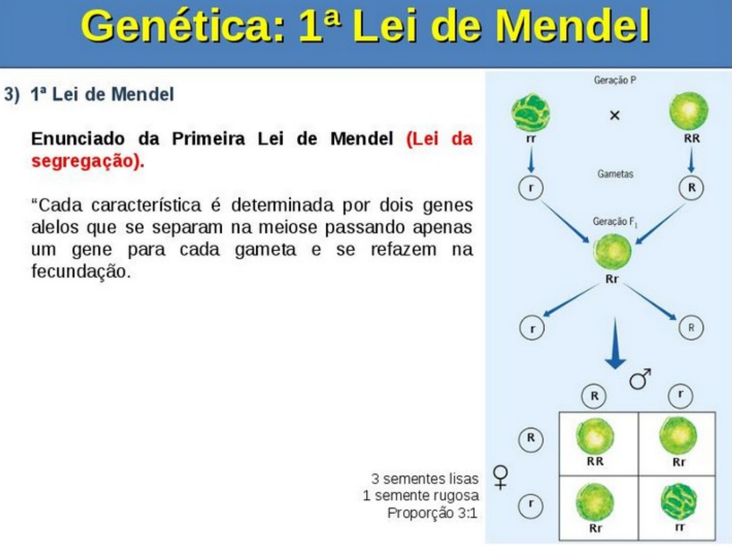 Características humanas que obedecem á primeira lei de Mendel Revisando 1- (Unifor-CE) Um estudante, ao iniciar o curso de Genética, anotou o seguinte: I. Cada caráter hereditário é determinado por um par de fatores e, como estes se separam na formação dos gametas, cada gameta recebe apenas um fator do par. II. Cada par de alelos presentes nas células diploides separa-se na meiose, de modo que cada célula haploide só recebe um alelo do par. III. Antes da divisão celular se iniciar, cada molécula de DNA se duplica e, na mitose, as duas moléculas resultantes se separam, indo para células diferentes. A primeira lei de Mendel está expressa em: a) I, somente. b) II, somente. c) I e II, somente. d) II e III, somente. e) I, II e III. 2- Sabemos que o albinismo é uma anomalia genética recessiva em que o indivíduo portador apresenta uma deficiência na produção de melanina em sua pele. Se um rapaz albino se casa com uma menina que produz melanina normalmente, porém que possui mãe albina, qual é a probabilidade de o filho do casal nascer albino? a) 100%. b) 75%. c) 50%. d) 25%. e) 0%. 3- De acordo com a primeira lei de Mendel confira as afirmações abaixo e marque a que apresentar informações incorretas. a) Em cada espécie de ser vivo o número de cromossomos é constante, e isso ocorre porque na formação dos gametas esse número é reduzido à metade e depois, na fecundação, restabelece-se o número inicial. b) Cada caráter é determinado por um par de fatores que se separam na formação dos gametas, indo um fator do par para cada gameta. c) Quando os alelos de um par são iguais, fala-se em condição heterozigótica (para a qual Mendel usava o termo puro), e quando os alelos são diferentes, fala-se em condição homozigótica (para a qual Mendel usava o termo hibrido). d) Um mesmo caráter pode apresentar duas ou mais variáveis, e a variável de cada caráter é denominada fenótipo. e) O termo genótipo pode ser aplicado tanto ao conjunto total de genes de um indivíduo como a cada gene em particular. 4- Considere as seguintes afirmações sobre alguns conceitos fundamentais utilizados em genética. I - Alelo recessivo é aquele inibido pela ação de outro alelo, denominado dominante. II - Cromossomos homólogos são os que apresentam genes que codificam as mesmas características e que pareiam durante a meiose. I I I - Genótipo é a descrição da constituição genética de um organismo; é um conceito relativo a um determinado gene ou a um conjunto de genes. Quais estão corretas? (A) Apenas I I . (B) Apenas I e I I (C) Apenas I e I I I . (D) Apenas II e I I I . (E) I, II e III. 5- (UFMT – mod.) Leia as afirmações abaixo relativas à transmissão dos caracteres na reprodução sexuada. I – Os caracteres são transmitidos dos pais para os filhos devido a informações contidas no sangue dos pais, que se concentram no esperma do homem e nas excreções vaginais da mulher. II – Os caracteres são transmitidos dos pais para os filhos devido a informações contidas no interior das células reprodutoras masculinas e femininas, chamadas gametas, que se unem na fecundação. III – Os cromossomos existem aos pares nas células e os genes ocupam um lugar definido no cromossomo, chamado locus gênico, assim, os genes também existem aos pares. Os pares de cromossomos semelhantes são chamados cromossomos homólogos, e os pares de genes que ocupam um mesmo locus nestes cromossomos são chamados genes alelos. Das afirmações acima está (estão) correta (s): a) I, apenas b) II e III, apenas c) III, apenas d) II, apenas e) I, II e III. Resposta Questão 1 Alternativa “c”. A primeira lei de Mendel diz respeito à separação dos fatores hereditários na formação dos gametas, sendo assim somente a afirmação I e II diz respeito a essa lei. Resposta Questão 2 Alternativa “c”. Se fizermos um cruzamento entre um indivíduo aa e um Aa, teremos: 50% Aa e 50% aa, ou seja, 50% púrpura e 50% amarelo. Observe: Observe que 50% dos descendentes apresentam coloração amarela. Se fizermos um cruzamento entre um indivíduo Aa e um Aa, teremos: 25% AA, 50% Aa e 25% aa, ou seja, 75% púrpura e 25% amarelo. Observe: Observe que apenas 25% dos descendentes possuem coloração amarela. Diante disso, podemos concluir que os únicos indivíduos Aa nos cruzamentos mostrados na tabela são o II e o IV. Resposta Questão 3 letra c Quando os alelos de um par são iguais, fala-se em condição homozigótica(para a qual Mendel usava o termo puro), e quando os alelos são diferentes, fala-se em condição heterozigótica (para a qual Mendel usava o termo híbrido). Resposta Questão 5 letra b A alternativa I está errada porque os caracteres dos pais são transmitidos aos filhos através de informações contidas nos gametas (espermatozoide e óvulo) do pai de da mãe.