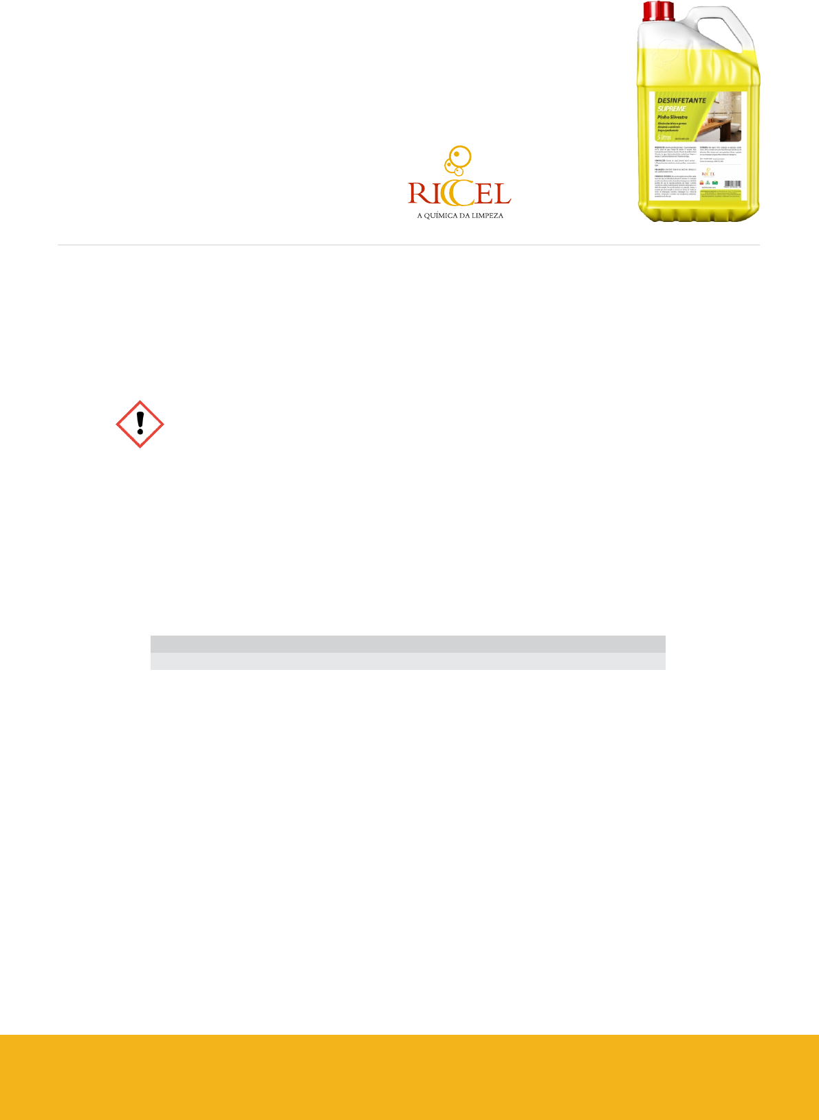 Nome do fabricante: RICEL PRODUTOS DE LIMPEZA LTDA. MS: 3.02662.5 Endereço: Rua Madre de Deus, 689 - São Paulo - SP - CEP: 03119-000 FONE DE EMERGÊNCIA: (11) 2607-6363 Produto/�nalidade: LIMPADOR DESINFETANTE Precaução: P333 + P313 Em caso de irritação ou erupção cutânea: consulte um médico Sensibilização à pele - Categoria 1 Pictograma: Corrosão/Irritação à pele - Categoria 3 SEÇÃO 5 – Medidas de combate a incêndio SEÇÃO 2 – Identi�cação dos perigos Palavra de advertência: ATENÇÃO 5.2 RISCOS ESPECIAIS RESULTANTES DA SUBSTÂNCIA OU DA MISTURA 5.3 PRECAUÇÕES PARA BOMBEIROS EQUIPAMENTOS ESPECIAIS PARA PROTEÇÃO DAS PESSOAS ENVOLVIDAS NO COMBATE A INCÊNDIO. Frases de perigo: H316 Provoca irritação moderada à pele Caracterização química CORPO – Remover as roupas, lavar as partes afetadas e havendo irritação, procurar um médico. Este material é uma mistura. Resposta à emergência: P362 + P364 Retire toda a roupa contaminada e lave-as antes de usá-las novamente MÃOS – Lavar com água e sabão. INALAÇÃO – Remover a pessoa para um lugar fresco e ventilado. INGESTÃO – Não provocar vômito, beber água e procurar um médico. Produto/identi�cação: DESINFETANTE SUPREME PINHO SILVESTRE H317 Pode provocar reações alérgicas na pele SEÇÃO 1 - Identi�cação PRODUTO % em Peso C.A.S. nº SEÇÃO 4 –Medidas de primeiros socorros Disposição: - SEÇÃO 3 – Composição e informações sobre os ingredientes Armazenamento: - Cloreto de Alquil diMetil Benzil Amônio 2,9 61789-71-7 OLHOS – Lavar com água por 15 minutos, se a irritação persistir, procurar um médico. Sintomas e efeitos mais importantes, agudos ou tardios - O tratamento sintomático deve compreender medidas de suporte como correção de distúrbios médicos hidroeletrolíticos e metabólicos. Notas para médico – O tratamento sintomático deve compreender medidas de suporte como correção de distúrbios médicos hidroeletrolíticos e metabólicos. 5.1 MEIOS DE EXTINÇÃO MEIOS ADEQUADOS DE EXTINÇÃO - Água - água nebulizada Agentes de extinção inadequados - Nenhum(a). - A decomposição produz liberação de oxigênio que pode agravar incêndios. - Favorece a combustão de materiais combustíveis. - Risco de explosão se aquecido em ambiente fechado. - Usar equipamento de respiração autônomo em casos de incêndio. - Usar equipamento de proteção individual. - Usar vestuário resistente a produtos químicos. Informações complementares. - Manter o produto e embalagens vazias afastados do calor e de fontes de ignição. - Resfriar contêineres e arredores com água pulverizada. - Aproximar-se contra o vento. - Evitar a contaminação da água de superfície e da água subterrânea com a água de combate a incêndios. DESINFETANTE SUPREME Pinho Silvestre FICHA DE INFORMAÇÕES DE SEGURANÇA DE PRODUTOS QUÍMICOS (CONFORME - NBR 14725:2014) N° 111 DESINFETANTE SUPREME PINHO SILVESTRE - Nº de registro: 3.2662.0009.001-3 · Atualizada em 20 de Junho de 2018 · Página 1 de 3 FABRICADO POR: Ricel Produtos de Limpeza Ltda. - Rua Madre de Deus, 689 - Moóca - SP CEP: 03119-000 Responsável Técnico: Daniel Graciotti Pistori - CRQ. Nº 04.449.280 - IV Região - CNPJ 02.549.960/0001-30. SEÇÃO 6 – Medidas de controle para derramamento ou vazamento PRECAUÇÕES PESSOAIS Para o pessoal que não faz parte do serviço de emergência: Não toque nos recipientes dani�cados ou no material derramado sem o uso de Equipamentos de Proteção Individual (EPI) conforme descrito na seção 8 deste documento. Para o pessoal de serviço de emergência: Utilizar EPI completo, óculos de proteção contra respingos, em casos extremos, proteção facial, luvas de proteção adequada, avental em PVC ou em borracha, vestuário protetor (PVC ou outro material equivalente), botas em borracha ou em PVC . Precauções com o meio ambiente: Evite que o produto derramado atinja cursos d'água, rede de esgotos e vegetação. Atuar em conformidade com a legislação local. Passos a serem seguidos em caso de vazamento ou derrame do material: Conter o derrame e isolar a área. Absorver pequenos derrames com areia, argila ou terra. Recolher e colocar os resíduos recuperados em recipientes adequados para reciclar ou eliminar. SEÇÃO 7 – Manuseio e armazenamento MANUSEIO ESPECIFICAÇÕES DOS EQUIPAMENTOS DE PROTEÇÃO INDIVIDUAL Condições adequadas: CONSERVE FORA DO ALCANCE DAS CRIANÇAS E DOS ANIMAIS DOMÉSTICOS. Mantenha o produto em sua embalagem original adequadamente fechada, em local Respirador: não necessário Alcalinidade Isento Luvas: de borracha seco e fresco. ocupacionalmente expostos. SEÇÃO 9 – Propriedades físico-químicas Estado Físico Líquido Ponto de Ebulição (C) > 98ºC PRESSÃO DE VALOR (mmHg) N.A. Condições que devem ser evitadas: Temperaturas elevadas. contaminado antes de entrar nas áreas de alimentação. Taxa de Evaporação (Água=1) N.A. Outros: não necessário Ponto de Congelamento © 0ºC pH (dil.) Sol. A 1% 7 +/- 0,5 Medidas de controle de engenharia: Não estabelecido. Medidas de higiene: Lave as mãos e o rosto cuidadosamente após o manuseio e antes de comer, beber, fumar ou ir ao banheiro. Remova a roupa e o equipamento de proteção Limites de exposição ocupacional: Com práticas de trabalho adequadas, medidas de higiene e precauções de segurança é improvável que o uso do produto apresente perigos para aqueles ARMAZENAMENTO Prevenção de incêndio e explosão: Não é esperado que o produto apresente risco de incêndio ou explosão. Materiais seguros para embalagem: Embalagens plásticas. Métodos de eliminação dos resíduos: Para destinação �nal, proceder conforme a Seção 13 desta FISPQ. Prevenção de exposição do trabalhador: Proteção Individual (EPI) conforme descrito na seção 8 deste documento. Precauções e orientações para o manuseio seguro: LEIA ATENTAMENTE O RÓTULO ANTES DE USAR O PRODUTO. SEÇÃO 8 
