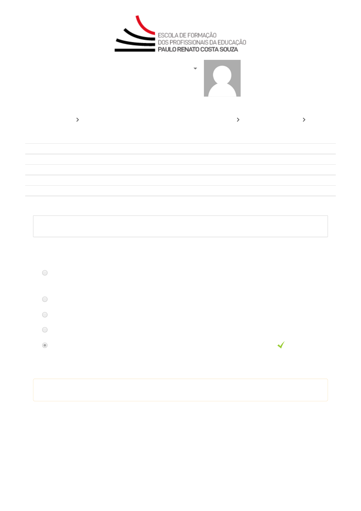 31/07/2019 6.1. Questões objetivas avaefap.escoladeformacao.sp.gov.br/mod/quiz/review.php?attempt=4096577 1/22 Iniciado em quarta, 31 Jul 2019, 15:15 Estado Finalizada Concluída em quarta, 31 Jul 2019, 15:43 Tempo empregado 27 minutos 58 segundos Notas 20,00/20,00 Avaliar 100,00 de um máximo de 100,00 Questão 1 Correto Atingiu 1,00 de 1,00 Sobre o Acolhimento, podemos dizer: a. É focado apenas no 6º ano do Ensino Fundamental e na 1ª série do Ensino Médio. b. Acontece apenas na primeira semana do ano. c. É opcional. d. Não se relaciona com o Projeto de Vida dos estudantes. e. Deve contar com atividades realizadas de estudante para estudante. Correto. Os estudantes devem ser protagonistas no Acolhimento. Sua resposta está correta. Página principal Formação Básica: Projeto de Vida - 1ª Edição/2019 Questões objetivas 6.1. Questões objetivas Ricardo Cezarino http://www.escoladeformacao.sp.gov.br/ http://avaefap.escoladeformacao.sp.gov.br/user/view.php?id=60857&course=599 http://avaefap.escoladeformacao.sp.gov.br/ http://avaefap.escoladeformacao.sp.gov.br/course/view.php?id=599 http://avaefap.escoladeformacao.sp.gov.br/mod/quiz/view.php?id=100791 31/07/2019 6.1. Questões objetivas avaefap.escoladeformacao.sp.gov.br/mod/quiz/review.php?attempt=4096577 2/22 Questão 2 Correto Atingiu 1,00 de 1,00 Considerando uma situação hipotética em que você busca promover o desenvolvimento da competência de autogestão de estudantes no componente Projeto de Vida, podemos a�rmar que: I. Ler um texto sobre o que é autogestão juntamente com os estudantes é uma forma ativa de estimular o desenvolvimento dessa competência. II. Abordar em uma única aula de Projeto de Vida cinco competências diferentes, entre elas a autogestão, é uma forma de intensi�car o desenvolvimento dessa competência. III. Estimular os estudantes a construírem uma agenda na qual organizem as atividades de estudo que precisam realizar ao longo da semana, como forma intencional e explícita de desenvolver a autogestão, é uma estratégia e�ciente. Escolha a alternativa correta: a. Apenas I é verdadeira. b. Apenas III é falsa. c. Apenas I é falsa. d. Apenas III é verdadeira. Correto. A a�rmativa III é verdadeira, pois na proposição de construção de uma agenda coletiva, observam-se o estímulo à participação ativa dos estudantes e o foco na autogestão, bem como a intencionalidade e a explicitação da competência que está sendo trabalhada. e. Apenas II é verdadeira. Sua resposta está correta. 31/07/2019 6.1. Questões objetivas avaefap.escoladeformacao.sp.gov.br/mod/quiz/review.php?attempt=4096577 3/22 Questão 3 Correto Atingiu 1,00 de 1,00 Para construir seu projeto de vida, o estudante tem a necessidade de ir além da elaboração de um plano. Considerando isso, faça uma associação entre as de�nições na coluna da esquerda e as sentenças na coluna da direita. Desenvolver a capacidade de mobilizar, articular e colocar em prática conhecimentos, valores, atitudes e habilidades para se relacionar consigo mesmo e com os outros. Consciência de si e melhor relacionamento com os outros. 31/07/2019 6.1. Questões objetivas avaefap.escoladeformacao.sp.gov.br/mod/quiz/review.php?attempt=4096577 4/22 A construção do projeto de vida é uma tarefa para a vida inteira, porque ela parte de um ponto, que é o autoconhecimento, e focaliza outro ponto, que é aonde se deseja chegar. Mas, se o projeto de vida é a experiência da autorrealização, e esta não é um �m, e sim um processo, então “chegar lá”, na realização dos sonhos, não pode ser um �m, mas algo que inclusive deverá ser objeto de revisões periódicas. Nessas revisões, nos submetemos a um processo re�exivo de análise consciente e individual sobre se as decisões que tomamos foram satisfatórias e se é chegada a hora de tomar outras decisões ou não. Tomar decisões e defendê-las com assertividade. 31/07/2019 6.1. Questões objetivas avaefap.escoladeformacao.sp.gov.br/mod/quiz/review.php?attempt=4096577 5/22 O caminho entre “ser e querer ser”, e não “com o que se quer ser”. A questão aqui é garantir que o projeto de vida seja a construção do caminho para a concretização dos sonhos – sonhos que mudam e mudam o querer ser. Assim, o projeto de vida é saber fazer escolhas diante das oportunidades para o querer ser. Intensi�car os processos de re�exão para planejar. Projetar a vida com base em uma visão que se constrói do próprio futuro é essencial para todo ser humano. As pessoas que constroem uma imagem a�rmativa, ampliada e projetada no futuro e atuam sobre ela têm mais possibilidade de concretizá-la do que aquelas que meramente sonham e não conseguem projetar de forma nítida o que pretendem fazer na vida nos anos que virão. Ampliar repertório sobre suas possibilidades para o futuro. 31/07/2019 6.1. Questões objetivas avaefap.escoladeformacao.sp.gov.br/mod/quiz/review.php?attempt=4096577 6/22 Ter foco, responsabilidade, precisão, organização e perseverança com relação a compromissos, tarefas e objetivos estabelecidos para a vida. Gestão do próprio tempo e organização pessoal. Desenvolver a iniciativa social, a motivação e a abertura para interações sociais. Fortalecer o senso de compromisso com a comunidade. Sua resposta está correta. Questão 4 Correto Atingiu 1,00 de 1,00 Considerando a relação entre o desenvolvimento de competências cognitivas e socioemocionais dos estudantes e os marcos legais brasileiros, é correto a�rmar que: a. A ideia do desenvolvimento de competências é incipiente, não tendo respaldo na legislação brasileira nem na paulista. b. As dez competências gerais da Base Nacional Comum Curricular (BNCC) articulam aspectos cognitivos e socioemocionais. Correto. As Competências Gerais da Educação Básica, de�nidas na Base Nacional Comum Curricular (BNCC) articulam aspectos cognitivos e socioemocionais. c. A Base Nacional Comu