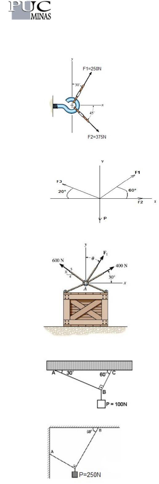 Pontifícia Universidade Católica de Minas Gerais – PUC Minas Instituto Politécnico – IPUC Curso de Graduação em Engenharia Mecânica Exercícios de Análise Estrutural Data 03/03/2020 Prof.: Márcio Martins 1) Determine a força resultante do sistema abaixo: 2) Determine a força resultante do sistema abaixo: Dados: F1=1500N; F2=750N; F3=1200N; P=600N 3) Determine a força resultante do sistema abaixo: Dados: F1=500N; =20° 4) Determine a tensão nos cabos “AB” e “BC”: 5) Determine a tensão nos cabos “AP” e “BP”: 6) Determine a tensão nos cabos “AC” e “BC”: 7) A força “P” está aplicada a uma pequena polia que rola sobre o cabo ACB. Sabendo que a tração em ambas as partes do cabo é 750N, determine a intensidade, direção e sentido de “P”. 8) No diagrama abaixo, P=400N, W=50N, e d=0,5m. Determine o valor de “h”, para que haja equilíbrio. NOTA: desprezar o diâmetro das roldanas. 9) Um colar pode deslizar em uma barra vertical e está submetido a três forças, conforme ilustração abaixo. Determine o sentido e a direção da força “F”, sabendo que a resultante é horizontal. a) F=2,40kN; b) F=1,4kN 10) Na figura a seguir, uma esfera rígida se encontra em equilíbrio, apoiada em uma parede vertical e presa por um fio (inextensível). Sendo P o peso da esfera e 2P a força máxima que o fio suporta, qual é o ângulo formado entre a parede e o fio? 11) Uma pequena esfera foi pendurada ao teto da sala de aula, conforme esquema abaixo. Em um dos fios foi montado um dinamômetro e este marcou 10N. Calcule o peso da esfera. 12) Três blocos A,B,C, sendo que os blocos A e B possuem a mesma massa de 5kg. Os blocos estão pendurados no teto conforme esquema a seguir e se encontram em equilíbrio. Sabendo que o ângulo =90°, determine o valor da massa do bloco C: 13) Determine a força de atrito entre a massa M1 e o solo e a massa M2, conforme os dados a seguir: Dados:M1=5kg; M2=10kg; g=10m/s2; desprezar o atrito da roldana. 14) No esquema abaixo o homem exerce uma força de 120N, determine a força no outro cabo e dos ângulos, se o objeto pesa 105N. 15) Determine as forças necessárias nos cabos AC e AB, na figura abaixo para manter a esfera D de 20kg em equilíbrio. Dados: F=300N; d=1,0m 16) Determine as forças necessárias nos cabos, na figura abaixo para manter o tubo de 30kg em equilíbrio.