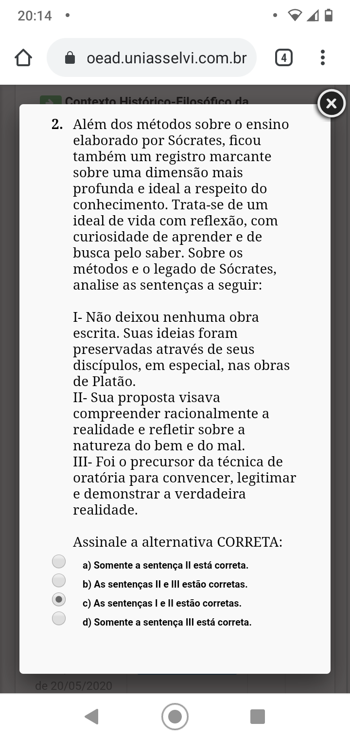 Alem dos metodos sobre O ensino elaborado por Socrates, ficou tambem um registro marcante sobre uma dimensao mais profunda e ideal a respeito do conhecimento. Trata-se de um ideal de vida com reflexao, com curiosidade de aprender e de busca pelo saber. Sobre metodos e legado de Socrates, analise as sentencas a seguir: Assinale a alternativa CORRETA: I- Nao deixou nenhuma obra escrita. Suas ideias foram preservadas atraves de seus discipulos, em especial, nas obras de Platao. II- Sua proposta visava compreender racionalmente a realidade e refletir sobre a natureza do bem e do mal. III- Foi O precursor da tecnica de oratoria para convencer, legitimar e demonstrar a verdadeira realidade. a) Somente a sentenca II esta correta. b) As sentencas II e III estao corretas. c) As sentencas I e II estao corretas. d) Somente a sentenca III esta correta.
