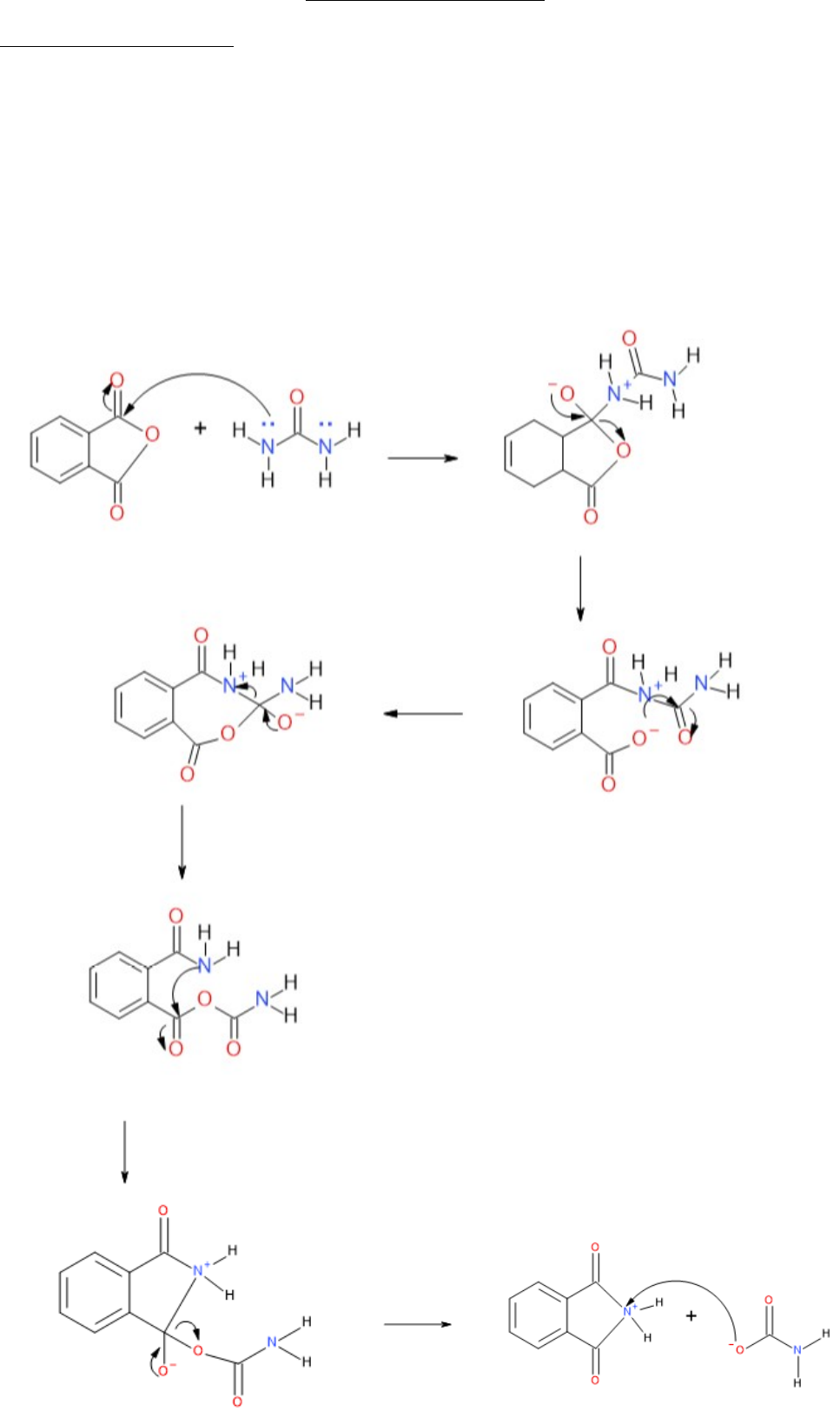 Obtenção da Ftalimida 4- Resultados e Discussões O mecanismo abaixo representa o esquema de intermediários para a síntese da ftalimida. O nitrogênio da molécula de ureia (possui par de elétrons livres) ataca a molécula de anidrido ftálico no carbono carbonílico. Esse carbono carbonílico está em um anel de cinco membros tensionado. Há o rompimento da ligação ∏(pi) e deslocamento da carga negativa para o átomo de oxigênio. Após esta etapa há a geração de um intermediário tetraédrico. A carga negativa no oxigênio da ureia recompõe a duplicidade da ligação c-o. O nitrogênio da ureia tenta reestabelecer o anel de cinco membros com isso eliminando um subproduto carregado negativamente no oxigênio que captura um hidrogênio da molécula de produto e com isso formando a ftalimida, o gás carbônico e a amônia. CO2 NH2 A ftalimida pode ser sintetizada de forma muito simples, prática e econômica. Sua síntese não necessita de solventes (já que a reação se da entre dois sólidos) por isto é considerada um processo verde. É feita uma mistura de anidrido ftálico com uréia, e esta mistura é transferida para um balão com um orifício na tampa para que os gases provenientes da reação possam ser liberado evitando assim que a pressão aumente no interior do balão e ocorra explosões. No início da prática, misturamos a ureia com o anidrido ftálico em um gral de forma que a cinética da reação fosse favorecida devido ao aumento da área de contato já que estávamos lidando com reagentes sólidos. Durante o aquecimento, a temperatura deve ser mantida entre a faixa de temperatura que compreende a 150°C - 200°C. Aumentos muito consideráveis além desse limite máximo de temperatura podem superaquecer o sistema gerando acidentes ou até mesmo a carbonização do produto gerado. Durante o aquecimento observamos a formação de estalactites de produto nas paredes e na tampa do balão. Conforme citado anteriormente, esta reação é considerada um processo verde sendo que o único fator negativo é a liberação de amônia gasosa que pode ser contornado por sistemas de exaustores. Quanto ao rendimento da reação, não foi possível realizar o cálculo visto que é necessário que ocorra tempo hábil para a secagem dos cristais. Como esta foi a última prática não foi possível fazer esta medição. 5- Questionário 1) Explique a necessidade deste tipo de vedação. A tampa do balão de vidro deve ser de vedação frouxa e com uma cortiça furada para que a liberação dos gases formados durante a reação seja possível para que a pressão no interior do balão não aumente de forma a não ocorrer explosões altamente perigosas. 2) O que ocorre com a mistura de sólidos no balão quando o banho de óleo atinge a temperatura de 150°C? A mistura contida no interior do balão começa a espumar e começa a ocorrer liberação de gases. 4) Quais as utilizações da ftalimida ? A ftalimida é usada industrialmente para a produção de plásticos e de corantes. Os derivados da ftalimida possuem aspectos biológicos variados, como propriedades analgésicas, hipolipidêmicas e anticonvulsivantes, entre outras como a redução o ácido úrico em camundongos, além de serem bactericidas. O derivado da ftalimida mais conhecido é a talidomida, inicialmente usada como antiemético e sedativo para mulheres grávidas, mas que levou sérios defeitos em recém-nascidos e foi banida mundialmente. +