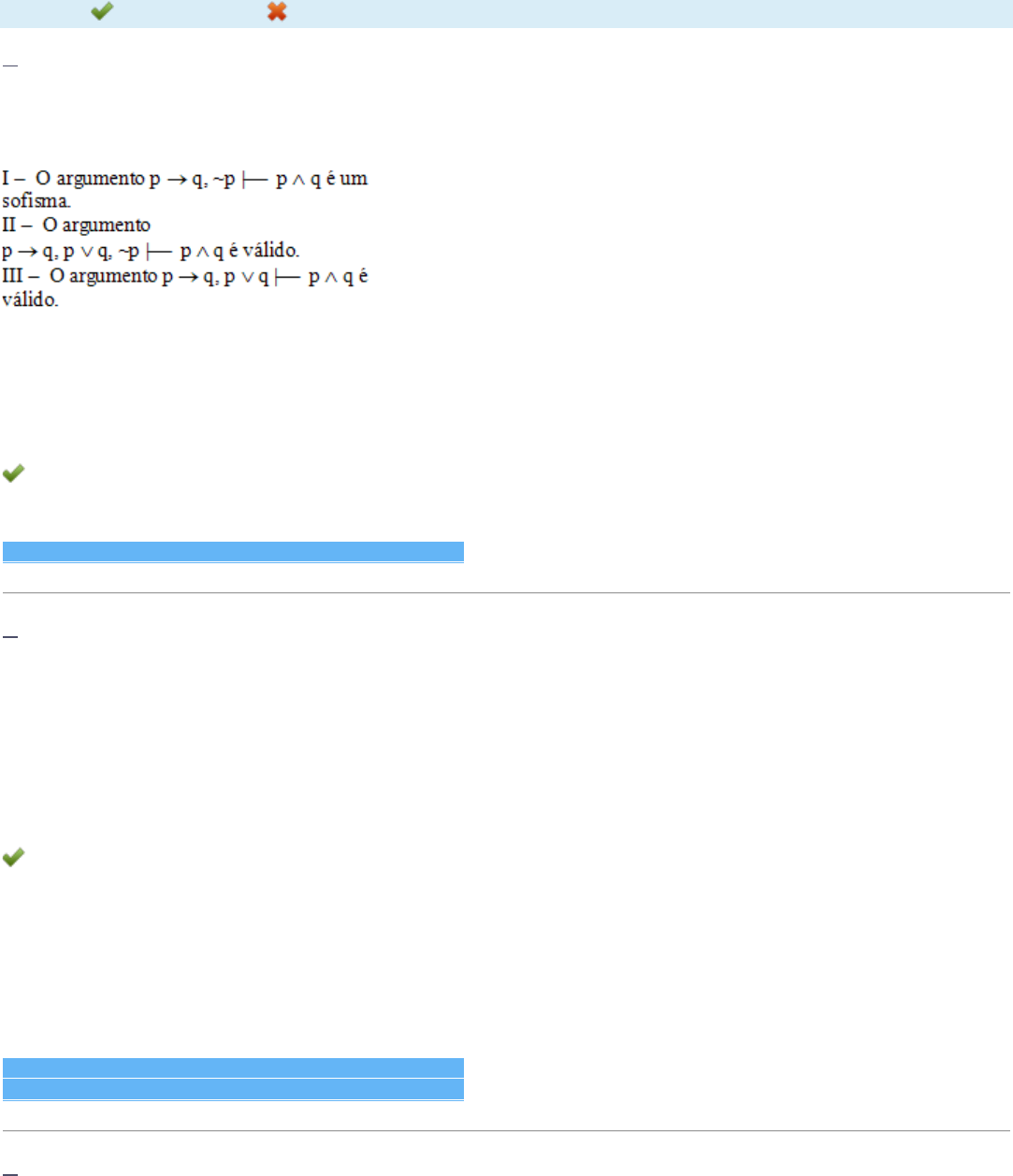 Disciplina: Lógica Matemática (MAT23) Avaliação: Avaliação II - Individual FLEX ( Cod.:513805) ( peso.:1,50) Prova: 18113573 Nota da Prova: 7,00 Legenda: Resposta Certa Sua Resposta Errada 1. Na tabela-verdade, as células de ambas as colunas são preenchidas com valores lógicos V e F, de modo a esgotar todas as possíveis combinações dentro de um argumento. Podemos analisar as colunas das premissas e sua conclusão para verificar a veracidade do argumento. Analise os argumentos a seguir e assinale a alternativa CORRETA: a) As sentenças II e III estão corretas. b) As sentenças I e III estão corretas. c) As sentenças I e II estão corretas. d) Somente a sentença I está correta. Anexos: FORMULÁRIO UNIDADE 2-3 - LÓGICA MATEMÁTICA 2. Três veículos estão parados em um estacionamento: um é vermelho, outro é prata e o outro é branco. Observe as afirmações a seguir, sabendo que apenas uma delas é verdadeira: I- O Corsa não é vermelho. II- O Gol é vermelho. III- O Palio não é prata. Nessas condições, é possível afirmar corretamente que: a) O Gol é prata, o Corsa é vermelho e o Palio é branco. b) O Gol é prata, o Corsa é branco e o Palio é vermelho. c) O Gol é branco, o Corsa é vermelho e o Palio é prata. d) O Gol é branco, o Corsa é prata e o Palio é vermelho. Anexos: FORMULÁRIO UNIDADE 2-3 - LÓGICA MATEMÁTICA FORMULÁRIO UNIDADE 2-3 - LÓGICA MATEMÁTICA 3. Os senhores A, B e C concorriam à liderança de certo partido político. Para escolher o líder, cada eleitor votou apenas em dois candidatos de sua preferência. Houve 100 votos para A e B, 80 votos para B e C e 20 votos para A e C. Analise as sentenças a seguir: I- A obteve 120 votos. https://portaldoalunoead.uniasselvi.com.br/ava/notas/request_gabarito_n2.php?action1=RkxYMTE3NQ==&action2=TUFUMjM=&action3=NTEzODA1&action4=MjAyMC8x&prova=MTgxMTM1NzM=#questao_1%20aria-label= https://portaldoalunoead.uniasselvi.com.br/extranet/layout/request/imag_prova_ead_anexo_n2.php?action1=MTgxMTM1NzM=&action2=NDM0Mjkz https://portaldoalunoead.uniasselvi.com.br/ava/notas/request_gabarito_n2.php?action1=RkxYMTE3NQ==&action2=TUFUMjM=&action3=NTEzODA1&action4=MjAyMC8x&prova=MTgxMTM1NzM=#questao_2%20aria-label= https://portaldoalunoead.uniasselvi.com.br/extranet/layout/request/imag_prova_ead_anexo_n2.php?action1=MTgxMTM1NzM=&action2=NDM0Mjkz https://portaldoalunoead.uniasselvi.com.br/extranet/layout/request/imag_prova_ead_anexo_n2.php?action1=MTgxMTM1NzM=&action2=NDM0Mjkz https://portaldoalunoead.uniasselvi.com.br/ava/notas/request_gabarito_n2.php?action1=RkxYMTE3NQ==&action2=TUFUMjM=&action3=NTEzODA1&action4=MjAyMC8x&prova=MTgxMTM1NzM=#questao_3%20aria-label= II- Venceu A, com 140 votos. III- A e B empataram em número de votos. IV- Venceu C, com 100 votos. V- Venceu B, com 180 votos. Assinale a alternativa CORRETA: a) As sentenças I e V estão corretas. b) As sentenças I e III estão corretas. c) As sentenças III e IV estão corretas. d) As sentenças II e V estão corretas. Anexos: FORMULÁRIO UNIDADE 2-3 - LÓGICA MATEMÁTICA FORMULÁRIO UNIDADE 2-3 - LÓGICA MATEMÁTICA FORMULÁRIO UNIDADE 2-3 - LÓGICA MATEMÁTICA 4. Seja o conjunto dos números naturais definidos por N = {0, 1, 2, ...}. A seguir temos alguns subconjuntos dos naturais: ? A = {x / x é natural par maior ou igual a 4 e menores que 14} ? B = {x / x é natural maior que 1 e menor que 14} ? C = {x / x é natural ímpar menor que 13} Com base nas definições destes subconjuntos dos naturais, qual das alternativas apresenta B - (A U C)? a) {1, 2, 13} b) {1, 11} c) {11, 13} d) {2, 13} Anexos: FORMULÁRIO UNIDADE 2-3 - LÓGICA MATEMÁTICA FORMULÁRIO UNIDADE 2-3 - LÓGICA MATEMÁTICA FORMULÁRIO UNIDADE 2-3 - LÓGICA MATEMÁTICA FORMULÁRIO UNIDADE 2-3 - LÓGICA MATEMÁTICA 5. A tabela-verdade é usada para determinar o valor lógico de uma proposição composta, sendo que os valores das proposições simples já são conhecidos, pois o valor lógico da proposição composta depende do valor lógico da proposição simples. a) Somente a opção I está correta. b) Somente a opção III está correta. https://portaldoalunoead.uniasselvi.com.br/extranet/layout/request/imag_prova_ead_anexo_n2.php?action1=MTgxMTM1NzM=&action2=NDM0Mjkz https://portaldoalunoead.uniasselvi.com.br/extranet/layout/request/imag_prova_ead_anexo_n2.php?action1=MTgxMTM1NzM=&action2=NDM0Mjkz https://portaldoalunoead.uniasselvi.com.br/extranet/layout/request/imag_prova_ead_anexo_n2.php?action1=MTgxMTM1NzM=&action2=NDM0Mjkz https://portaldoalunoead.uniasselvi.com.br/ava/notas/request_gabarito_n2.php?action1=RkxYMTE3NQ==&action2=TUFUMjM=&action3=NTEzODA1&action4=MjAyMC8x&prova=MTgxMTM1NzM=#questao_4%20aria-label= https://portaldoalunoead.uniasselvi.com.br/extranet/layout/request/imag_prova_ead_anexo_n2.php?action1=MTgxMTM1NzM=&action2=NDM0Mjkz https://portaldoalunoead.uniasselvi.com.br/extranet/layout/request/imag_prova_ead_anexo_n2.php?action1=MTgxMTM1NzM=&action2=NDM0Mjkz https://portaldoalunoead.uniasselvi.com.br/extranet/layout/request/imag_prova_ead_anexo_n2.php?action1=MTgxMTM1NzM=&action2=NDM0Mjkz https://portaldoalunoead.uniasselvi.com.br/extranet/layout/request/imag_prova_ead_anexo_n2.php?action1=MTgxMTM1NzM=&action2=NDM0Mjkz https://portaldoalunoead.uniasselvi.com.br/ava/notas/request_gabarito_n2.php?action1=RkxYMTE3NQ==&action2=TUFUMjM=&action3=NTEzODA1&action4=MjAyMC8x&prova=MTgxMTM1NzM=#questao_5%20aria-label= c) Somente a opção IV está correta. d) Somente a opção II está correta. Anexos: FORMULÁRIO UNIDADE 2-3 - LÓGICA MATEMÁTICA FORMULÁRIO UNIDADE 2-3 - LÓGICA MATEMÁTICA FORMULÁRIO UNIDADE 2-3 - LÓGICA MATEMÁTICA FORMULÁRIO UNIDADE 2-3 - LÓGICA MATEMÁTICA FORMULÁRIO UNIDADE 2-3 - LÓGICA MATEMÁTICA 6. Sejam os conjuntos A e B num universo U, a) Ao conjunto B'. b) Ao conjunto B. c) Ao conjunto A'. d) Ao conjunto A. Anexos: FORMULÁRIO UNIDADE 2-3 - LÓGICA MATEMÁTICA FORMULÁRIO UNIDADE 2-3 - LÓGICA MATEMÁTICA FORMULÁRIO UNIDADE 2-3 - 