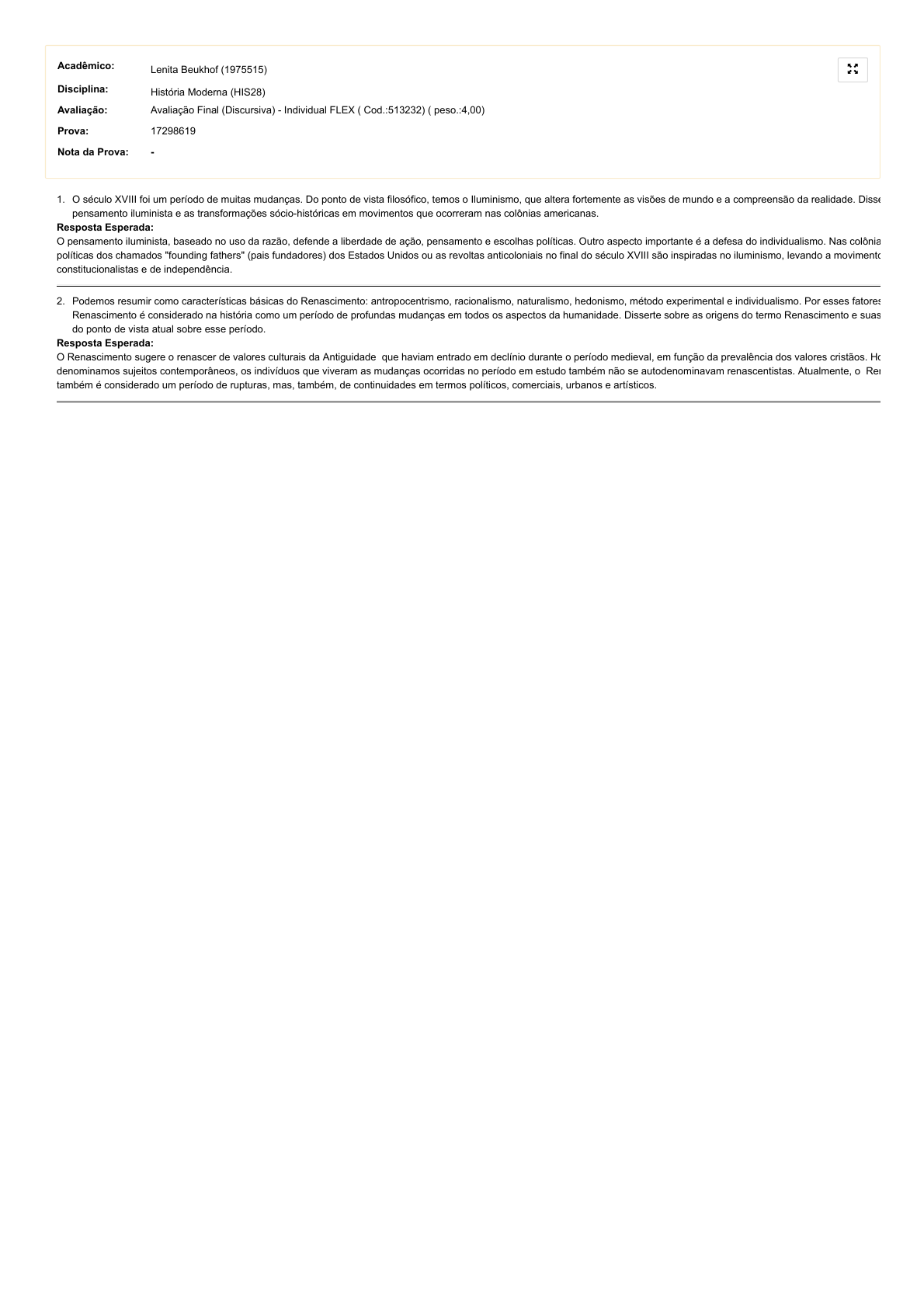 29/04/2020 UNIASSELVI - Centro Universitário Leonardo Da Vinci - Portal do Aluno - Portal do Aluno - Grupo UNIASSELVI https://portaldoalunoead.uniasselvi.com.br/ava/avaliacao/avaliacao_lista.php 1/1 Acadêmico: Lenita Beukhof (1975515) Disciplina: História Moderna (HIS28) Avaliação: Avaliação Final (Discursiva) - Individual FLEX ( Cod.:513232) ( peso.:4,00) Prova: 17298619 Nota da Prova: - 1. O século XVIII foi um período de muitas mudanças. Do ponto de vista filosófico, temos o Iluminismo, que altera fortemente as visões de mundo e a compreensão da realidade. Disse pensamento iluminista e as transformações sócio-históricas em movimentos que ocorreram nas colônias americanas. Resposta Esperada: O pensamento iluminista, baseado no uso da razão, defende a liberdade de ação, pensamento e escolhas políticas. Outro aspecto importante é a defesa do individualismo. Nas colônia políticas dos chamados "founding fathers" (pais fundadores) dos Estados Unidos ou as revoltas anticoloniais no final do século XVIII são inspiradas no iluminismo, levando a movimento constitucionalistas e de independência. 2. Podemos resumir como características básicas do Renascimento: antropocentrismo, racionalismo, naturalismo, hedonismo, método experimental e individualismo. Por esses fatores Renascimento é considerado na história como um período de profundas mudanças em todos os aspectos da humanidade. Disserte sobre as origens do termo Renascimento e suas do ponto de vista atual sobre esse período. Resposta Esperada: O Renascimento sugere o renascer de valores culturais da Antiguidade que haviam entrado em declínio durante o período medieval, em função da prevalência dos valores cristãos. Ho denominamos sujeitos contemporâneos, os indivíduos que viveram as mudanças ocorridas no período em estudo também não se autodenominavam renascentistas. Atualmente, o Ren também é considerado um período de rupturas, mas, também, de continuidades em termos políticos, comerciais, urbanos e artísticos.