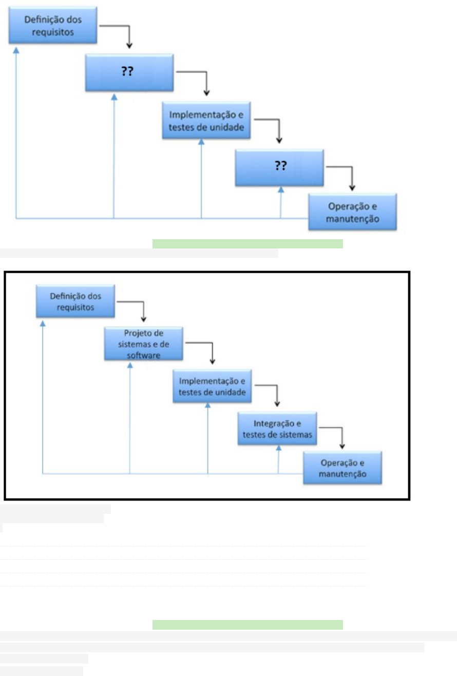 Questão 1 : O modelo em cascata organiza as atividades do processo de desenvolvimento de forma sequencial. Cada fase envolve a elaboração de um ou mais documentos, que devem ser aprovados antes de se iniciar a fase seguinte. Assim, uma fase só deve ser iniciada após a conclusão daquela que a precede. A figura abaixo ilustra o modelo Cascata. Entretanto, duas fases estão com os nomes ocultos nessa figura, marque a alternativa abaixo que apresenta, consecutivamente, o nome dessas fases. Resposta Errada! A resposta correta é a opção C Justificativa:JUSTIFICATIVA: ALTERNATIVA “C “: Na Unidade 4, temos: Figura 02 – Modelo Cascata. Fonte: Sommerville (2011). A Integração e Testes de Sistemas - Projeto de Sistemas e de Software B Integração - Testes de Sistemas C Projeto de Sistemas e de Software - Integração e Testes de Sistemas D Projeto - Análise Questão 2 : Na unidade 1, vimos que A engenharia de software é criticada por ser inadequada para o desenvolvimento moderno de software. No entanto, muitas dessas falhas são consequência dos seguintes fatores: Resposta Errada! A resposta correta é a opção A Justificativa:Alternativa A: Segundo Azevedo (2003), A engenharia de software é criticada por ser inadequada para o desenvolvimento moderno de software. No entanto, muitas dessas falhas são consequência de dois fatores: Aumento de demanda. Expectativas baixas. A Especificação de software. B Projeto e implementação de software. C Validação de software. D Evolução de software. Questão 3 : Conforme estudamos na Unidade 06, sobre o modelo incremental podemos afirmar que: Acertou! A resposta correta é a opção A Justificativa:JUSTIFICATIVA: ALTERNATIVA “A “: Na Unidade 06, temos a afirmação: O desenvolvimento incremental de software é melhor do que uma abordagem em cascata para a maioria dos sistemas de negócios, e-commerce e sistemas pessoais. Desenvolvimento incremental reflete a maneira como resolvemos os problemas. Raramente elaboramos uma completa solução do problema com antecedência; geralmente movemo-nos passo a passo em direção a uma solução, recuando quando percebemos que cometemos um erro. Ao desenvolver um software de forma incremental, é mais barato e mais fácil fazer mudanças no software durante seu desenvolvimento. Cada incremento ou versão do sistema incorpora alguma funcionalidade necessária para o cliente. Frequentemente, os incrementos iniciais incluem a funcionalidade mais importante ou mais urgente. Isso significa que o cliente pode avaliar o sistema em um estágio relativamente inicial do desenvolvimento para ver se ele oferece o que foi requisitado. Em caso negativo, só o incremento que estiver em desenvolvimento no momento precisará ser alterado e, possivelmente, nova funcionalidade deverá ser definida para incrementos posteriores. A Cada incremento ou versão do sistema incorpora alguma funcionalidade necessária para o cliente. B O desenvolvimento incremental de software é pior do que uma abordagem em cascata para a maioria dos sistemas de negócios, e-commerce e sistemas pessoais. C Ao desenvolver um software de forma incremental, é mais barato e mais difícil fazer mudanças no software durante seu desenvolvimento. D O cliente não pode avaliar o sistema em um estágio relativamente inicial do desenvolvimento para ver se ele oferece o que foi requisitado. Questão 4 : Analise as sentenças abaixo sobre o modelo V do processo de software que estudamos na Unidade 5: I. No modelo V, se alguma mudança acontecer no meio do caminho, deverão ser atualizados imediatamente os documentos de testes e análises, juntamente com os documentos de requisitos. II. O modelo em forma de V deve ser usado em projetos onde as exigências são claramente definidas e estabelecidas. III. O modelo em forma de V funciona bem para pequenos projetos onde os requisitos são facilmente compreendidos. Após analisar as sentenças acima, podemos afirmar que estão CORRETAS: Resposta Errada! A resposta correta é a opção D Justificativa:JUSTIFICATIVA: ALTERNATIVA “D “: Na Unidade 5, temos a afirmação: • No Modelo V, se alguma mudança acontecer no meio do caminho, deverão ser atualizados imediatamente os documentos de testes e análises, juntamente com os documentos de requisitos. • O modelo em forma de V deve ser usado em projetos onde as exigências são claramente definidas e estabelecidas. • O modelo em forma de V, funciona bem para pequenos projetos onde os requisitos são facilmente compreendidos. A Apenas a sentença I B Apenas as sentenças I e II C Apenas as sentenças II e III D Todas as sentenças Questão 5 : No modelo Cascata, existe uma fase em que as funcionalidades, regras, restrições e metas do sistema são estabelecidos por meio de consulta aos usuários. Em seguida, são definidos em detalhes e funcionam como uma especificação do sistema. Nessa fase, geralmente, tem-se um documento que deve firmado entre o usuário e o analista de sistema. De acordo com que estudamos na Unidade 04, essa fase denomina-se: Resposta Errada! A resposta correta é a opção B Justificativa:JUSTIFICATIVA: ALTERNATIVA “B “: Na Unidade 4, temos a afirmação: Segundo Sommerville (2011), os principais estágios do modelo em cascata refletem diretamente as atividades fundamentais do desenvolvimento: • Análise e definição de requisitos: As funcionalidades, regras, restrições e metas do sistema são estabelecidos por meio de consulta aos usuários. Em seguida, são definidos em detalhes e funcionam como uma especificação do sistema. Nessa fase, geralmente, tem-se um documento que deve firmado entre o usuário e o analista de sistema. A Projeto de sistema e software B Análise e definição de requisitos C Implementação e teste unitário D Integração e teste de sistema Questão 6 : Alguns dos problemas que surgem durante o processo de engenharia de requisitos são as falhas em não fazer uma clara separação entre