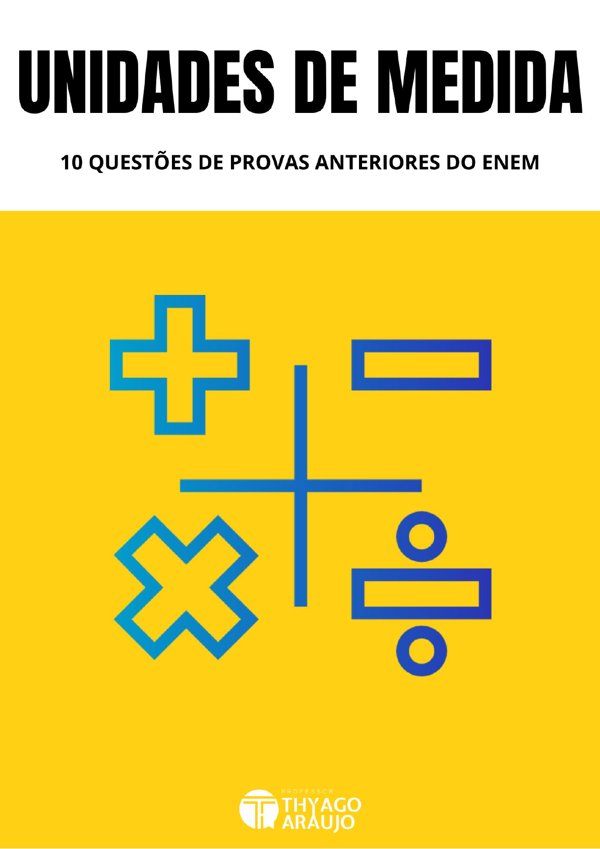 Professor Thyago Araujo 1 Assista às soluções das questões indicadas Professor Thyago Araujo | CLIQUE AQUI Curso Online de Matemática - ENEM CLIQUE AQUI https://thyagoaraujo.com/ https://thyagoaraujo.com/ https://youtu.be/NhwrayP3DjY https://thyagoaraujo.com/cursoonlinedematematica https://thyagoaraujo.com/ https://youtu.be/NhwrayP3DjY https://thyagoaraujo.com/cursoonlinedematematica https://thyagoaraujo.com/ https://youtu.be/NhwrayP3DjY https://thyagoaraujo.com/cursoonlinedematematica https://thyagoaraujo.com/ https://youtu.be/NhwrayP3DjY https://youtu.be/NhwrayP3DjY https://thyagoaraujo.com/cursoonlinedematematica https://thyagoaraujo.com/ https://youtu.be/NhwrayP3DjY https://thyagoaraujo.com/cursoonlinedematematica https://thyagoaraujo.com/cursoonlinedematematica https://thyagoaraujo.com/ https://youtu.be/NhwrayP3DjY https://thyagoaraujo.com/cursoonlinedematematica https://thyagoaraujo.com/cursoonlinedematematica https://thyagoaraujo.com/ https://youtu.be/NhwrayP3DjY https://thyagoaraujo.com/cursoonlinedematematica https://thyagoaraujo.com/ https://youtu.be/NhwrayP3DjY https://thyagoaraujo.com/cursoonlinedematematica https://thyagoaraujo.com/ https://youtu.be/NhwrayP3DjY https://thyagoaraujo.com/cursoonlinedematematica Professor Thyago Araujo 2 Assista às soluções das questões indicadas Professor Thyago Araujo | CLIQUE AQUI Curso Online de Matemática - ENEM CLIQUE AQUI Este material contém questões de provas anteriores do ENEM e as questões sinalizadas com o ícone possuem solução em vídeo. No fim deste material, consta o gabarito das questões. Um grande abraço do professor Thyago Araujo! Sigam nossas redes sociais: QUESTÕES 01. (ENEM-2013) Nos Estados Unidos a unidade de medida de volume mais utilizada em latas de refrigerante é a onça fluida (fl oz), que equivale a aproximadamente 2,95 centilitros (cL). Sabe-se que o centilitro é a centésima parte do litro e que a lata de refrigerante usualmente comercializada no Brasil tem capacidade de 355 mL. Assim, a medida do volume da lata de refrigerante de 355 mL, em onça fluida (fl oz), é mais próxima de a) 0,83 b) 1,20 c) 12,03 d) 104,73 e) 120,34 02. (ENEM-2013) A Secretaria de Saúde de um município avalia um programa que disponibiliza, para cada aluno de uma escola municipal, uma bicicleta, que deve ser usada no trajeto de ida e volta, entre sua casa e a escola. Na fase de implantação do programa, o aluno que morava mais distante da escola realizou sempre o mesmo trajeto, representado na figura, na escala 1 : 25 000, por um período de cinco dias. Quantos quilômetros esse aluno percorreu na fase de implantação do programa? a) 4 b) 8 c) 16 d) 20 ESCALA E TRANSFORMAÇÃO DE MEDIDAS @escoladenumeros Fanpage: Matemática com Thyago Araujo https://thyagoaraujo.com/ https://thyagoaraujo.com/ https://youtu.be/NhwrayP3DjY https://thyagoaraujo.com/cursoonlinedematematica https://thyagoaraujo.com/ https://youtu.be/NhwrayP3DjY https://thyagoaraujo.com/cursoonlinedematematica https://thyagoaraujo.com/ https://youtu.be/NhwrayP3DjY https://thyagoaraujo.com/cursoonlinedematematica https://thyagoaraujo.com/ https://youtu.be/NhwrayP3DjY https://youtu.be/NhwrayP3DjY https://thyagoaraujo.com/cursoonlinedematematica https://thyagoaraujo.com/ https://youtu.be/NhwrayP3DjY https://thyagoaraujo.com/cursoonlinedematematica https://thyagoaraujo.com/cursoonlinedematematica https://thyagoaraujo.com/ https://youtu.be/NhwrayP3DjY https://thyagoaraujo.com/cursoonlinedematematica https://thyagoaraujo.com/cursoonlinedematematica https://thyagoaraujo.com/ https://youtu.be/NhwrayP3DjY https://thyagoaraujo.com/cursoonlinedematematica https://thyagoaraujo.com/ https://youtu.be/NhwrayP3DjY https://thyagoaraujo.com/cursoonlinedematematica https://youtu.be/bAci_Mkqd1w https://thyagoaraujo.com/ https://youtu.be/NhwrayP3DjY https://thyagoaraujo.com/cursoonlinedematematica https://thyagoaraujo.com/ https://youtu.be/NhwrayP3DjY https://thyagoaraujo.com/cursoonlinedematematica https://thyagoaraujo.com/ https://youtu.be/NhwrayP3DjY https://thyagoaraujo.com/cursoonlinedematematica https://youtu.be/bAci_Mkqd1w https://thyagoaraujo.com/ https://youtu.be/NhwrayP3DjY https://thyagoaraujo.com/cursoonlinedematematica https://www.instagram.com/escoladenumeros/ https://www.youtube.com/c/EscoladeNumeros/?sub_confirmation=1 https://twitter.com/escoladenumeros https://www.facebook.com/escoladenumeros/ https://thyagoaraujo.com/ https://youtu.be/NhwrayP3DjY https://thyagoaraujo.com/cursoonlinedematematica Professor Thyago Araujo 3 Assista às soluções das questões indicadas Professor Thyago Araujo | CLIQUE AQUI Curso Online de Matemática - ENEM CLIQUE AQUI e) 40 03. (ENEM-2018) Um mapa é a representação reduzida e simplificada de uma localidade. Essa redução, que é feita com o uso de uma escala, mantém a proporção do espaço representado em relação ao espaço real. Certo mapa tem escala 1 : 58 000 000. Considere que, nesse mapa, o segmento de reta que liga o navio à marca do tesouro meça 7,6 cm. A medida real, em quilômetro, desse segmento de reta é a) 4 408. b) 7 632. c) 44 080. d) 76 316. e) 440 800. 04. (ENEM-2017) Em alguns países anglo-saxões, a unidade de volume utilizada para indicar o conteúdo de alguns recipientes é a onça fluida britânica. O volume de uma onça fluida britânica corresponde a 28,4130625 ml. A título de simplificação, considere uma onça fluida britânica correspondendo a 28 ml. Nessas condições, o volume de um recipiente com capacidade de 400 onças fluidas britânicas, em cm³, é igual a a) 11200. b) 1120. c) 112. d) 11,2. e) 1,12. 05. (ENEM-2016) Uma caixa-d’água em forma de um paralelepípedo retângulo reto, com 4 m de comprimento, 3 m de largura 2 m de altura, necessita de higienização. Nessa operação a caixa precisará ser esvaziada em 20 min, no máximo. A retirada da água será feita com o auxílio de uma bomba de vazão constante, em que vazão é o volume do líquido que passa pela bomba p