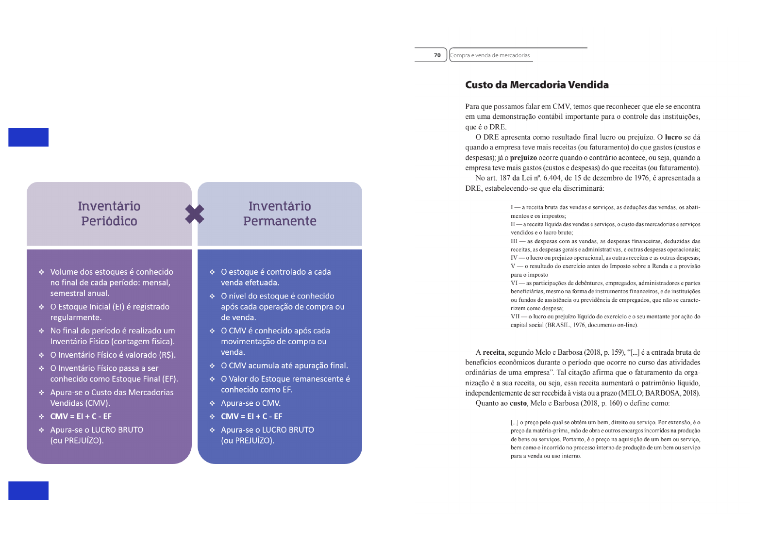 07/05/2020 https://sagahcm.sagah.com.br/sagahcm/sagah_ua_dinamica/impressao_ua/15987305 https://sagahcm.sagah.com.br/sagahcm/sagah_ua_dinamica/impressao_ua/15987305 5/31 • ( + ) Compras • ( - ) Devolução de compras • ( = ) Mercadoria à Disposição de Vendas (MDV) • ( - ) Estoque final • ( = ) Lucro bruto ou prejuízo INFOGRÁFICO Observe neste infográfico uma síntese sobre os principais �pos de estoque. CONTEÚDO DO LIVRO 07/05/2020 https://sagahcm.sagah.com.br/sagahcm/sagah_ua_dinamica/impressao_ua/15987305 https://sagahcm.sagah.com.br/sagahcm/sagah_ua_dinamica/impressao_ua/15987305 10/31 07/05/2020 https://sagahcm.sagah.com.br/sagahcm/sagah_ua_dinamica/impressao_ua/15987305 https://sagahcm.sagah.com.br/sagahcm/sagah_ua_dinamica/impressao_ua/15987305 13/31 07/05/2020 https://sagahcm.sagah.com.br/sagahcm/sagah_ua_dinamica/impressao_ua/15987305 https://sagahcm.sagah.com.br/sagahcm/sagah_ua_dinamica/impressao_ua/15987305 14/31 07/05/2020 https://sagahcm.sagah.com.br/sagahcm/sagah_ua_dinamica/impressao_ua/15987305 https://sagahcm.sagah.com.br/sagahcm/sagah_ua_dinamica/impressao_ua/15987305 15/31 07/05/2020 https://sagahcm.sagah.com.br/sagahcm/sagah_ua_dinamica/impressao_ua/15987305 https://sagahcm.sagah.com.br/sagahcm/sagah_ua_dinamica/impressao_ua/15987305 16/31 07/05/2020 https://sagahcm.sagah.com.br/sagahcm/sagah_ua_dinamica/impressao_ua/15987305 https://sagahcm.sagah.com.br/sagahcm/sagah_ua_dinamica/impressao_ua/15987305 17/31 07/05/2020 https://sagahcm.sagah.com.br/sagahcm/sagah_ua_dinamica/impressao_ua/15987305 https://sagahcm.sagah.com.br/sagahcm/sagah_ua_dinamica/impressao_ua/15987305 18/31 07/05/2020 https://sagahcm.sagah.com.br/sagahcm/sagah_ua_dinamica/impressao_ua/15987305 https://sagahcm.sagah.com.br/sagahcm/sagah_ua_dinamica/impressao_ua/15987305 27/31 DICA DO PROFESSOR Assista ao vídeo a seguir sobre a contabilização do CMV. Conteúdo disponível na plataforma virtual de ensino. Con�ra! EXERCÍCIOS 1) A empresa Alfa Comércio Eletrônico Ltda. apresentou em seu estoque, em 31/12/2014, a quan�dade de 100 celulares “X Inovador” ao preço unitário de R$500,00. Em 01/01/2015, realizou a compra de mais 200 celulares ao mesmo preço unitário, no valor total de R$100.000,00. Já no mês de fevereiro de 2015, vendeu 150 celulares ao preço unitário de R$800,00.Com base nessas informações, assinale a alterna�va CORRETA. a) O lucro bruto foi de R$45.000,00. b) O lucro bruto foi de R$120.000,00. c) O estoque final foi de 100 celulares. d) O estoque final foi de R$150.000,00. e) O Custo das Mercadorias Vendidas (CMV) foi de R$50.000,00. 2) A empresa Atacadista do Bairro Ltda. apresentou as seguintes informações no mês de maio de 2015:Estoque inicial de R$25.000,00. Compras de mercadorias de AAB Comércio Ltda. no valor de R$80.000,00. Devoluções (parte) de mercadorias de AAB Comércio Ltda. no valor de R$20.000,00. Compras de mercadorias de BBB Atacadista Ltda. no valor de R$30.000,00. 07/05/2020 https://sagahcm.sagah.com.br/sagahcm/sagah_ua_dinamica/impressao_ua/15987305 https://sagahcm.sagah.com.br/sagahcm/sagah_ua_dinamica/impressao_ua/15987305 28/31 Estoque final no valor de R$60.000,00.Com base nessas informações, assinale a alterna�va CORRETA. a) O Custo das Mercadorias Vendidas foi de R$65.000,00. b) O Custo das Mercadorias Vendidas foi de R$55.000,00. c) O Custo das Mercadorias Vendidas foi de R$70.000,00. d) O Custo das Mercadorias Vendidas foi de R$45.000,00. e) O Custo das Mercadorias Vendidas foi de R$50.000,00. 3) O supermercado Tudo Barato XYZ Ltda., líder nacional, possui em seu estoque 50.000 itens, com um grande volume de operações de compra e venda destes, diariamente. Para ter um melhor gerenciamento do controle dos estoques e apurar de forma rápida o custo de aquisição dos produtos e, consequentemente, apurar o resultado (lucro ou prejuízo), o supermercado adota o sistema de inventário permanente.Com base nessas informações, assinale a alterna�va CORRETA. a) O sistema do inventário permanente é igual ao inventário periódico, exceto a obrigatoriedade da realização do inventário �sico (contagem) para apurar o Custo das Mercadorias Vendidas (CMV) no inventário permanente. b) Para apurar o Custo das Mercadorias Vendidas, não se u�liza a fórmula CMV = EI (Estoque Inicial) + C (Compras) – EF (Estoque Final), pois é calculado automa�camente pelo sistema. c) Após a dedução do Custo das Mercadorias Vendidas na Demonstração de Resultado do Exercício, encontramos a receita líquida. d) Para a apuração do Custo das Mercadorias Vendidas, não consideramos as despesas que acompanham os itens adquiridos até a entrada no estoque para venda, como fretes sem compras, seguros, devoluções de compra etc. e) O sistema de inventário permanente é um sistema informa�zado que permite a atualização automá�ca de toda operação de compra e venda envolvendo os 07/05/2020 https://sagahcm.sagah.com.br/sagahcm/sagah_ua_dinamica/impressao_ua/15987305 https://sagahcm.sagah.com.br/sagahcm/sagah_ua_dinamica/impressao_ua/15987305 29/31 estoques, possibilitando verificar o estoque �sico de cada item online, acompanhar o custo de aquisição, o volume de negociação etc. 4) A RR Comércio Limpo Ltda. comprou um lote de mercadorias do fornecedor BAX Ltda., no valor de R$120.000,00, isento de ICMS, nas seguintes condições: R$40.000,00 à vista, e o restante de R$80.000,00 a prazo. O registro dessa operação na contabilidade da RR Comércio Limpo Ltda. foi: a) D = Mercadorias: R$120.000,00 C = Fornecedores: R$120.000,00 b) D = Mercadorias: R$120.000,00 C = Caixa: R$40.000,00 C = Fornecedores: R$80.000,00 c) D = Caixa: R$40.000,00 D = Fornecedores: R$80.000,00 C = Mercadorias: R$120.000,00 d) D = Caixa: R$80.000,00 C = Fornecedores: R$40.000,00 C = Mercadorias: R$120.000,00 e) D = Mercadorias: R$120.000,00 C = Fornecedores R$ 40.000,00 C = Caixa R$ 80.000,00 5) Em junho de 2015, ocorreram as seguintes operaç