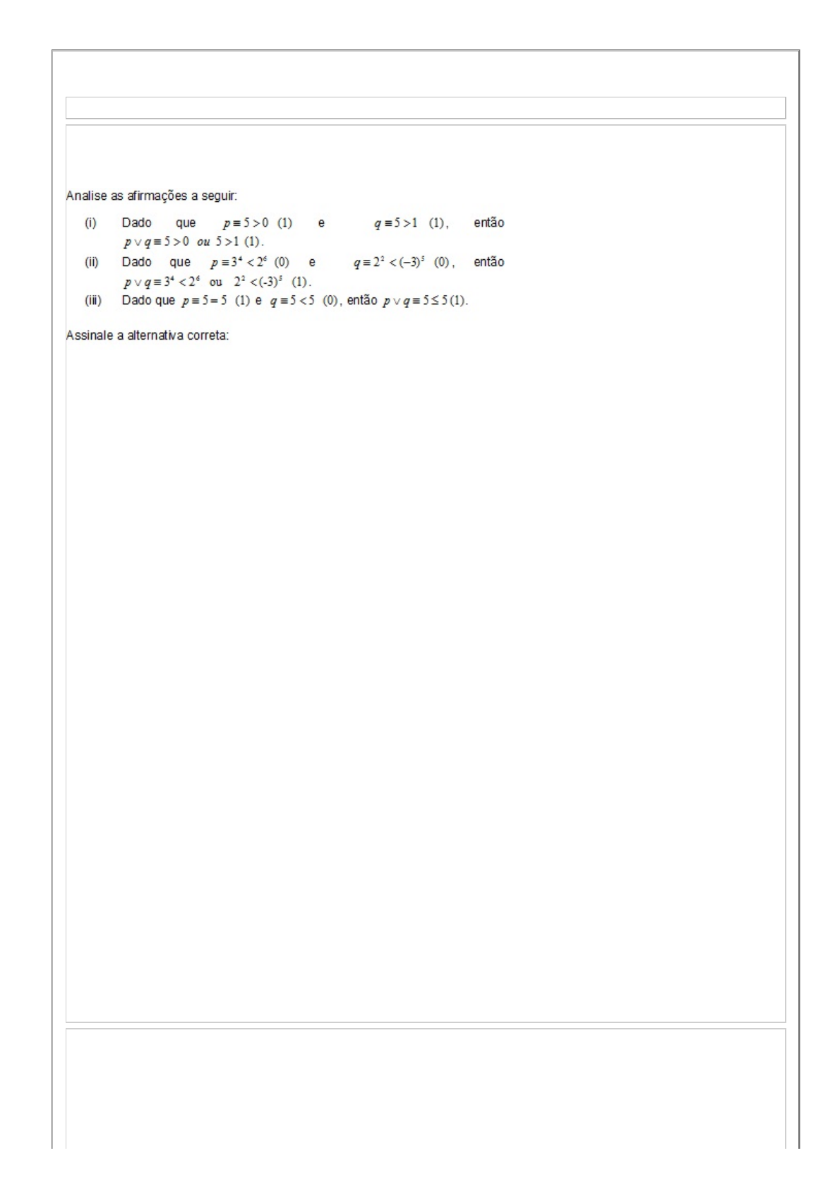 27/09/2019 UNIP - Universidade Paulista : DisciplinaOnline - Sistemas de conteúdo online para Alunos. https://online.unip.br/imprimir/imprimirconteudo 1/16 Exercício 1: A) As alternativas (ii) e (iii) são verdadeiras e (i) é falsa. B) As alternativas (i) e (ii) são verdadeiras e (iii) é falsa. C) As alternativas (i) e (iii) são verdadeiras e (ii) é falsa. D) As alternativas (i), (ii) , (iii) são verdadeiras. E) As alternativas (i), (ii) , (iii) são falsas. O aluno respondeu e acertou. Alternativa(C) Comentários: B) pois assim que conta no material A) pois assim que conta no material C) pois assim que conta no material Exercício 2: 27/09/2019 UNIP - Universidade Paulista : DisciplinaOnline - Sistemas de conteúdo online para Alunos. https://online.unip.br/imprimir/imprimirconteudo 2/16 A) As alternativas (ii) e (iii) são verdadeiras e (i) é falsa. B) As alternativas (i) e (ii) são verdadeiras e (iii) é falsa. C) As alternativas (i) e (iii) são verdadeiras e (ii) é falsa. D) As alternativas (i), (ii) , (iii) são verdadeiras. E) As alternativas (i), (ii) , (iii) são falsas. O aluno respondeu e acertou. Alternativa(B) Comentários: D) pois assim que conta no material E) pois assim que conta no material C) pois assim que conta no material B) pois assim que conta no material Exercício 3: 27/09/2019 UNIP - Universidade Paulista : DisciplinaOnline - Sistemas de conteúdo online para Alunos. https://online.unip.br/imprimir/imprimirconteudo 3/16 A) As alternativas (i) e (ii) são falsas e (iii) é verdadeira. B) As alternativas (i) e (ii) são verdadeiras e (iii) é falsa. C) As alternativas (i) e (iii) são verdadeiras e (ii) é falsa. D) As alternativas (i), (ii) , (iii) são verdadeiras. E) As alternativas (i), (ii) , (iii) são falsas. O aluno respondeu e acertou. Alternativa(A) Comentários: B) pois assim que conta no material E) pois assim que conta no material D) pois assim que conta no material B) pois assim que conta no material A) pois assim que conta no material Exercício 4: A) As alternativas (ii) e (iii) são verdadeiras e (i) é falsa. 27/09/2019 UNIP - Universidade Paulista : DisciplinaOnline - Sistemas de conteúdo online para Alunos. https://online.unip.br/imprimir/imprimirconteudo 4/16 B) As alternativas (i) e (ii) são verdadeiras e (iii) é falsa. C) As alternativas (i) e (iii) são verdadeiras e (ii) é falsa. D) As alternativas (i), (ii) , (iii) são verdadeiras. E) As alternativas (i), (ii) , (iii) são falsas. O aluno respondeu e acertou. Alternativa(D) Comentários: A) pois assim que conta no material B) pois assim que conta no material C) pois assim que conta no material D) pois assim que conta no material Exercício 5: A) As alternativas (ii) e (iii) são verdadeiras e (i) é falsa. B) As alternativas (i) e (ii) são verdadeiras e (iii) é falsa. C) As alternativas (i) e (iii) são verdadeiras e (ii) é falsa. 27/09/2019 UNIP - Universidade Paulista : DisciplinaOnline - Sistemas de conteúdo online para Alunos. https://online.unip.br/imprimir/imprimirconteudo 5/16 D) As alternativas (i), (ii) , (iii) são verdadeiras. E) As alternativas (i), (ii) , (iii) são falsas. O aluno respondeu e acertou. Alternativa(D) Comentários: B) pois assim que conta no material E) pois assim que conta no material D) pois assim que conta no material Exercício 6: Imagine a seguinte situação: Uma mulher que está fazendo compras em um supermercado e quando chega aos caixas para pagar suas mercadorias percebe que o único caixa livre tem a informação: “caixa reservado para gestantes e deficientes físicos”. Sejam as proposições: p: reservado para gestante; q: reservado para deficientes físicos. A mulher poderá passar no caixa, considerando a possibilidade de usar a operação “disjunção”, quando: (i) A mulher for gestante e também deficiente. (ii) A mulher for gestante e não for deficiente. (iii) A mulher não for gestante e for deficiente. Assinale a alternativa correta: A) As afirmações (ii) e (iii) são verdadeiras e (i) é falsa. B) As afirmações (i) e (ii) são verdadeiras e (iii) é falsa. C) As afirmações (i) e (iii) são verdadeiras e (ii) é falsa. D) 27/09/2019 UNIP - Universidade Paulista : DisciplinaOnline - Sistemas de conteúdo online para Alunos. https://online.unip.br/imprimir/imprimirconteudo 6/16 As afirmações (i), (ii) , (iii) são verdadeiras. E) As afirmações (i), (ii) , (iii) são falsas. O aluno respondeu e acertou. Alternativa(D) Comentários: B) pois assim que conta no material A) pois assim que conta no material C) pois assim que conta no material D) pois assim que conta no material Exercício 7: Dada as proposições p: Pedro é fotografo. q: Pedro é cozinheiro. Para operação de conjunção a alternativa correta é A) Pedro é fotografo e é cozinheiro. B) Pedro é fotografo ou é cozinheiro. C) Se Pedro é fotografo, então ele é cozinheiro. D) Pedro é fotografo se, e somente se é cozinheiro. E) Pedro não é cozinheiro. O aluno respondeu e acertou. Alternativa(A) Comentários: A) pois assim que conta no material 27/09/2019 UNIP - Universidade Paulista : DisciplinaOnline - Sistemas de conteúdo online para Alunos. https://online.unip.br/imprimir/imprimirconteudo 7/16 Exercício 8: Dada as proposições p: Pedro é fotografo. q: Pedro é cozinheiro. Para operação de disjunção a alternativa correta é: A) Pedro é fotografo e é cozinheiro. B) Pedro é fotografo ou é cozinheiro. C) Se Pedro é fotografo, então ele é cozinheiro. D) Pedro é fotografo se, e somente se é cozinheiro. E) Pedro não é cozinheiro. O aluno respondeu e acertou. Alternativa(B) Comentários: B) pois assim que conta no material Exercício 9: A) V, V, V, F: (~p → q) implica em ~q, pois é uma contingência B) 27/09/2019 UNIP - Universidade Paulista : DisciplinaOnline - Sistemas de conteúdo online para Alunos. https://online.unip.br/imprimir/imprimirconteudo 8/16 V, V, V, V: (~p → q) implica em ~q , pois é uma tautologia. C) 