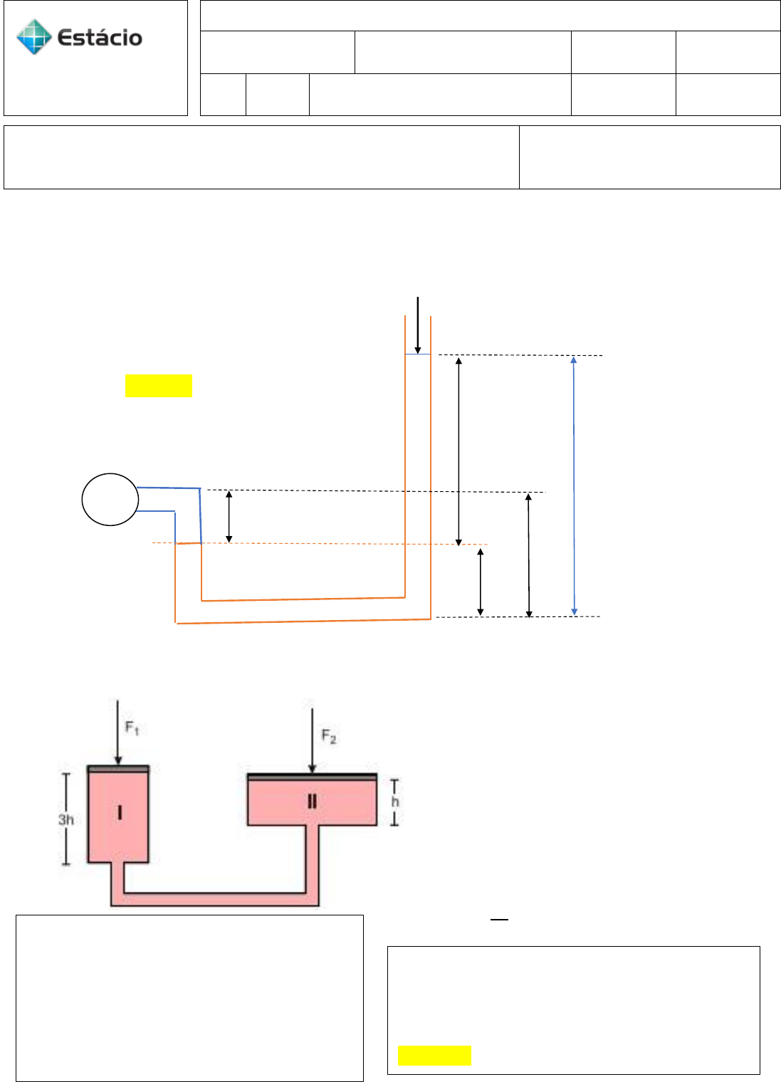 1. Dada a figura abaixo, sabendo que ϒ Hg= 136.000N/m³ e ϒ H2O = 10.000N/m³. Calcule a pressão no manômetro (P1). 2. Observe, na figura a seguir, a representação de uma prensa hidráulica, na qual as forças F1 e F2 atuam, respectivamente, sobre os êmbolos dos cilindros I e II. (1pt) P1 h 1 h 2 7,5 cm 5 cm . A . B 15 cm H2O Hg Patm NOVA IGUAÇU UNESA Curso Engenharia Disciplina Hidráulica Cód. CCE 1161 Turma 3018 AV1 Data: Professor : Rogério Marques Semestre 2019.1 Fl. 1/3 Nome do Aluno (a) GABARITO Nº da matrícula Admita que os cilindros estejam totalmente preenchidos por um líquido. O volume do cilindro II é igual a quatro vezes o volume do cilindro I, cuja altura é o triplo da altura do cilindro II. A razão entre as intensidades das forças F2 e F1, quando o sistema está em equilíbrio, corresponde a: 𝑭𝟐 𝑭𝟏 = ? PA = PB P1 + 𝜸H20 x (0,075 – 0,05) = Patm + 𝜸Hg x (0,15 – 0,05) P1 = Patm + 𝜸Hg x 0,1 - 𝜸H20 x 0,025 P1 = 105+ 136000 x 0,1 - 10000 x 0,025 P1 = 105+ 13600 x 0,1 - 250 P1 = 113350 Pa = 113,35 KPa Sabendo que o volume de um sólido geométrico é definido como sendo o produto da área da base pela altura, temos: V2 = 4.V1 A2 h = 4.A1 3.h A2 = 12 . A1 Aplicando o Princípio de Pascal, temos: F1/A1 = F2/A2 F1/A1 = F2/12.A1 F1 = F2/12 F2/F1 = 12 3. (ENADE 2008 ENG GR.I ): O esquema da figura mostra uma tubulação vertical com diâmetro constante, por onde escoa um líquido para baixo, e à ela estão conectados dois piezômetros com suas respectivas leituras, desprezando-se as perdas. A esse respeito, considere as afirmações a seguir: (1,5 pts) 4. Em um tubo liso de 500 m de comprimento e 5 cm de diâmetro escoa um fluido com velocidade de 2,0 m/s. A massa específica e a viscosidade absoluta desse fluido são, respectivamente, 1000 kg/m3 e 0,001 Pa.s. Para se estimar o fator de atrito do tubo liso, pode-se empregar a correlação de Blasius (f = 0,316*Re-0,25) e desta forma, é obtida a perda de carga distribuída a partir da Fórmula de DarcyWeisbach (Fórmula Universal). Considere a Fórmula Universal: Hf=f*L/D*v^2/(2*g). (2 pts) I ) Calcular a perda de carga distribuída. II) Calcular a perda de carga distribuída por unidade de comprimento do tubo (unitária). III) Calcular a perda de carga distribuída, quando a velocidade do fluido é dobrada. IV) Calcular a perda de carga distribuída por unidade(unitária) de comprimento do tubo, quando a velocidade do fluido é dobrada. NOVA IGUAÇU UNESA Curso Engenharia Disciplina Hidráulica Cód. CCE 1161 Turma 3018 AV1 Data: Professor : Rogério Marques Semestre 2019.1 Fl. 2/3 I – Correto: a vazão será a mesma, a velocidade também (desprezando-se as perdas). Ec = Cte. II – Correto: P = 𝝆gh III – Errado: 𝐸𝑡 = 𝑃 𝛾 + 𝑣2 2𝑔 + 𝑧 IV – Errado vide afirmativa I V – Errado vide afirmativa I 5. Os Manômetros são dispositivos utilizados para indicação local de pressão e em geral divididos em duas partes principais: (1 pt) (L) Manômetros de Líquido (E) Manômetros tipo Elástico ( L ) utiliza um liquido como meio para se medir a pressão; ( E ) utiliza a deformação de um elemento elástico como meio para se medir pressão. ( L ) Basicamente é constituído por tubo de vidro com área seccional uniforme, uma escala graduada. ( L ) O valor de pressão medida é obtida pela leitura da altura de coluna do líquido deslocado em função da intensidade da referida pressão aplicada. ( E ) Medidores de pressão mecânicos utilizam a deformação de um elemento elástico para indicar o valor da pressão aplicada sobre ele. ( E ) Medidores de Bourdon ( E ) Manômetros com selagem líquida ( E ) formado por um tubo oval que tende a ficar circular com a aplicação de uma pressão interna. ( E ) Existem configurações na forma de C, helicoidal, espiral e torcida ( L ) Barômetro de mercúrio NOVA IGUAÇU UNESA Curso Engenharia Disciplina Hidráulica Cód. CCE 1161 Turma 3018 AV1 Data: Professor : Rogério Marques Semestre 2019.1 Fl. 3/3 6. A água se move com uma velocidade de 5,0 m/s em um cano com uma seção reta de 4,0 cm². A água desce gradualmente 10 m enquanto a seção reta aumenta para 8,0 cm². Pede-se: (1,5 pts) a) Qual é a velocidade da água depois da descida? b) Se a pressão antes da descida é 1,5 x 10^5 Pa, qual a pressão depois da descida? a) A1.v1 = A2. v2 v2 = 5 x 4 ÷ 8 = 2,5m/s b) 𝑃1 𝛾 + 𝑣12 2𝑔 + 𝑧1 = 𝑃2 𝛾 + 𝑣22 2𝑔 + 𝑧2 1,5 x 105 /10000 + 5²/(2x10) + 0 = P2/10000 + 2,5²/(2x10) -10 16,25 = P2/10000 – 9,8675 P2/10000 = 16,25 + 9,8675 P2/10000 = 25,9375 P2 = 25,9375 x 10000 = 259375 Pa = 2,59 x 105 Pa = 259,3 KPa