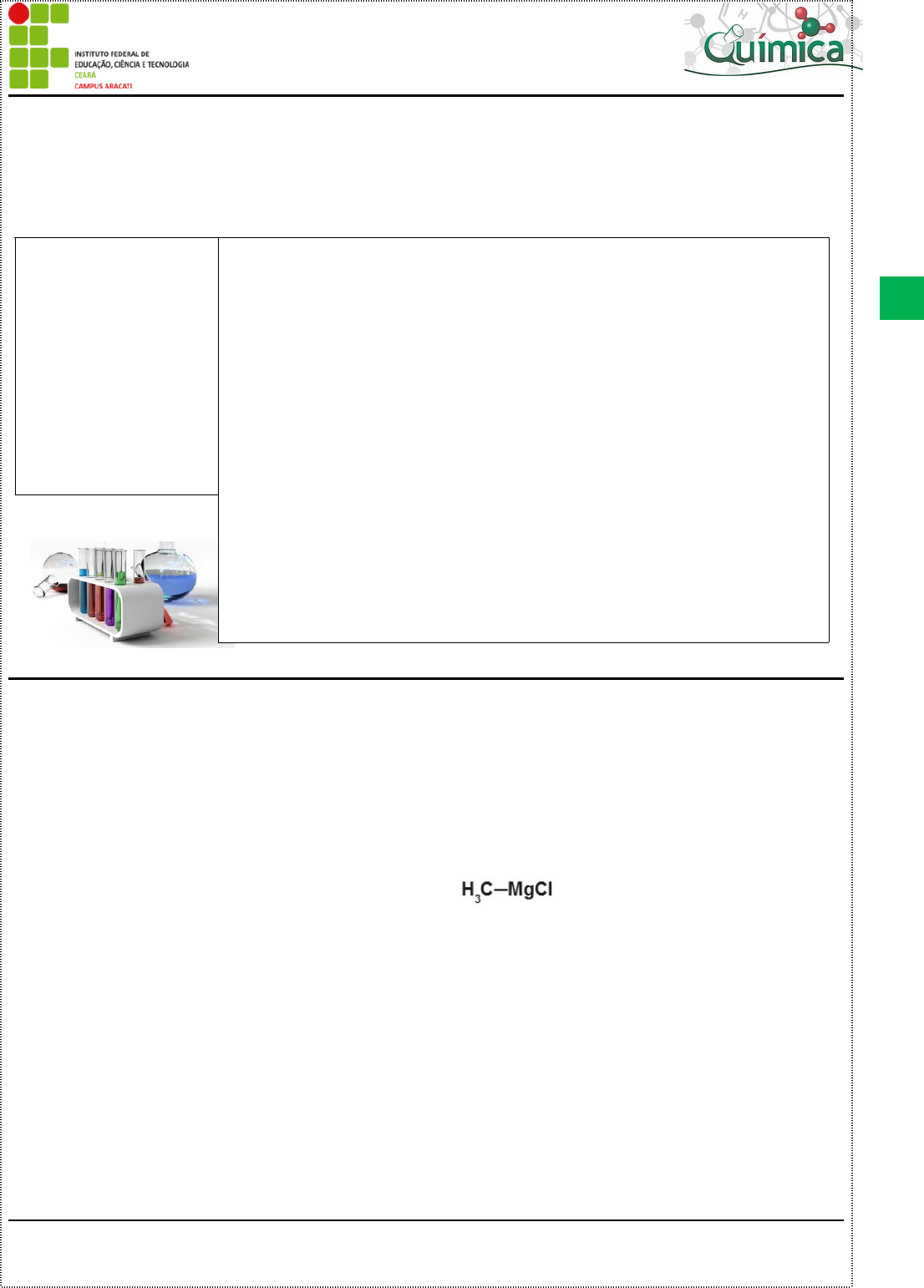 COMPOSTOS ORGANOMETÁLICOS – “CLORETO DE METIL – MAGNÉSIO” Rayza Barros Lucas *; Deyziane Silva Monteiro** – petroquímica, XII semestre, 2019 Instituto Federal do Ceará, Aracati - Ceará. _____________________________________________________________________________________________ ( Palavras Chaves: Compostos ; Organometálicos ; Reagentes de Gringnard ; Cloreto de Metil-magnésio ; ) ( Resumo: O presente artigo traduz as características de um composto organometálico , que são metais ou semi metais ligados diretamente ao carbono , sendo ele um reagente de Gringnard , onde o metal é o átomo de magnésio. O cloreto de met il-magnésio é formado a partir do cloreto de metila + magnésio em um éter anidro como solvente. Esse composto atua em diversas sínteses orgânicas, provendo a formação de alcoóis e entre outros compostos. Abstract: This article reflects the characteristics of an organometallic compound, which are metals or semi-metals bonded directly to carbon, being a Gringnard reagent, where the metal is the magnesium atom. Methyl magnesium chloride is formed from methyl chloride + magnesium in an anhydrous ether as a solvent. This compound acts in several organic syntheses, providing the formation of alcohols and among other compounds. Keywords: Compounds; Organometallic; Gringnard Reagents; Methyl magnesium chloride; ) REVISTA QUÍMICA FASCINANTE ( 1 )Divulgação de textos científicos LUCAS, R. B; MONTEIRO, D.S; Compostos Organometalicos – “Cloreto de mil-magnéseio”.Revista Química Fascinante 1, (2019.) 1. HISTÓRICO Dentre os compostos organometálicos, têm-se os compostos de Grignard ou Haletos de organomagnésio, os quais contêm pelo menos uma ligação carbono-metal. Os compostos de Grignard foram descobertos pelo francês François Auguste Victor Grignard em 1900, que foi um dos ganhadores do premio Nobel de Química em 1912, em função de uma descoberta que permitiu proporcionar a química orgânica um novo método de síntese, devido as suas altas reatividades químicas. Logo os haletos de orgnomagnésio são denominados Reagentes de Grignard. 2. NOMENCLATURA A regra de nomenclatura estabelecida pela União Internacional da Química Pura e Aplicada (IUPAC) para os reagentes de Gringnard é a seguinte: Cloreto, Brometo, Iodeto ou Fluoreto (nome anion do halogênio) + de + nome do radical orgânico + magnésio Para o composto de Grignard “Cloreto de metilmagnésio” com o cloro em sua composição, tem-se: na fórmula temos o átomo de cloro, logo seu anion será o Cloreto, ligado ao radical orgânico com um radical carbono que será o Metil, ligados ao Magnésio dessa forma teremos: Cloreto de metilmagnésio. 3. FORMAS DE SÍNTESE Conforme Solomons (2013, pág. 566), os reagentes de Gringnard são preparados pela reação de um haleto orgânico com magnésio metálico em um éter anidro como solvente. Et2O RX + Mg → RMgX Esses compostos organometálicos são obtidos através da reação entre um haleto de alquila ou arila com o magnésio em pó ou em fitas, estando ambos secos, isentos de água e na presença de éter. Nessas condições, o magnésio consegue se introduzir entre o carbono e o halogênio do haleto orgânico. 4. ESTRUTURA GEOMÉTRICA Figura 1 – Estrutura geométrica do Cloreto de Metil-Magnésio Fonte: Elaborado pelo autor. Nessa estrutura o grupo MgCl entrou no lugar do hidrogênio do radical orgânico. O cloreto de metil-magnésio tem uma estrutura geométrica tetraédrica. 4. APLICAÇÕES Os reagentes de Grignard são utilizados em sua maioria em diversas reações de síntese orgânica produzindo alcoóis, para a produção esses reagentes podem reagir com, acetonas, carbonilas e aldeídos. É de suma importância mencionar a atuação dos reagentes de Gringnard na preparação de compostos de diversos metais tais como chumbo, arsênio, silício, boro, alumínio, estanho, prata, ouro, mercúrio, fósforo e platina. Esses reagentes também estão inseridos nos processos de reações de hidrólise de haletos de alquil-magnésio na síntese de hidrocarbonetos parafínicos e olefinas, e na produção de aldeídos através de reações com ésteres de ácido, ou síntese de ácidos carboxílicos através da reação com gás carbônico em meio de éter. Segundo Solomons (2013), as formas de aplicações dos reagentes de Gringnard, são as seguintes: · Reações do reagente de Gringnard com Epóxidos (Oxiranos). Os reagentes de Gringnard reagem com Epóxidos (Oxiranos), proporcionando uma conveniente síntese de alcoóis. · Reações do reagente de Gringnard com Compostos Carbonilicos. As reações sintéticas mais importantes com os reagentes de Gringnard e compostos organolítio são aquelas em que eles reagem como nucleófilos e atacam um cabono insaturado – especialmente o carbono de um grupo carbonila. · Reagentes de Gringnard reagem com Formaldeído para dar um álcool primário. · Reagentes de Gringnard reagem com todos os outros aldeídos para dar uns alcoóis secundários. · Reagentes de Gringnard reagem com cetonas para dar uns alcoóis terciários. · Ésteres reagem com dois equivalentes molar de um reagente de Gringnard para formar alcoóis terciários. O simples reagente de Gringnard cloreto de metil magnésio (MeMgCl) pode ser encontrado comercialmente. 5. REATIVIDADES DOS HALETOS COM MAGNÉSIO A ordem de reatividade dos haletos com magnésio é: RI ˃ RBr ˃ RCl Esses haletos de organomagnésio quando envolvem arila, tem mais facilidade de preparação, a partir de brometos de arila e iodetos de arila. Os cloretos de arila reagem mais lentamente, como por exemplo: Cloreto de Metil-magnésio. 6. REFERÊNCIAS BIBLIOGRÁFICAS SOLOMONS, T. W. Graham, 1934- Química orgânica, volume 1/T. W. Graham Solomons, Craig B. Fryhle; tradução e revisão técnica Julio Carlos Afonso [et Al.]. – Rio de Janeiro: LTC, 2013.2v : il.