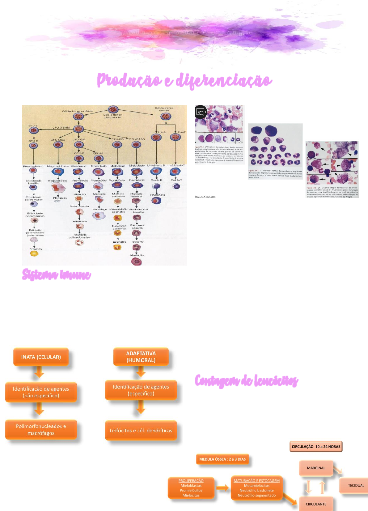 Leucograma Produção e diferenciação Sistema imune • Reconhecimento; • Contenção→ fagocitose; • Regulação→ processo inflamatório (P.I); • Memória. ❖ Parte inata fagocita e humoral cria memória. • Processo de divisão sincronizada; • Mais células maduras do que células jovens; • Neutrófilo→ é o leucócito que está em maior concentração no sangue periférico; • Processo de maturação e estocagem→ armazena neutrófilo segmentados e libera para circulação na quantidade fisiológica; • Compartimento marginal→ células aderidas nas paredes dos vasos e são liberadas em momentos de necessidade. • Diapedese→ saída de células da circulação até o tecido; • Normalmente nos mamíferos a proporção de leucócitos circulantes e marginais é de 1:1; • Em gatos os leucócitos marginais estão em maior quantidade e em caso de inativação das células de adesão ocorre uma leucocitose fisiológica. Contagem de leucócitos • Esfregaço sanguíneo; • Contagem diferencial de leucócitos→ relativa (%) x absoluta; • Usa-se o valor absoluto. Neutrófilos • Fagocitose e morte de micro-organismos, enfermidades imunomediadas e necrose tecidual; • Neutrofilia→ fisiológica, corticosteroides, inflamação, infecção, enfermidades imunomediadas e leucemias; • Neutropenia→ infecção aguda (bacteriana, viral), fármacos e radiação. Eosinófilos • Atuante em processos alérgicos e parasitários; • Eosinofilia→ parasitismo, hipersensibilidade (alergias), doenças eosinofílicas e lesão tecidual; • Eosinopenia→ inflamação aguda e corticosteroides. ❖ Corticóides causam lise de eosinófilos. Basófilos • Atuante em processos alérgicos e parasitários; • Basofilia→ (RARO) hipersensibilidade, dirofilariose e parasitismo intestinal; • Basopenia→ sem importância clínica. . Monócitos • Fagocitose, apresentação de antígenos para linfócitos, secreção de substâncias importantes para respostas inflamatórias (citocinas, interferon, interleucina...); • Secundária a ação dos neutrófilos, quando a ação dos neutrófilos não é suficiente; • Maiores que os neutrófilos, pode haver alguns vacúolos no citoplasma; • Monocitose→ corticosteroides, inflamação, necrose tecidual, processos supurativos, infecções crônicas (Leshmaniose); • Monocitopenia→ sem importância clínica. • Macrófagos são monócitos que estão atuando nos tecidos, primeira imagem, cheio de vacúolo, fagocitam neutrófilos (leucofagocitose), fagocitam restos celulares. Linfócitos • Imunidade celular (linfócito T) e humoral (linfócito B); • Linfocitose→ fisiológica, vacinação recente, leucemia (aumento da produção de uma célula sanguínea); • Linfopenia→ corticosteroides, infecção viral (muitos morrem por tentar inibir o vírus), processos inflamatórios agudos. (não deu tempo de mandar novas células); • Núcleo arredondado que ocupa quase toda a célula, citoplasma escasso. Leucócitos totais • Leucocitose→ aumento de leucócitos totais, processo inflamatório; • Leucopenia→ diminuição de leucócitos totais, infecção aguda (pode não ter dado tempo de produzir novos leucócitos). Interpretação Leucocitose fisiológica • Ação de catecolaminas, tipicamente por medo, excitação e exercício; • Liberação dos neutrófilos e linfócitos marginais; • Neutrofilia; • Linfocitose; • Aumento discreto e passageiro. • Repetir exame após. Leucocitose de estresse • Deslocamento marginal→ devido a inibição da produção de moléculas de adesão e estímulo de liberação de neutrófilos segmentados da medula óssea; • Ação de glicocorticóides; • Neutrofilia; • Linfopenia (causam lise de linfócitos); • Monocitose (principalmente em cães); • Eosinopenia (podem causar lise de eosinófilos); • Inibe as moléculas de adesão e estimula a liberação de algumas células do compartimento reserva.; • Repetir exame, se hiperadrenocorticismo descompensado irá ocorrer sempre. Desvio à esquerda • Neutrófilos imaturos/jovens (bastonetes); • Em processos graves aparece até meta- mielócitos; • Processo agudo; Desvio à esquerda regenerativo • Leucocitose por neutrofilia e bastonetes escalonamento maturativo preservado; • Número de bastonetes menor que neutrófilos segmentados. Desvio à esquerda degenerativo • Leucocitose por neutrofilia e bastonetes assincronia maturativa; • Número de bastonetes maior que neutrófilos segmentados Desvio à direita • Aumento na concentração de neutrófilos hipersegmentados; • Glicocorticóides→ devido a diminuição das moléculas de adesão, menos neutrófilos migram para os tecidos, ficando mais tempo na circulação (neutrófilos velhos); • Doenças inflamatórias crônicas. Leucemia - neoplasia sanguínea • Leucocitose expressiva (50.000 a 100.000/uL de sangue) • Linfócitica/monocítica. Neutropenia inflamatória • Doenças inflamatórias em estado hiperagudo ou muito graves. • Comum em bovinos, pois possuem o setor de estocagem relativamente pequeno. Neutropenia por hipoplasia granulocítica • Diminuição de produção por: ↪ Agentes infecciosos intramedulares; ↪ Agentes quimioterápicos; ↪ Sequestro por outros órgãos. Alterações morfológicas e inclusões Alterações tóxicas em neutrófilos • Processo ativo, agudo. • Granulações tóxicas; • Basofilia citoplasmática; • Vacuolização citoplasmática; • Corpúsculo de Dohle. Monócito reativo • Infecções mais graves. Linfócito tóxico • Resposta viral ou pós vacinais. Inclusões virais • Corpúsculo de Lentz. Inclusões bacterianas • Ehrlichia canis Fungos e protozoários • Leishmania • Histoplasma • Hepatozoon Casos clínicos Leucocitose com desvio à esquerda, neutrofilia, monocitose, com neutrófilos tóxicos intensos (atuantes). Processo inflamatório agudo regenerativo, suspeita de piometra, pe