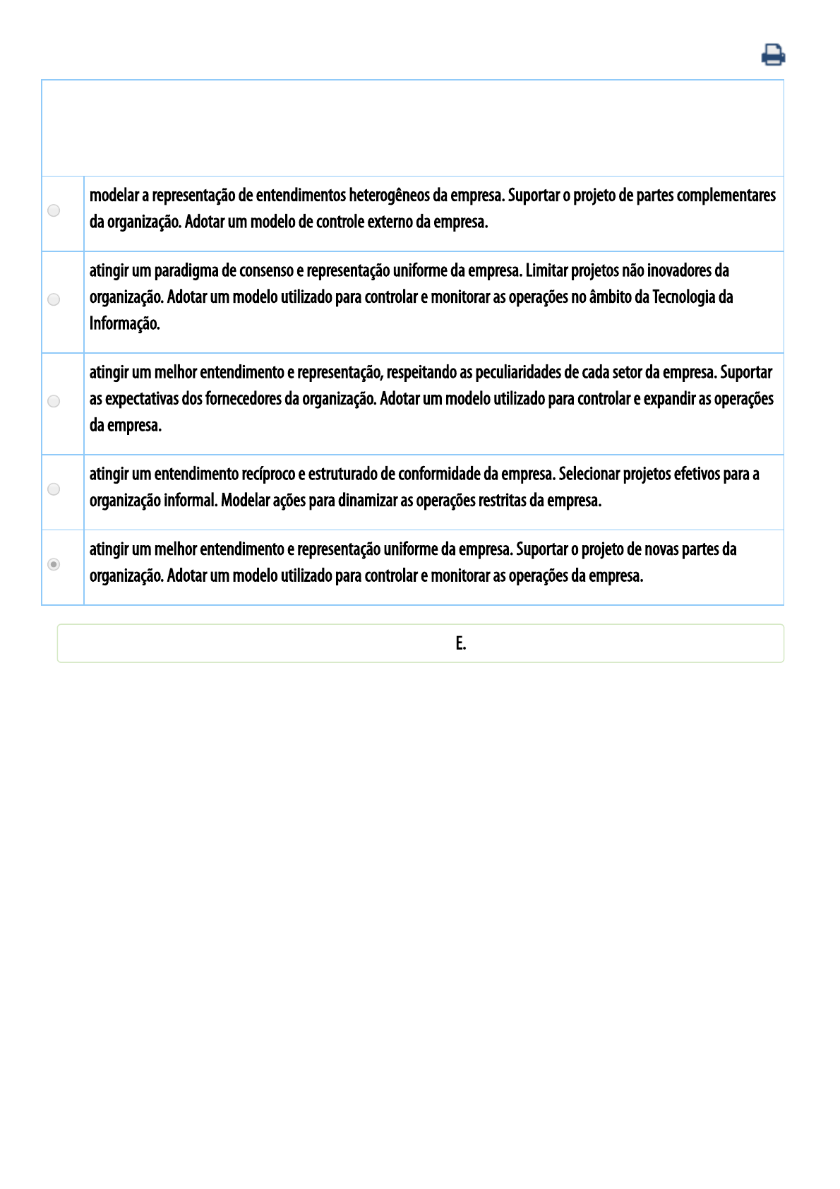 21/05/2020 Universidade Paulista - UNIP : Disciplina On-line. https://www.unip.br/presencial/central/Interna.aspx 1/1 ESAF - 2012 - Receita Federal - Analista Tributário da Receita Federal - Área Informática São objetivos da Modelagem de Processos A modelar a representação de entendimentos heterogêneos da empresa. Suportar o projeto de partes complementares da organização. Adotar um modelo de controle externo da empresa. B atingir um paradigma de consenso e representação uniforme da empresa. Limitar projetos não inovadores da organização. Adotar um modelo utilizado para controlar e monitorar as operações no âmbito da Tecnologia da Informação. C atingir um melhor entendimento e representação, respeitando as peculiaridades de cada setor da empresa. Suportar as expectativas dos fornecedores da organização. Adotar um modelo utilizado para controlar e expandir as operações da empresa. D atingir um entendimento recíproco e estruturado de conformidade da empresa. Selecionar projetos efetivos para a organização informal. Modelar ações para dinamizar as operações restritas da empresa. E atingir um melhor entendimento e representação uniforme da empresa. Suportar o projeto de novas partes da organização. Adotar um modelo utilizado para controlar e monitorar as operações da empresa. Você já respondeu e acertou esse exercício. A resposta correta é: E.