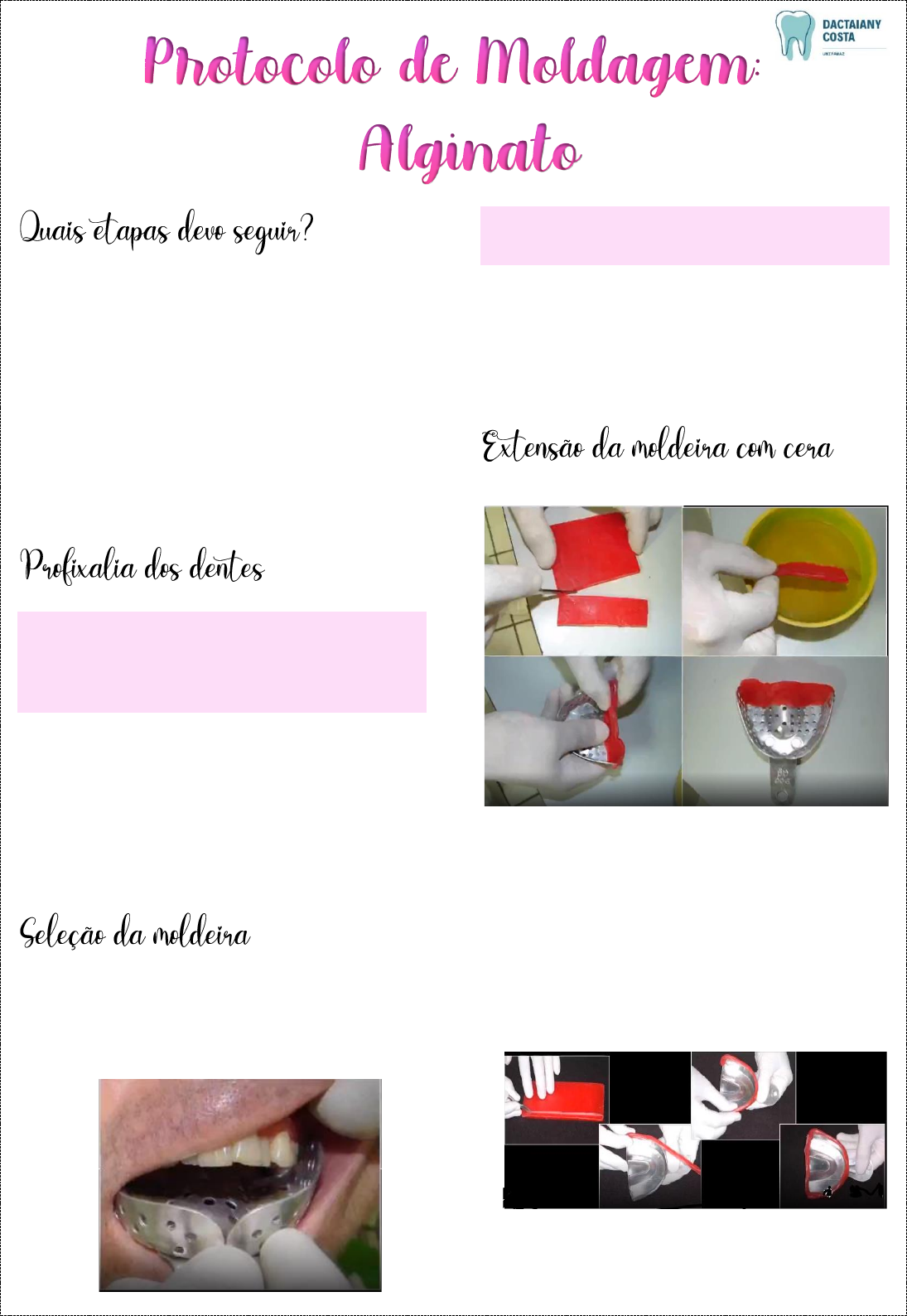 - Profilaxia dos dentes - Seleção da moldeira - Extensão da moldeira com cera - Proporção do alginato - Posicionamento do paciente - Moldagem propriamente dita. Ausência de placa bacteriana; Melhor qualidade no molde e consequentemente no modelo. - Pasta profilática - Fio dental - Escova de Robson - Peça de baixa rotação - Espessura mínima de 3 mm de material em todos os lados, proporcionando estabilidade dimensional. Escolher a moldeira ideal., nem grande e nem pequena.. - No sentido antero-posterior, a moldeira correta deve transpor o último molar, a região de tuberosidade do arco superior e a região do trígono no retromolar do arco inferior. - Personalização do palato, bordas e áreas edêntulas. - Com cera utilidade com 5mm de largura, iremos recobrir toda a borda da moldeira, fixando bem a cera. - Colocação de cera no palato e em áreas edêntulas; - Em seguida flambamos a cera e levamos à boca do paciente e fazemos manipulação dos lábios e bochechas tanto superior quanto inferior, mais movimento da língua para lateral e para cima.. - Retenção na cera para melhor aderência do alginato; - Personalização do palato também pode ser feita com godiva. - Essa extensão permite uma retenção mais apurada do alginato e propicia uma moldagem mais precisa a nível de fundo de vestíbulo. - A proporção água-pó: de acordo com o fabricante; - O tempo de trabalho pode ser alterado com a modificação da temperatura da água... temperatura tempo de trabalho temperatura tempo de trabalho - Arcada a ser moldada paralela ao solo. Arco superior: - Cotovelo na altura da comissura labial. - Encosto da cadeira: reto. Arco inferior: - Cotovelo na altura da comissura labial. -Encosto da cadeira: levemente inclinado. Caso o paciente sinta ânsia após a inserção da moldeira, instruí-lo para modificar sua posição. Ele deverá inclinar o tronco para frente e abaixar a cabeça, segurando o babador. Deve- se ensiná-lo a respirar compassado pelo nariz.. O pacientepode ter em mãos uma toalha ou um bababor. Antes da moldagem: Bochecho com água gelada, a fim de remover a saliva mais viscosa da cavidade oral, permitindo um modelo mais liso e sem bolhas. É conveniente iniciar a moldagem pelo arco inferior, já que esta causa menos desconforto ao paciente do que o arco superior. TÉCNICA DE MOLDAGEM - Sacodir a embalagem ou o pote para que tenha uma arefação do pó. - Obedecer a proporção água-pó de acordo com o fabricante. -Grau seco e limpo. - Colocar primeiro a água e depois o pó. - Realizar a espatulação por pelo menos 45 segundos. Espatulação insuficiente: resultará em mistura pulverulenta e cópia precária. Espatulação correta: proporciona mistura cremosa e lisa. - Colocar a massa na moldeira. - Levar à boca do paciente. Deixar um pouco de material no grau para verificar o momento do endurecimento. MOLDAGEM INFERIOR - Profissional a frente do paciente; - Alginato na oclusal dos dentes; - Centralização da moldeira na linha mediana; - O aprofundamento da moldeira é feto de frente para trás e a língua deve ser levantada até o palato para a impressão do freio da língua. - A tração do lábio e bochechas permite reprodução das musculaturas.; - Lavar para tirar os resíduos sólidos e líquidos como saliva. - Fazer a desinfeção borrifando Glutanoaldeído 2%, e deixar agir por 10 minutos em um depósito com tampa ou dentro de um saco. - Lavar e secar. - Complementar a parte da língua. com alginato. MOLDAGEM SUPERIOR - Profissional atrás do paciente; - Alginato na oclusal dos dentes; - Introdução da moldeira diagonalmente; - Aprofundamento da moldeira de posterior para anterior; - Tração dos lábios e bochechas. - Lavar para tirar os resíduos sólidos e líquidos como saliva. - Fazer a desinfeção borrifando Glutaraldeído a 2%, e deixar agir por 10 minutos em um depósito com tampa ou dentro de um saco. - Lavar e secar. - Recorte dos excessos de alginato. Caso você não recorte o molde imediatamente, não deixe que ele fique ressecado, coloque um papel úmido em cima. Homogenização das partículas de pó à água (mistura cremosa): - Superfície mais homogênea dos modelos de gesso. VAZAMENTO DO GESSO: - O uso do vibrador é necessário. - O gesso é colocado na porção dos dentes em pequenas quantidades com espátula ou com um pincel, use um vibrador para acomodar melhor o gesso. - Ao vazar vertes a mistura em pequenas proporções, colocando só um pouco da margem correspondente à região da abóbada palatina e sob vibração leve, a mistura deve escoar suavemente por todos os acidentes da superfície do molde, expulsando o ar e evitando bolhas. - Presa: 30 minutos; - Recorte dos excessos.