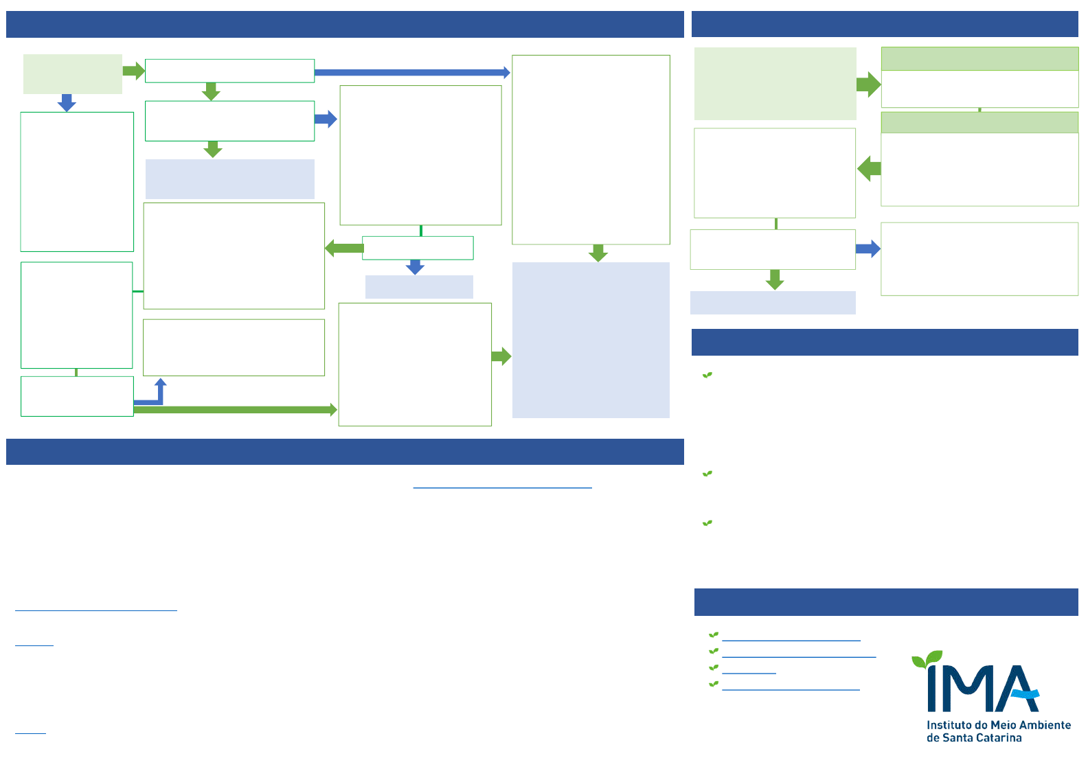 Ocorrendo alguma divergência ao receber a licença, o empreendedor pode solicitar a correção do conteúdo, no prazo de 20 dias a contar da data de recebimento da licença. O mesmo prazo se aplica quando o empreendedor desejar proceder com recurso à decisão proferida em ata da CCLA ou CRLA. A alteração na titularidade do empreendimento deve ser comunicada ao IMA. A mudança de local depende de novo licenciamento prévio. Quando houver necessidade de supressão de vegetação, o empreendedor deve requerer a Autorização de Corte (AuC) de Vegetação na fase de Licença Ambiental Prévia. Atividade licenciável: Todas as atividades dispostas no Anexo IV da Resolução CONSEMA 98/2017. Declaração de atividade não constante: Documento emitido pelo IMA para atividades não listadas no Anexo IV da Resolução CONSEMA 98/2017. Certidão de conformidade ambiental: Documento emitido pelo IMA com base na apresentação de Declaração de Conformidade Ambiental, aplicável às atividades licenciáveis. Ver Instrução Normativa nº34. Autorização ambiental (AuA): Documento de licenciamento ambiental simplificado, constituído por um único ato, que aprova a localização e concepção da atividade, bem como sua implantação e operação. Instruções normativas (IN): Apresentam orientações específicas para cada atividade licenciável, com o rol de documentos a ser apresentado em cada etapa do licenciamento. SinFAT: Sistema online que gerencia o processo de licenciamento. Por meio dele o empreendedor envia e acompanha o seu pedido em tempo real, e o Instituto promove a análise técnica. Código FCEI: Código composto por 6 números que identificam a formalização da solicitação de uma análise de licenciamento no SinFAT (LAP, ampliação de LAP, LAI, ampliação de LAI, renovação de LAI, LAO, LAO corretiva, renovação de LAO, ampliação de LAO, AuA e AuC). SGPe: Sistema de Gestão de Protocolo Eletrônico, plataforma do Estado utilizada para tramitar e consultar os documentos digitais protocolados junto ao órgão. DEFINIÇÕES INFORMAÇÕES CONSULTAS Pautas e Atas CCLA/CRLA Licenças/certidões emitidas EIA/RIMA Laboratórios acreditados FLUXOGRAMA LICENCIAMENTO - IMA Emissão da licença. Recebimento no SinFAT de solicitação de processo de licenciamento ambiental (FCEI). Parecer submetido à CCLA ou CRLA, à exceção de renovação de LAO e licenciamento com RAP ou Autorização ambiental. Designação da equipe de análise do processo GERENTE Sim Decisão da CCLA/CRLA declarada em Ata. O empreendedor poderá proceder com recurso (vide “informações”). EQUIPE TÉCNICA Análise técnica Vistoria técnica Solicitação de complementações Elaboração do parecer técnico Parecer deferido pela emissão da licença? Não FLUXOGRAMA LICENCIAMENTO - EMPREENDEDOR Sim Empreendimento novo? Não há obrigação de licenciamento. Caso necessário, pode-se solicitar Declaração de atividade não constante no SinFAT. Não Sim Não Solicitação de Licença Ambiental Prévia (LAP), ou de Autorização Ambiental (AuA) no SinFAT com apresentação de documentação conforme Instrução Normativa específica Solicitação de Licença Ambiental de Operação (LAO) corretiva ou Renovação de LAO (atividades devidamente licenciadas), AuA ou ampliação de LAP/LAI/LAO no SinFAT. As ampliações seguem os mesmos trâmites das licenças primárias. Fim do processo Solicitação de Licença Ambiental de Instalação (LAI) no SinFAT com apresentação de documentação conforme Instrução Normativa específica Emissão da LAI e Autorização de Corte (AuC), quando houver corte de vegetação Solicitação de Licença Ambiental de Operação (LAO) no SinFAT com apresentação de documentação conforme Instrução Normativa específica Solicitação de prorrogação de prazo. LAI pode ter vigência de até 6 anos. Emissão da LAO. Operação do empreendimento autorizada até o prazo de vigência da licença. A solicitação de renovação de LAO deve ser realizada em até 120 dias antes do término da sua vigência. Atividade licenciável? LAP aprovada? Porte menor que o porte mínimo de licenciamento? Sim Solicitar Certidão de Conformidade Ambiental. Não Obras concluídas no prazo da LAI? Não Sim Não Sim