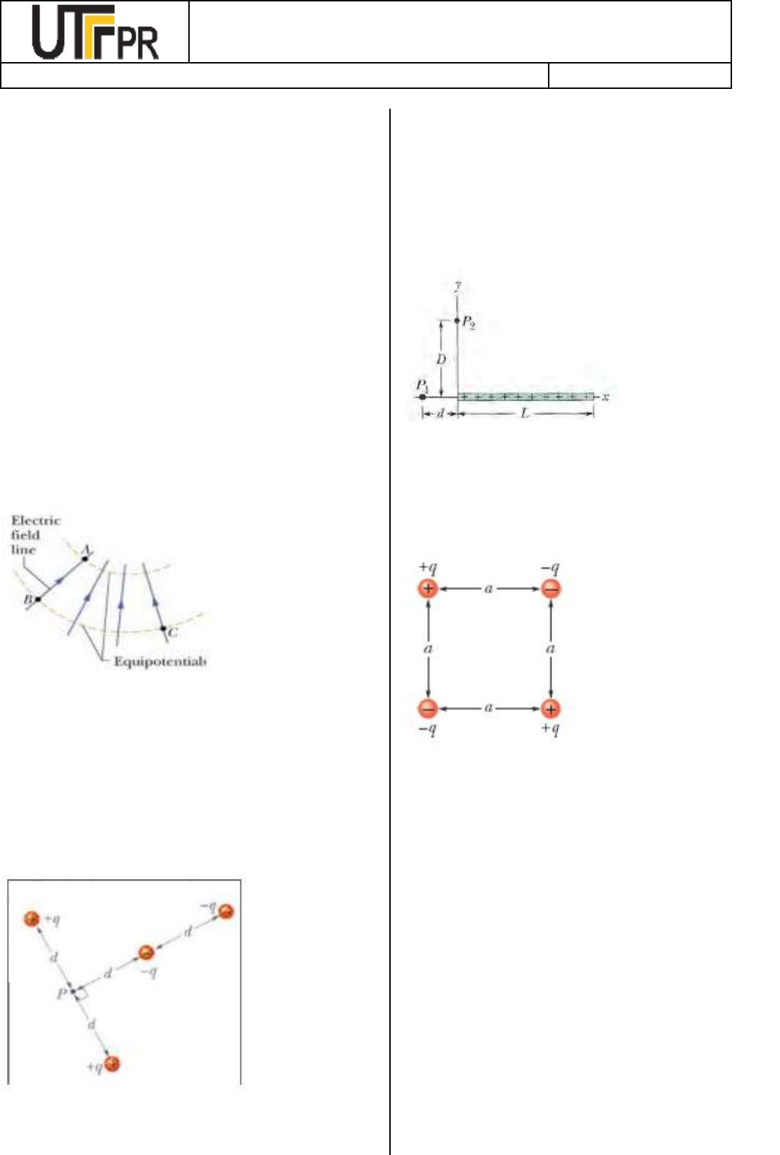 Universidade Tecnológica Federal do Paraná – UTFPR Lista 4 e 5 de Física 3: capítulo 24 e 25 Professora Letícia de Oliveira NOME: Data: 1. Boa parte do material dos anéis de Saturno está na forma de pequenos grãos de poeira com um raio da ordem de 10 -6 m. Os grãos se encontram em uma região onde existe um gás ionizado rarefeito e podem acumular elétrons em excesso. Suponha que os grãos são esféricos, com um raio R = 1,0x10 -6 m. Quantos elétrons um grão teriaque recolher para adquirir um potencial de -400 V na superfície? (Considere V = 0 no infinito.). R: 2,8.10 5 grãos de poeira 2. Na Figura a seguir, quando um elétron se desloca de A até B ao longo de uma linha de campo elétrico, esse campo realiza um trabalho de 3,94x10 -19 J. Qual é a diferença de potencial elétrico: (a)VA – VB. R: 2,46V (b)VC – VA. R: 2,46V (c)VC – VB. R: 0 3. Determine (a) a carga e (b) a densidade superficial de cargas de uma esfera condutora de 0,15 m de raio cujo potencial é 200 V (considerando V= O no infinito). R: a. 3,34.10 -9 C, b. 1,18.10 -8 C/m ² 4. Na Figura, qual é o potencial elétrico no ponto P devido às quatro partículas se V= O no infinito, q = 5,00 fC e d= 4,00 cm? R: 5,62.10 -4 V 5. A figura mostra uma barra fina de plástico que coincide com o eixo x. A barra tem um comprimento L = 12,0 cm e uma carga positiva uniforme Q = 56, 1 fC uniformemente distribuída. Com V= O no infinito, determine o potencial elétrico no ponto P1 do eixo x, a uma distância d = 2,50 cm de uma das extremidades da barra. R: 7,39.10 -3 V 6. Qual é o trabalho necessário para montar o arranjo da Fig. 24-52, se q = 2,30 pC, a = 64,0 cm e as partículas estão inicialmente em repouso e infinitamente afastadas umas das outras? R: -1,92.10 - 13 7. Qual é a carga em excesso de uma esfera condutora de raio r = 0,15 m se o potencial da esfera é 1500 V e V = 0 no infinito? R: 2,5.10 -8 C 1. O capacitar da Fig. 25-25 possui uma capacitância de 25 μ,F e está inicialmente descarregado. A bateria produz uma diferença de potencial de 120 V. Quando a chave S é fe- chada, qual é a carga total que passa por ela? R: 3 mC. 2. Um capacitor de placas paralelas possui placas circulares de raio 8,2 cm e separadas por uma distânciade 1,3 mm. (a) Calcule a capacitância. (b) Que carga aparecerá sobre as placas se a ddp aplicada for de 120 V? R: a) 144 pF. b) 17.3 nC 3. A placa e o catodo de um diodo a vácuo tem a forma de dois cilindros concêntricos com a catodo sendo o cilindro central. O diametro do catodo é de 1.6 mm e o diâmetro da placa é de 18 mm; os dois elementos tem comprimento de 2,4 cm. Calcular a capacitância do diodo. R: 0.551 pF. 4. Quantos capacitores de 1 µF devem ser ligados em paralelo para acumularem uma carga de 1 C com um potencial de 110 V atraves dos capacitores? R: 9091 5. Determine a capacitância equivalente da combinação a seguir, para C1 = 10 µF, C2 = 5 µF e C3 = 4 µF. R: 3.15 µF. 6. Determine a capacitância equivalente do circuito para C1 = 10,0 μ,F, C2 = 5,00 μ,F e C3 = 4,00 μ,F. R: 7.33 µF. 7. Uma capacitancia C1 = 6 µF e ligada em série com uma capacitancia C2 = 4 µF e uma diferença de potencial de 200 V e aplicada através do par. (a) Calcule a capacitancia equivalente. (b) Qual e a carga em cada capacitor? (c) Qual a diferença de potencial através de cada capacitor? 8. Que capacitancia é necessária para armazenar uma energia de 10 kW·h sob uma diferença de potencial de 1000 V? R: 72 F. 9. Dois capacitores, de capacitancia 2µF e 4µF, são ligados em paralelo atravs de uma diferença de potencial de 300V. Calcular a energia total armazenada nos capacitores. R: 0,27J 10. Dado um capacitor de 7.4 pF, cheio de ar, pedimos converte-lo num capacitor que armazene 7,4µJ com uma diferença de potencial maxima de 652V. Qual dos dielétricos listados na Tabela abaixo, poderia ser usado para preencher a lacuna de ar do capacitor? 11. Uma certa substancia tem uma constante dielétrica de 2.8 e uma rigidez dielétrica de 18 MV/m. Se a usarmos como material dielétrico num capacitor de placas paralelas, qual deverá ser a área mínima das placas para que a capacitância seja de 7×10 −2 µF e para que o capacitor seja capaz de resistir a uma diferença de potencial de 4 kV? R: 0.63 m 2 . 12. Um capacitor de placas paralelas tem uma capacitância de 100 pF, placas de area igual a 100 cm 2 e usa mica como dieletrico (κ=5.4). Para uma diferençaa de potencial de 50 V, calcule: (a) o módulo do campo elétrico no interior do dielétrico. b) o módulo da carga livre sobre as placas, e (c) o módulo da carga superficial induzida. R: a) 1 × 10 4 V/m. b) 5 × 10 −9 C. c) 4.1 nC.