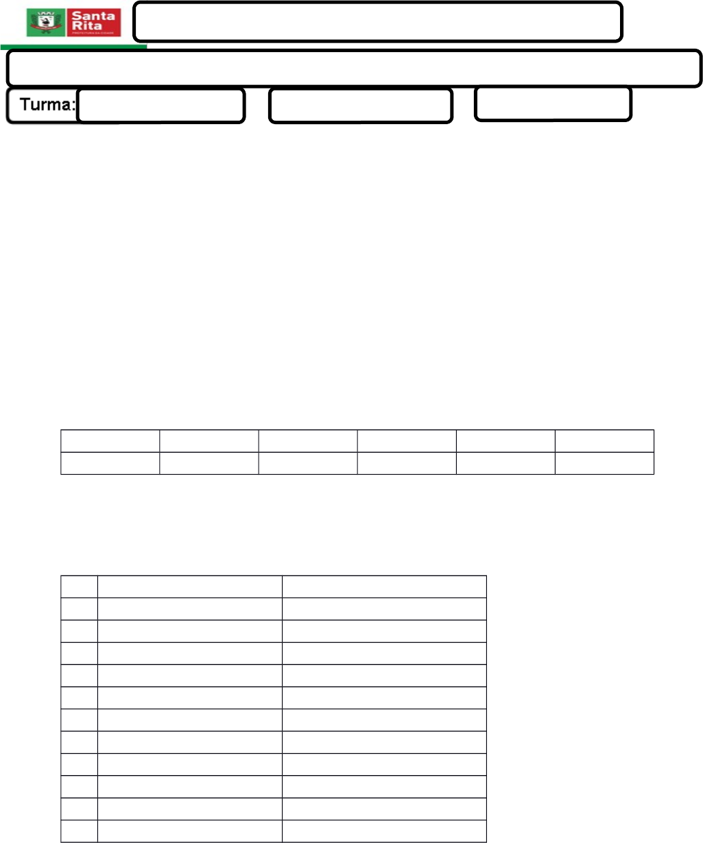 Aluno(a): ___________________________________________________________ E.M.E.F cProf}______________________________________________ TURNO:___________________ ____ Prof. KaKarina_____________ Data:___/_____/ _____ EIXO 1: Cuidados com o corpo: higiene e saúde Semana 1:Atividade de Língua Portuguesa O CORONAVÍRUS causa uma infecção respiratória que pode ser confundida com uma gripe. O novo agente foi descoberto em dezembro do ano passado na China. A Organização Mundial de Saúde(OMS) declarou emergência de saúde pública GLOBAL por conta da PANDEMIA e, recentemente definiu que a doença será chamada de Covid19. Entre os SINTOMAS estão FEBRE, falta de ar, TOSSE, e sintomas gástricos. Os especialistas citam como forma de PREVENÇÃO a HIGIENIZAÇÃO das mãos, manter ambientes bem VENTILADOS e COBRIR o nariz e a boca quando espirrar ou tossir. 1-Coloque as palavras abaixo na ordem alfabética: Espirro sintomas máscara contato álcool gripe olhos lenço vírus hospital doença boca ________________________________________________________________________________________________________________________ 2- Forme 2 palavras com a letra inicial da palavra abaixo: C O R O N A V I R U S ...TURNO:___________________ ____ Prof. KaKarina_____________ Aluno(a): ___________________________________________________________ E.M.E.F cProf}______________________________________________ 1- Resolva os cálculos formando palavras e depois descubra a frase: Data:___/_____/ _____ EIXO 1: Cuidados com o corpo: higiene e saúde Semana 1:Atividade de Matemática A MATEMÁTICA DO CORONAVÍRUS PROBLEMATIZANDO... 1- Resolva os cálculos formando palavras e depois descubra a frase: 76 45 30 3 16 57 13 9 ção Quan Mais to pre pro te ven 20+25 10-7 14+16 35-19 15-6 34+42 25+5 26+31 65-52 100-24 Frase 2- Boletim do coronavírus na Paraíba: 11.132 casos confirmados, 318 mortes, 8.495 casos descartados, 2.430 recuperados. 1. 3.472 em João Pessoa, 1.180 em Campina Grande, 644 em Cabedelo, 581 em Santa Rita, 493 em Guarabira, 478 em Patos, 296 em Caaporã, 263 em Bayeux, 189 em Pedras de Fogo, 184 em Sapé, (Paraíba1, 28/05/2020) A)Quantos casos existem de coronavírus em Santa Rita no dia 28/05/2020? ____________________________________________________________ B)Quantos casos existem na Paraíba? ____________________________________________________________ C)Some( +) os casos de Bayeux e Santa Rita? ____________________________________________________________ D)Qual o número de mortes na Paraíba? ____________________________________________________________