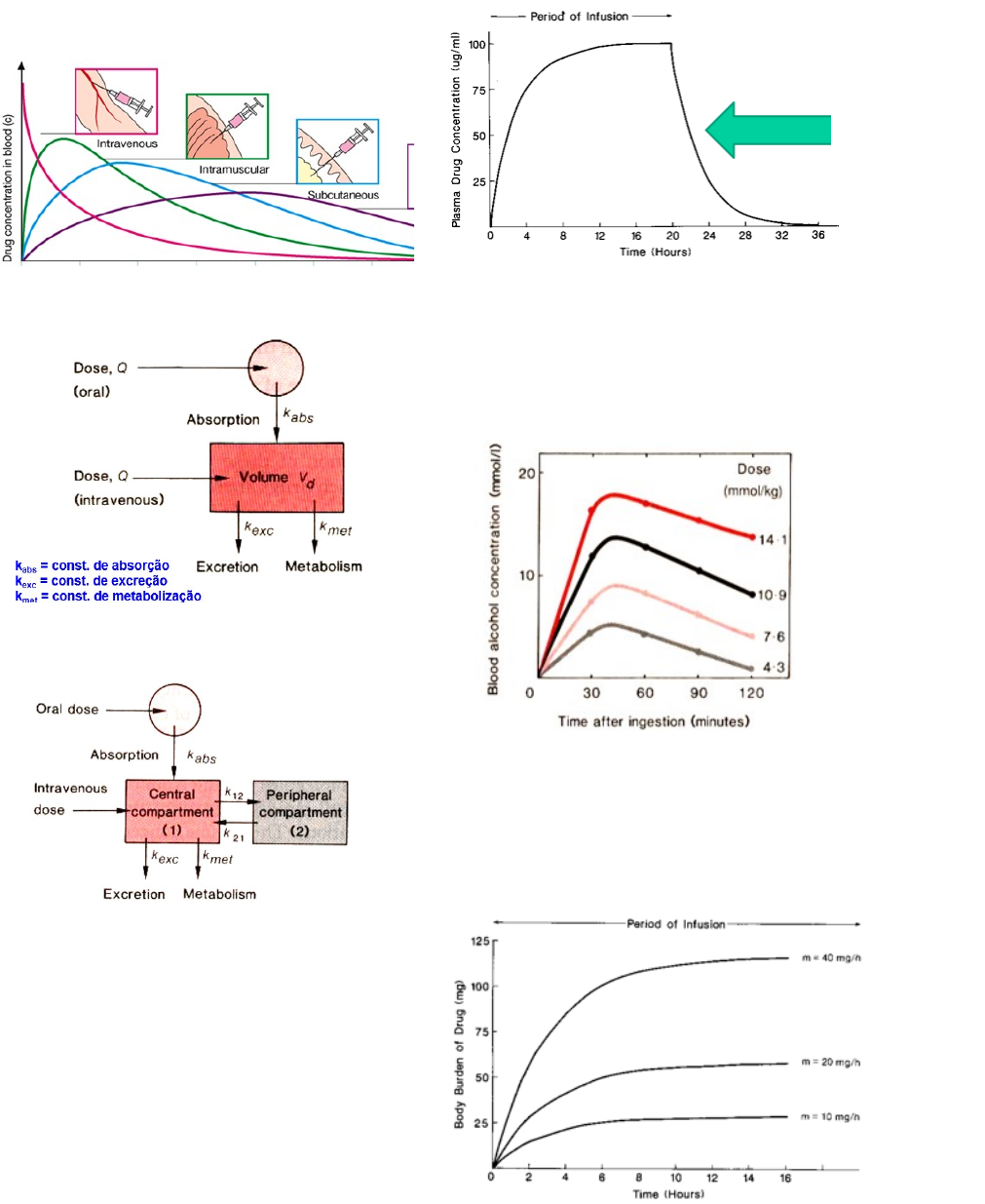 Farmacologia Farmacocinética Influência da via administração: Modelo unicompartimental: Modelo bicompartimental: Cinética de infusão: A cinética de eliminação do fármaco é um espelho da cinética de acumulação Influência da dose: A dose influencia a velocidade de absorção, mas não afeta o tempo para atingir o pico ou a velocidade de eliminação. A velocidade de infusão influencia a concentração final da circulação (supondo a mesma velocidade nas três doses) Parâmetros Farmacocinéticos: Ka = Constante de absorção · Constante da velocidade de absorção para uma via que não seja endovenosa Concentração plasmática máxima – Cmax · Pico da concentração · Não se aplica para via endovenosa Tempo onde ocorre o Cmax – Tmax · Tempo em que leva para chegar ao pico de concentração · Não se aplica para a via endovenosa Obs: Cmax e Tmax não são parâmetros fixos para uma substância, depende do intervalo de dosagem de amostragem que é feito no indivíduo. Área sobre a curva (ASC) Biodisponibilidade: fração do fármaco administrado que alcança a circulação sistêmica na forma química inalterada. Fatores que afetam: 1. Efeito de primeira passagem 2. Solubilidade do fármaco 3. Estabilidade do fármaco 4. Formulação do fármaco Concentração Plasmática no tempo zero (Cp°) Volume de Distribuição (Vd): Depuração / Clearance (CL): reflete a eliminação total da substância do nosso organismo · É um dos parâmetros farmacocinéticos mais importantes para determinar a dose do fármaco a ser administrado ao paciente. · Representa ao volume do plasma que é limpo ou depurado de fármaco por unidade tempo como consequência do metabolismo e da excreção expressa em volume/tempo · CL e Vd são independentes mas juntos determinam a meia vida do fármaco no organismo Fração de extração (FE): Fração da droga que é removida da circulação por um determinado órgão Ca= concentração na artéria Cv= concentração na veia · Se Cv = 0, temos FE = 1, ou seja, 100% do fármaco foi extraído da circulação pelo órgão em questão. O órgão neste caso possui alta capacidade de extração para este fármaco. · Se Cv= Ca temos FE = 0, ou seja, o fármaco não é extraído da circulação pelo órgão em questão. O órgão neste caso não possui capacidade de extração para este fármaco. Depuração/Clerance: é geralmente constante Depuração renal: Depuração hepática: Constante de Eliminação: indica a velocidade com que a substância é eliminada na fase terminal Obs: a forma de administração nõo afeta a cinética de eliminação e Kel Tempo de Meia vida (t1/2): tempo necessário para a substância cair em 50% · Para eliminar o fármaco são necessárias 5 meias-vidas. · Para atingir a faixa terapêutica desejada são necessárias 5 meias-vidas Os intervalos de dosagem mais comuns são 4, 6, 8, 12 e 24: todos múltiplos de 24 h Falha na administreação do fármaco: Relações importantes: Depuração: 1. CL = k x Vd 2. CL = 0,693/t1/2 x Vd 3. Vd = CL ÷ k 4. k = CL ÷ Vd - Influenciado pela ligação proteica do fármaco. - CL não é influenciado pela dose administrada