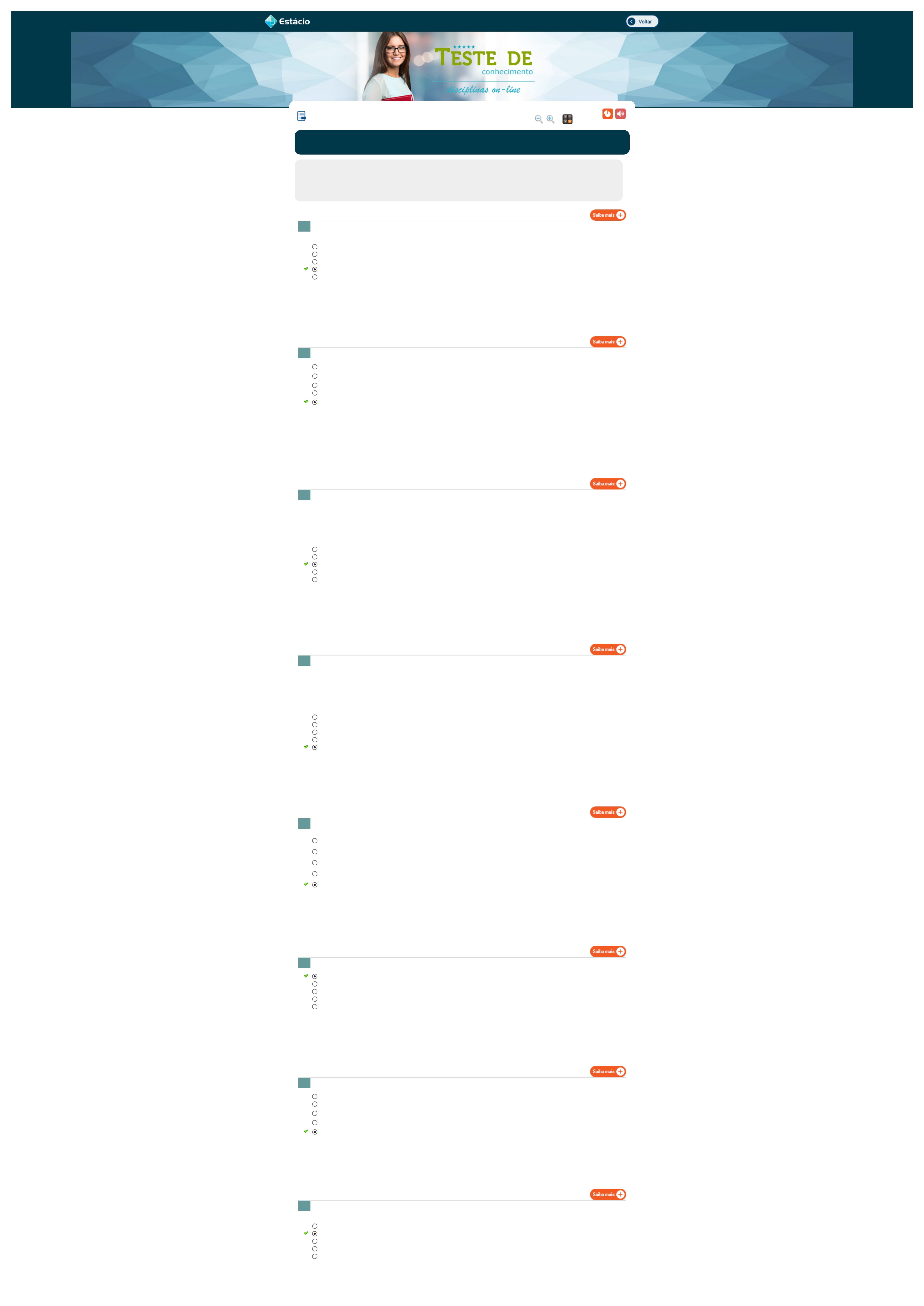 26/05/2020 Estácio: Alunos estacio.webaula.com.br/Classroom/index.html?id=2711872&courseId=705&classId=1252995&topicId=3024965&p0=03c7c0ace395d80182db07ae2c30f034&enableForum=S&enableMessage=S&enableClassMate=S 1/2 8. A criança está brincando com um chaveiro, a mãe com medo que ela se machuque entra na brincadeira e disfarçadamente esconde o chaveiro, a criança logo começa a brincar com outra coisa. Nesse momento, a criança passa a acreditar que o chaveiro deixou de existir. Essa experiência cognitiva indica a ausência do princípio da ______________ que é característica do estágio _______________ Assinale a alternativa que expressa a importância da Psicologia do Desenvolvimento e da Aprendizagem na formação de educadores: Em seus estudos, Piaget partiu de pesquisas baseadas na observação e entrevistas que realizou com crianças. Interessou-se fundamentalmente pelas relações que se estabelecem entre o sujeito que conhece e o mundo que tenta conhecer. Piaget considerou-se um epistemológico genético, porque investigou a natureza e a gênese do conhecimento nos seus processos e estágios do desenvolvimento. Sendo assim, a abordagem de Piaget é considerada: (IAMSPE/SP, 2012) Leia os seguintes itens I. Maturação é um conceito que se refere à dimensão biológica, física e evolutiva das pessoas, como o crescimento de ossos e o aumento de peso corporal. II. Desenvolvimento é um conceito que se refere à construção de capacidades e funções humanas como a linguagem, bem como o desenvolvimento de características físicas. III. Aprendizagem é um conceito que se refere à incorporação de novos conhecimentos e valores de uma determinada sociedade. Está correto o que se afirma em: Um importante conceito da Psicologia Humanista, elaborado por Carl Rogers e adotado como premissa de uma teoria de aprendizagem, é a empatia. Assinale a única alternativa em que o professor se mostra empático na situação de aprendizagem. 11. Palavra que não está contida no modelo humanista de aprendizagem: Marque a resposta correta: A Psicologia do Desenvolvimento tem como objetivo: Marque a alternativa em que todas as palavras estão de acordo com a Psicometria, teoria da psicologia de base inatista que atingiu seu auge no início do século XX e que veio a se refletir em nosso sistema educacional brasileiro, oferecendo explicações acerca do rendimento escolar que seria medido pelo instrumento prova: PSICOLOGIA DO DESENVOLVIMENTO E DA APRENDIZAGEM Lupa Calc. PPT MP3 CEL0241_A1_201908404566_V7 Aluno: JANAINA EDUARDO Matr.: 201908404566 Disc.: PSIC.DESENV.APREND. 2020.1 - F (G) / EX Prezado (a) Aluno(a), Você fará agora seu TESTE DE CONHECIMENTO! Lembre-se que este exercício é opcional, mas não valerá ponto para sua avaliação. O mesmo será composto de questões de múltipla escolha. Após responde cada questão, você terá acesso ao gabarito comentado e/ou à explicação da mesma. Aproveite para se familiarizar com este modelo de questões que será usado na sua AV e AVS. 1. adaptação ¿ sensório-motor acomodação ¿ pré-operacional assimilação ¿ sensório-motor . permanência do objeto ¿ sensório-motor permanência do objeto ¿ operacional concreto Explicação: Permanência do objeto e sensório motor 2. Nenhuma das alternativas está correta. A didática é bastante importante para educadores, por isso, ferramentas pedagógicas são fundamentais para o currículo de quem trabalha na área da educação. O contexto organizacional deve ser compreendido pelo educador para que ele possa fazer uma boa gestão de pessoas nas instituições de ensino. Os educadores necessitam compreender os processos institucionais e organizacionais para sua atuação em escolas e instituições de ensino. Educar uma criança, ensiná-la, evitando perturbações em seu comportamento, exige do adulto/educador, além de amor e dedicação, o conhecimento das características infantis em cada fase do desenvolvimento: seus interesses, necessidades, motivações e possibilidades. Explicação: Educar uma criança, ensiná-la, evitando perturbações em seu comportamento, exige do adulto, além de amor e dedicação, o conhecimento das características infantis em cada fase do desenvolvimento: seus interesses, necessidades, motivações e possibilidades. Para ensinar uma atividade a uma criança, precisa-se saber como a criança é, se está madura para aquela atividade, como poderá ser motivada, quais os melhores meios de ensiná-la e de tornar duradoura a aprendizagem. 3. MECANICISTA SOCIOINTERACIONISTA INTERACIONISTA CULTURALISTA SOCIO-HISTÓRICA Explicação: A abordagem de Jean Piaget é considerada de base interacionista, pois ele busca explicação para os fenômenos nos fatores interno (aspecto biológico) e externo (grupos sociais imediatos, tais como a família e a escola principalmente). 4. II e III, apenas. I e III, apenas. III, apenas. II, apenas. I, II e III. Explicação: Caracterísitcas físicas, linguagem. 5. Ao final da prova, a turma pede para saber o gabarito da prova de matemática, pois muitos passaram a semana estudando e estão bastante ansiosos. O professor é enfático ao responder que o resultado só seria dado somente no dia seguinte. Durante a prova de matemática, um aluno pergunta se pode utilizar a calculadora, e o professor responde para ele com uma pergunta: "O que você acha?" Ao término da prova de matemática, os alunos saem bastante revoltados, pois duas questões não faziam parte do conteúdo trabalhado. O professor ouve a turma, não concorda com a argumentação dos alunos e não anula as questões. Ao perceber que os alunos saíram da prova de matemática mais cedo para ouvirem um programa de música funk no corredor da escola, o professor desqualifica aquele tipo de música e corrige com mais exigência as provas dos referidos alunos. No momento em que o professor vai apresentar as notas da prova de matemática, ele chama individualmente c