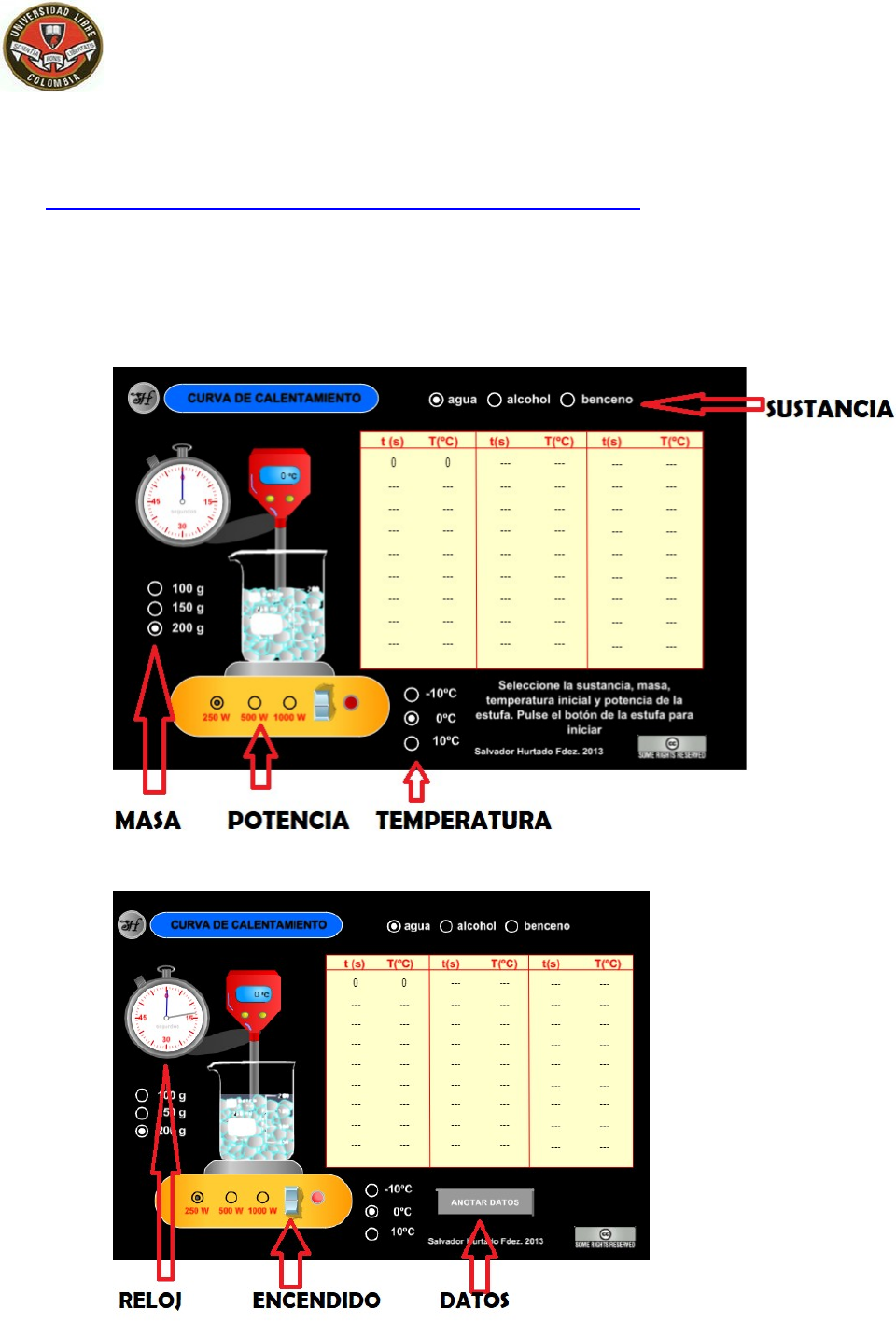 UNIVERSIDAD LIBRE – SECCIONAL SOCORRO FACULTAD DE CIENCIAS DE LA EDUCACIÓN PROGRAMA DE LICENCIATURA EN CIENCIAS NATURALES Y EDUCACIÓN AMBIENTAL LABORATORIO: CURVA DE CALENTAMIENTO http://labovirtual.blogspot.com/2014/04/curva-de-calentamiento.html ACTIVIDADES Determinación de los puntos de fusión y de ebullición. Curva de calentamiento 1. Selecciona una potencia de 500 w, una masa de 150 g, de sustancia toma benceno y una temperatura inicial de -10 ºC . 2. Ve anotando la temperatura, tomar al menos 20 valores espaciados, cada 5 segundos. (pegar pantallazo) 3. Dibuja la gráfica temperatura frente a tiempo 4. ¿Cuál es el punto de fusión y el punto de ebullición para el benceno? Investigamos los factores que afectan al calentamiento de un líquido La masa de sustancia 1. Selecciona una potencia de 250 w, una masa de 100 g, de sustancia toma agua y una temperatura inicial de 10 ºC . 2. Ve anotando la temperatura, procura tomar al menos 8 valores espaciados (cada 15 segundos). (pegar pantallazo) 3. Repite la anterior experiencia, pero variando la masa 150 g y 200 g (pegar pantallazo de cada uno) 4. ¿Qué conclusión obtienes? La potencia de la estufa 1. Selecciona una potencia de 250 w, una masa de 100 g, de sustancia toma agua y una temperatura inicial de 10 ºC. 2. Ve anotando la temperatura, procura tomar al menos 8 valores espaciados (cada 10 segundos). (pegar pantallazo) 5. Repite la anterior experiencia, pero variando la potencia de la estufa 500 w y 1000 w (pegar pantallazo de cada uno) 3. ¿Qué conclusión obtienes? La naturaleza de la sustancia 1. Selecciona una potencia de 250 w, una masa de 200 g, de sustancia toma agua y una temperatura inicial de 10 ºC . 2. Ve anotando la temperatura, procura tomar al menos 8 valores espaciados (cada 15 segundos). (pegar pantallazo) 3. Repite la anterior experiencia, pero variando la sustancia alcohol y benceno (pegar pantallazo) 4. ¿Qué conclusión obtienes?