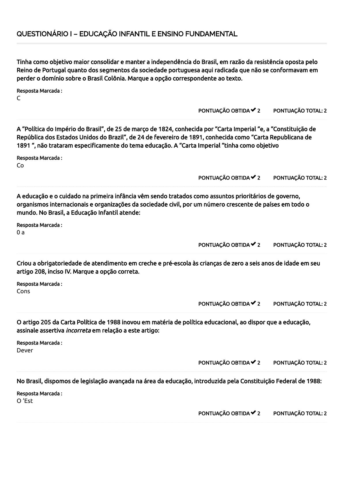04/06/2020 Course Status – Centro Universitário Faveni https://ava.unifaveni.com.br/course-status/ 1/2 QUESTIONÁRIO I – EDUCAÇÃO INFANTIL E ENSINO FUNDAMENTAL PONTUAÇÃO TOTAL: 2PONTUAÇÃO OBTIDA 2 Tinha como objetivo maior consolidar e manter a independência do Brasil, em razão da resistência oposta pelo Reino de Portugal quanto dos segmentos da sociedade portuguesa aqui radicada que não se conformavam em perder o domínio sobre o Brasil Colônia. Marque a opção correspondente ao texto. Resposta Marcada : Carta Imperial; PONTUAÇÃO TOTAL: 2PONTUAÇÃO OBTIDA 2 A “Política do Império do Brasil”, de 25 de março de 1824, conhecida por “Carta Imperial “e, a “Constituição de República dos Estados Unidos do Brazil”, de 24 de fevereiro de 1891, conhecida como “Carta Republicana de 1891 “, não trataram especi�camente do tema educação. A “Carta Imperial “tinha como objetivo Resposta Marcada : Consolidar e manter a independência do Brasil, em razão da resistência oposta pelo Reino de Portugal PONTUAÇÃO TOTAL: 2PONTUAÇÃO OBTIDA 2 A educação e o cuidado na primeira infância vêm sendo tratados como assuntos prioritários de governo, organismos internacionais e organizações da sociedade civil, por um número crescente de países em todo o mundo. No Brasil, a Educação Infantil atende: Resposta Marcada : 0 a 6 anos de idade; PONTUAÇÃO TOTAL: 2PONTUAÇÃO OBTIDA 2 Criou a obrigatoriedade de atendimento em creche e pré-escola às crianças de zero a seis anos de idade em seu artigo 208, inciso IV. Marque a opção correta. Resposta Marcada : Constituição Federal. PONTUAÇÃO TOTAL: 2PONTUAÇÃO OBTIDA 2 O artigo 205 da Carta Política de 1988 inovou em matéria de política educacional, ao dispor que a educação, assinale assertiva incorreta em relação a este artigo: Resposta Marcada : Dever somente do Estado resguarda a criança; PONTUAÇÃO TOTAL: 2PONTUAÇÃO OBTIDA 2 No Brasil, dispomos de legislação avançada na área da educação, introduzida pela Constituição Federal de 1988: Resposta Marcada : O ‘Estatuto da Criança e do Adolescente (ECA) e LDB; 04/06/2020 Course Status – Centro Universitário Faveni https://ava.unifaveni.com.br/course-status/ 2/2 20 / 20 PONTUAÇÃO TOTAL: 2PONTUAÇÃO OBTIDA 2 De acordo com o tópico, formação de pro�ssionais da educação infantil. Assinale V para alternativas verdadeiras e F para falsas. ( ) Em 1995, a LDB estabeleceu que a Educação Infantil é a primeira etapa da Educação Básica, e tem por �nalidade promover o desenvolvimento integral da criança até 6 anos de idade. ( ) O Plano Nacional de Educação – (PNE, 2001) -, estabelece como meta um Programa Nacional de Formação dos Pro�ssionais de Educação Infantil para garantir que todos os dirigentes de instituições deste nível de ensino possuam, no prazo de cinco anos, formação em nível médio e, em dez anos, nível superior. ( ) Segundo resultados do Censo Escolar 2000, dos professores que atuam nas creches brasileiras, 69% têm curso médio completo e apenas 12,9% possuem nível superior. ( ) A graduação em Pedagogia oferece uma formação especí�ca para docentes da Educação Infantil. ( ) Em 1998, o MEC publicou o Referencial Curricular Nacional para a Educação Infantil (RCNEI). Esse material é mais uma contribuição para o professor de Educação Infantil. Assinale a sequência correta Resposta Marcada : F, V, F, F, V; PONTUAÇÃO TOTAL: 2PONTUAÇÃO OBTIDA 2 É composto de temas agrupados em três volumes. O primeiro traz re�exões sobre as creches e pré-escolas brasileiras, a infância e a pro�ssionalização dos educadores. Assinale a opção correta Resposta Marcada : RCNEI; PONTUAÇÃO TOTAL: 2PONTUAÇÃO OBTIDA 2 Com o advento da Lei nº 8.069 /90 – Estatuto da Criança e do Adolescente (ECA), os Municípios passaram a ter assinale assertiva incorreta: Resposta Marcada : Responsabilidade de legislar leis do ECA. PONTUAÇÃO TOTAL: 2PONTUAÇÃO OBTIDA 2 Em 1996, a LDB estabeleceu que a Educação Infantil é a primeira etapa da Educação Básica, e tem por �nalidade promover o desenvolvimento integral da criança até 6 anos de idade. Sobre a formação de docentes, a Lei determina, no artigo 62: Resposta Marcada : Para atuar na Educação básica tem que ter Ensino Superior. Total