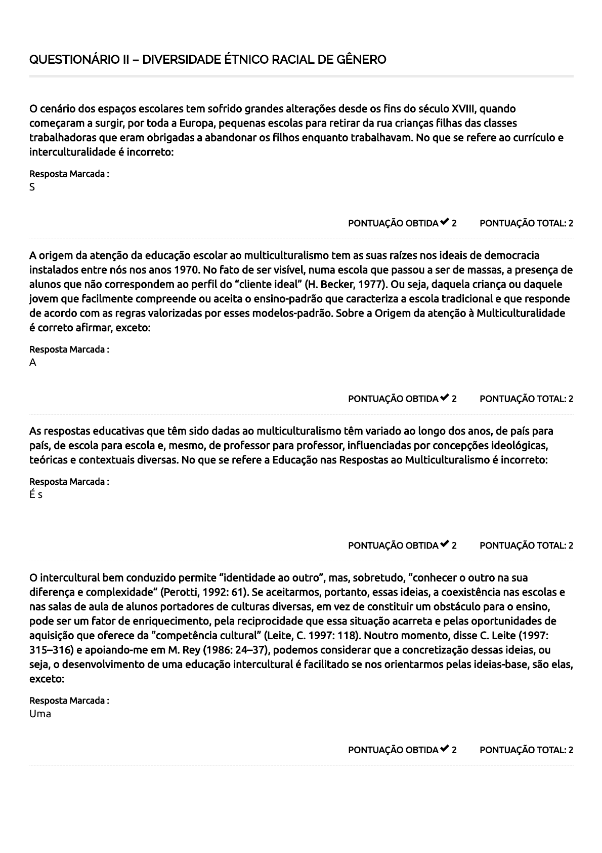 04/06/2020 Course Status – Centro Universitário Faveni https://ava.unifaveni.com.br/course-status/ 1/3 QUESTIONÁRIO II – DIVERSIDADE ÉTNICO RACIAL DE GÊNERO PONTUAÇÃO TOTAL: 2PONTUAÇÃO OBTIDA 2 O cenário dos espaços escolares tem sofrido grandes alterações desde os �ns do século XVIII, quando começaram a surgir, por toda a Europa, pequenas escolas para retirar da rua crianças �lhas das classes trabalhadoras que eram obrigadas a abandonar os �lhos enquanto trabalhavam. No que se refere ao currículo e interculturalidade é incorreto: Resposta Marcada : Sofrendo o efeito da progressiva multiculturalidade da sociedade, a escola passou a confrontar-se com uma realidade desajustada dos currículos transversais e biculturais que a caracterizavam. PONTUAÇÃO TOTAL: 2PONTUAÇÃO OBTIDA 2 A origem da atenção da educação escolar ao multiculturalismo tem as suas raízes nos ideais de democracia instalados entre nós nos anos 1970. No fato de ser visível, numa escola que passou a ser de massas, a presença de alunos que não correspondem ao per�l do “cliente ideal” (H. Becker, 1977). Ou seja, daquela criança ou daquele jovem que facilmente compreende ou aceita o ensino-padrão que caracteriza a escola tradicional e que responde de acordo com as regras valorizadas por esses modelos-padrão. Sobre a Origem da atenção à Multiculturalidade é correto a�rmar, exceto: Resposta Marcada : A ideia do empobrecimento cultural que resulta da culturação da cultura de origem, obriga todos aqueles que estão mais próximos da cultura padrão a “passarem uma esponja” sobre as suas raízes e experiências de vida. PONTUAÇÃO TOTAL: 2PONTUAÇÃO OBTIDA 2 As respostas educativas que têm sido dadas ao multiculturalismo têm variado ao longo dos anos, de país para país, de escola para escola e, mesmo, de professor para professor, in�uenciadas por concepções ideológicas, teóricas e contextuais diversas. No que se refere a Educação nas Respostas ao Multiculturalismo é incorreto: Resposta Marcada : É sabido que o reconhecimento pela escola, de diferentes manifestações e comportamentos culturais tem repercussões ao nível das autoestimas dos elementos dos grupos maioritários, gerando des con�ança e disposição para a aquisição de outros saberes. PONTUAÇÃO TOTAL: 2PONTUAÇÃO OBTIDA 2 O intercultural bem conduzido permite “identidade ao outro”, mas, sobretudo, “conhecer o outro na sua diferença e complexidade” (Perotti, 1992: 61). Se aceitarmos, portanto, essas ideias, a coexistência nas escolas e nas salas de aula de alunos portadores de culturas diversas, em vez de constituir um obstáculo para o ensino, pode ser um fator de enriquecimento, pela reciprocidade que essa situação acarreta e pelas oportunidades de aquisição que oferece da “competência cultural” (Leite, C. 1997: 118). Noutro momento, disse C. Leite (1997: 315–316) e apoiando-me em M. Rey (1986: 24–37), podemos considerar que a concretização dessas ideias, ou seja, o desenvolvimento de uma educação intercultural é facilitado se nos orientarmos pelas ideias-base, são elas, exceto: Resposta Marcada : Uma postura e opção culturais pressupõem uma ação integrada que se esgota nos conteúdos e nas matérias selecionados para o ensino e a aprendizagem. 04/06/2020 Course Status – Centro Universitário Faveni https://ava.unifaveni.com.br/course-status/ 2/3 PONTUAÇÃO TOTAL: 2PONTUAÇÃO OBTIDA 2 Como sabemos, educar professores que estejam preparados para as necessidades de uma sala de aula multicultural é, sem dúvida, um dos maiores desa�os que encontramos em cursos de formação de professores hoje em dia. Sobre as estratégias pedagógicas é incorreto: Resposta Marcada : Através da literatura, leitores podem ganhar um entendimento de questões e códigos que estruturam a vida educacional. Livros direcionados às crianças e aos adolescentes, em particular, têm o potencial de promover entendimento intelectual quando seu foco é em torno de questões que afetam esta população e que tratam de temas e mensagens universais. PONTUAÇÃO TOTAL: 2PONTUAÇÃO OBTIDA 2 É no período pós-guerra que surge o Direito Internacional dos Direitos Humanos como uma tentativa de situar os direitos fundamentais na base da ordem internacional contemporânea. Sobre direitos humanos, cidadania e democracia, é incorreto a�rmar: Resposta Marcada : O sistema nacional de proteção dos direitos humanos dialoga com os sistemas internacionais para a garantia e o respeito aos direitos e às liberdades fundamentais dos indivíduos PONTUAÇÃO TOTAL: 2PONTUAÇÃO OBTIDA 2 No início da civilização humana os primeiros Estados constituíam sua ordem interna através da religião. Nesse tempo as leis eram elaboradas e apre sentadas aos súditos pelos sacerdotes que a�rmavam tê-las recebido diretamente dos Deuses, os quais conferiam autoridades a essas regras para que todos obedecessem. E assim ocorreu na Babilônia em 1700 a.C. Sobre a conquista da Babilônia é incorreto: Resposta Marcada : O rei Shamash recebeu, um conjunto de leis, que o obrigava a aplicá-la ao povo da Babilônia. Consequentemente, o indivíduo que a infringisse, estaria desobedecendo a Lei Divina e seria submetido aos terríveis castigos impostos por essa lei. PONTUAÇÃO TOTAL: 2PONTUAÇÃO OBTIDA 2 A justiça na Idade Média era a justiça de um mundo de pesadelos, absurda e cruel. Ao cair o Império Romano, foi abaixo as leis que formavam aquela civilização e a Europa entrou em um período onde não havia mais leis de�nidas e iguais para os mesmos tipos de delitos. Sobre a justiça na idade média, é correto exceto: Resposta Marcada : Havia a função especializada de julgar, ou seja, haviam juízes. Na chamada baixa Idade Média, com objetivo de solucionar esse problema, formaram uma assembleia com as pessoas mais importantes da região para a função de julgar. 04/06/2020 Course Status – Ce