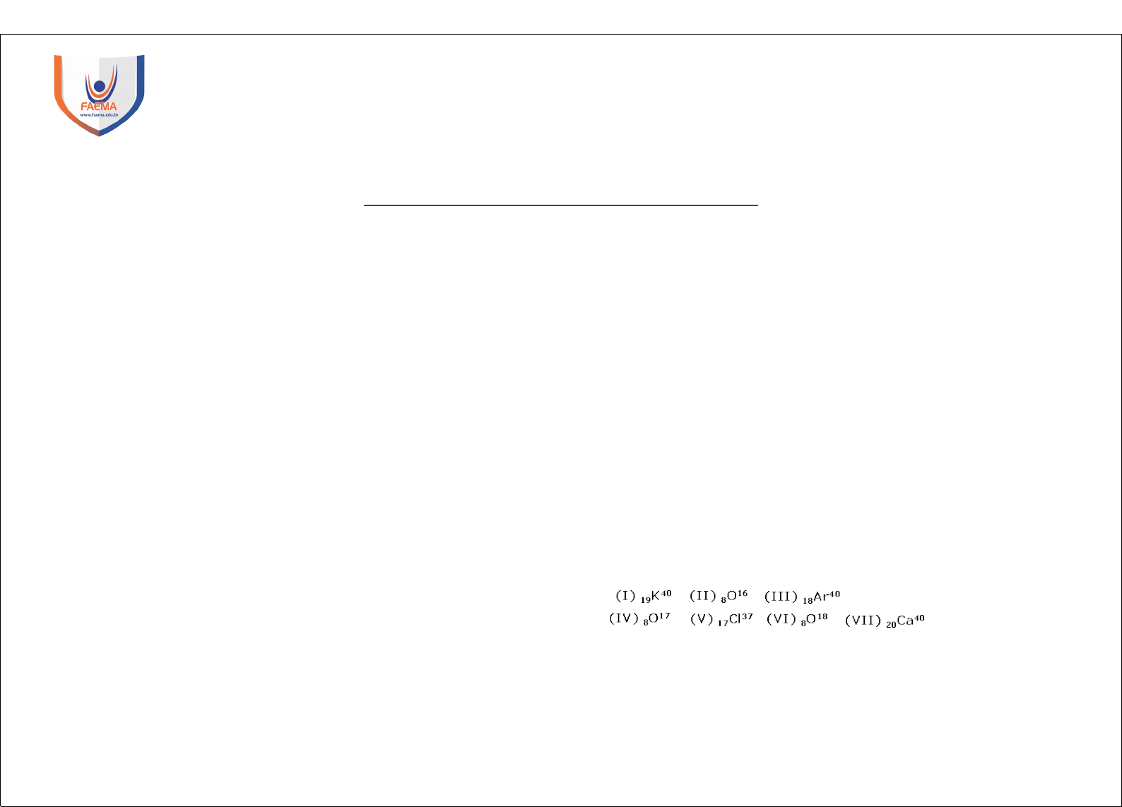 Química Geral Prof. Me. Jociel Honorato de Jesus Lista de exercícios Coincidências atômicas - Isótopos - Isóbaros - Isótonos FACULDADE DE EDUCAÇÃO E MEIO AMBIENTE Instituto Superior de Educação – ISE/FAEMA ------------------------------------------------------------------------------------ Portaria MEC de Recredenciamento Nº. 1.199, de 18/06/2019, D.O.U. de 21/06/2019. 1. Para os átomos genéricos a seguir, identifique quais são isótopos, isótonos e isóbaros entre si: 15C45; 27F65; 25A45; 17G55; 12H42; 16B46; 25E62. 1. Para os átomos genéricos a seguir, identifique quais são isótopos, isótonos e isóbaros entre si: 45A125; 37B155; 13C25; 45D55; 12E125; 24F46; 100G122. 1. Dados os átomos: 26X54; 24Y54; 26Z52; 25W55, 24T52, são isótopos: 1. X e Z; Y e T. 1. X e Z; Y e W. 1. X e Z; X e Y. 1. Y e T; Z e W. 1. X e Y; Z e W. 1. Átomos isótopos diferem quanto 1. às configurações eletrônicas. 1. às posições, na classificação periódica. 1. aos números atômicos. 1. aos números de elétrons. 1. aos números de nêutrons. 1. Considerando os átomos: 19X40 ; 20Y40; 19R39, podemos afirmar que: 1. X e R são isóbaros. 1. X e R são isótopos. 1. X e R são isótonos. 1. X e Y pertencem ao mesmo elemento químico. 1. X e Y deveriam estar representados pelo mesmo símbolo químico. 1. O lixo atômico de uma fábrica de material nuclear contém os elementos radioativos urânio e tório. Considere, a seguir as representações desses elementos: I - 92U238 II - 92U234 III - 90Th230 IV - 90Th234 Constituem um par de isóbaros: a) I e II. b) I e III. c) II e III. d) II e IV. e) III e IV. 1. Ao analisarmos os íons ( 35 A )- e ( 39 B )+ podemos dizer que: 17 19 1. A e B são isótopos; 1. A e B são isóbaros; 1. A e B são isótonos; 1. A e B são isoeletrônicos; 1. A e B não têm nenhuma relação. 1. Considere os elementos a seguir e assinale a opção correta: 1. I e III são isótopos; II, IV e VI são isóbaros. 1. III e VII são isóbaros; V e VII são isótonos. 1. II, IV e VI são isótopos; III e VII são isótonos. 1. II e III são isótonos; IV e VI são isóbaros. 1. II e IV são isótonos; V e VII são isóbaros. 1. Examine as proporções a seguir. 1. O íon (12Mg24)2+ e o átomo 10Ne20 são isótopos porque têm igual número de elétrons. 1. Os isóbaros 18Ar40 e 19K40 têm propriedades químicas diferentes. 1. 17Cl37 e 20Ca40 são átomos isótonos; têm igual número de massa. É possível afirmar que SOMENTE 1. I é correta. 1. II é correta. 1. III é correta. 1. I e II são corretas. 1. II e III são corretas. 1. Alguns estudantes de Química, avaliando seus conhecimentos relativos a conceitos básicos para o estudo do átomo, analisam as seguintes afirmativas: 1. Átomos isótopos são aqueles que possuem mesmo número atômico e números de massa diferentes. 1. O número atômico de um elemento corresponde à soma do número de prótons com o de nêutrons. 1. O número de massa de um átomo, em particular, é a soma do número de prótons com o de elétrons. 1. Átomos isóbaros são aqueles que possuem números atômicos diferentes e mesmo número de massa. 1. Átomos isótonos são aqueles que apresentam números atômicos diferentes, números de massa diferentes e mesmo número de nêutrons. Esses estudantes concluem, corretamente, que as afirmativas verdadeiras são as indicadas por: 1. I, III e V 1. I, IV e V 1. II e III 1. II, III e V 1. II e V