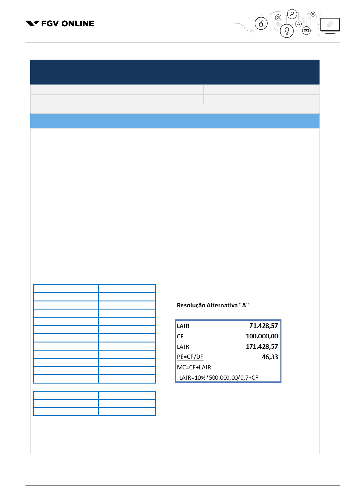 Matriz de atividade individual Disciplina: Gestão de custos Módulo: Gestão de Custos Aluno: Turma: Tarefa: Atividade Individual Questão 1 (2,5 pontos) A Cia Estrela Solitária possui elevada estrutura de custos fixos no montante de $ 100.000,00 por mês. Por ser uma empresa prestadora de serviços, cobra dos seus clientes ISS (Imposto sobre Serviços) de 5% e negocia os seus serviços por um preço médio de $ 6.000,00 por hora. Os diretores da empresa, na última assembleia realizada, projetaram uma taxa mínima de atratividade (TMA) de 10% sobre o capital investido (líquido de imposto de renda). Considerando que o custo dos serviços prestados por hora seja de $ 2.000,00, que o investimento efetuado pelos acionistas no negócio tenha representado um total de $ 500.000,00 e que a alíquota do imposto de renda seja de 30%, responda: 1. Quantas horas devem ser vendidas para que se consiga atingir o retorno desejado que atenda à TMA (taxa mínima de atratividade) definida para o negócio? Resposta: Para atender a TMA de 10% e ter o retorno desejado, são necessárias vender 46,33 horas. CUSTO FIXO 100.000,00 DESPESAS VARIAVEIS 5% PREÇO POR HORA 6.000,00 TMA 10% INVESTIMENTO INICIAL 500.000,00 TMA 50.000,00 IR 30% SERVIÇOS POR HORA 2.000,00 CUSTO V 300,00 CF 100.000,00 MC 3.700,00 MC 3.700,00 LAIR 71.428,57 TOTAL DE HORAS 46,33 Resolução: A Taxa Mínima de Atratividade (TMA) é uma taxa de juros que é o valor mínimo ao qual o investidor se propõe a ganhar quando disponibiliza o seu capital para investir no mercado, o máximo que o investidor se dispõe a pagar em casos de financiamento. 2. Qual é o faturamento necessário para se atingir o ponto de equilíbrio? Resposta: Para atingir o ponto de equilíbrio é necessário ter o faturamento mínimo de R$ 162.162,16. Resolução: Lucro Liquido20% Investimento Inicial1.000.000,00 IR30% LAIR70% L.L200.000,00 LAIR285.714,29 MC=DF+CF+LAIR MC2,75 DF30.000,00 CF58.000,00 LAIR285.714,29 MC:2,75373.714,29 MC135.896UNIDADES CUSTO FIXO 100.000,00 DESPESAS VARIAVEIS 5% PREÇO POR HORA 6.000,00 TMA 10% INVESTIMENTO INICIAL 500.000,00 TMA 50.000,00 IR 30% SERVIÇOS POR HORA 2.000,00 CUSTO V 300,00 CF 100.000,00 MC 3.700,00 Ponto de Equilíbrio: O ponto de equilíbrio contábil ou ponto de equilíbrio global representa o montante no qual as receitas totais se igualam às despesas totais, auferindo, dessa forma, resultado nulo na operação. Questão 2 (2,5 pontos) Limeira e Lameira decidiram abrir uma loja no ramo esportivo, a Limeira&Lameira Ltda. O investimento inicial proposto para o negócio foi de $ 1.000.000,00. A taxa mínima de atratividade (TMA) definida para a operação é de 20%, líquidos de impostos. A alíquota do imposto de renda é de 30%. Os seguintes dados foram projetados para o ano de 2017: Volume de vendas 100.000 unidades Demonstrativo de Resultados Receita do período $ 500.000,00 Custo dos Produtos Vendidos $ 230.000,00 Lucro Bruto $ 270.000,00 Despesas Operacionais $ 83.000,00 Lucro Antes do Imposto de Renda $ 187.000,00 Imposto de Renda – 30% $ 56.100,00 Lucro Líquido $ 130.900,00 A seguir, apresentam-se algumas informações extraídas dos relatórios gerencias da empresa: Do custo dos produtos vendidos (DPV), $ 30.000,00 referem-se a custos fixos. A Comissão de Vendas representa 5% da receita. O saldo restante das despesas operacionais refere-se às despesas fixas de vendas e administrativas. Com base nas informações apresentadas, responda: 1. Qual é o faturamento necessário para se atingir o ponto de equilíbrio? Volume de Vendas100.000,00 Receita 500.000,00 Despesas Operacionais83.000,00 Despesa Fixa25.000,00 Despesa Variavél58.000,00 DF+DV83.000,00 CF30.000,00 CV200.000,00 CF+CV230.000,00 PV5,00 CV2,00 DV0,25 MC unitaria2,75 MC=CF/DF 2,75q=30.000,00+58.000,00 32.000,00Unidades FATURAMENTO160.000,00R$ Resposta: Com base nas informações apresentadas para atingir o ponto de equilíbrio é necessário a empresa efetuar um faturamento de R$ 160.000,00. 2. Quantas unidades devem ser vendidas para que a empresa atinja a TMA definida para o negócio? É necessário vender 135.896 unidades. Questão 3 (2,5 pontos) Uma empresa comercial, desejando um lucro líquido de 7% sobre o seu preço de venda, apresenta os seguintes dados mensais: Receita de Vendas $ 400.000 Despesas administrativas $ 20.000 Despesas fixas de vendas $ 32.000 Comissão de vendas 5% das vendas PIS e COFINS 2,65% da receita ICMS 18% IR 30% Dados da aquisição de 3.000 unidades da mercadoria X: Valor da Nota Fiscal $ 66.000 Mercadoria com ICMS $ 60.000 IPI $ 6.000 Despesas de Fretes $ 1.200 Despesas de Seguros $ 600 Total da Compra $ 67.800 Com base nos dados apresentados, determine: 1. o preço de venda à vista da mercadoria X (ICMS = 18%) e 2. o preço de venda com prazo de 60 dias para recebimento, com custo financeiro mensal de 5%. LEMBRETE: PVp = %DV * PVp + (Custo Financ. * PVv) + Custo + DF + Lucro Resolução das Questões 1 e 2: Comissão de vendas5% PIS e COFINS2,65% ICMS18% IR30% DV25,65% DF 13,00 DF 13,00% Lucro Liquido7% Investimento Inicial400.000,00 IR30% LAIR70% L.L28.000,00 LAIR40.000,00 Lucro antes do IR10 Lucro antes do IR10% Market-up48,65% Fator Market-up=Preço-Market-up51,35% Preço a Vista=Custo Unitáio/Fator Market-Up PA37,00 Preço a Vista 37,00 PVp = %DV * PVp + (Custo Financ. * PVv) + Custo + DF + Lucro+Juros Juros VP=37-37,00 Prazo n2 Taxa I5% VF40,79 Juros 3,7925 10,25% Comissão de vendas5% PIS e COFINS2,65% ICMS18% IR30% DV25,65% DF 13,00 DF 13,00% Lucro Liquido7% Investimento Inicial400.000,00 IR30% LAIR70% L.L28.000,00 LAIR40.000,00 Lucro antes do IR10 Lucro antes do IR10% Market-up48,65% Fator Market-up=Preço-Market-up51,35% Preço a Vista=Custo Unitáio/Fator Market-Up PA37,00 Preço a Vista 37,00 PVp = %DV * PVp + (Custo Financ. * PVv) + Custo + DF + Lucro+Juros Pvp=25,65%*PVp+0,13*37+0,10*37193,7925 Pvp=0,74354,813,722,7925 Pvp=0,743531,3025 Pvp=31,3025 0,7435 Pvp=42,10Preço a Prazo42,10 Após as an