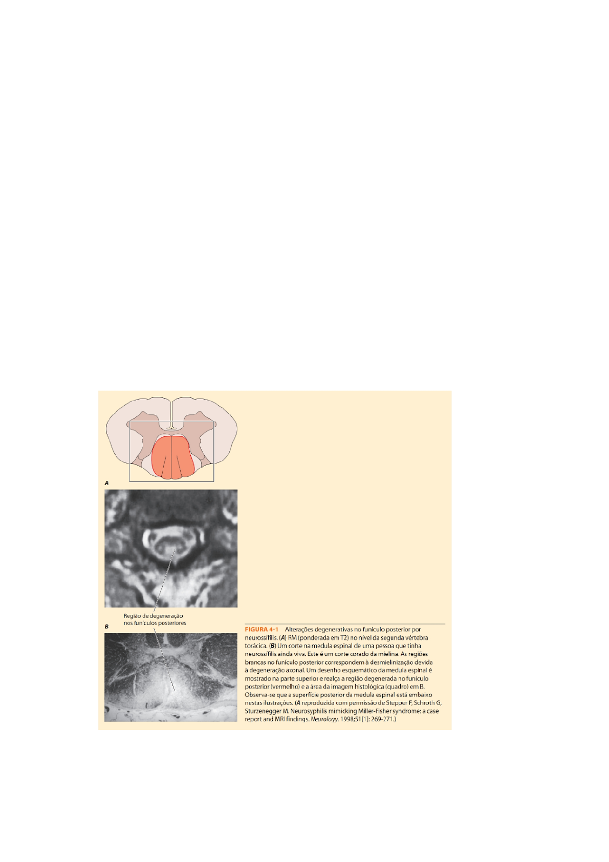 ATIVIDADE: 1. Um homem de 36 anos foi admitido no hospital por instabilidade na marcha e diversos outros sinais sensoriais e motores, incluindo-se dor e prejuízos à força no membro. A sensação de toque, alfinetada e temperatura eram normais. A percepção de vibração e o sentido de posição do membro estavam ausentes. Quando ele era solicitado a ficar de pé com os olhos fechados, ele oscilava e per- dia o equilíbrio. Este é o “sinal de Romberg” positivo. Sua marcha era de base alargada, desajeitada e cambaleante. A RM de seu cérebro era normal, mas a RM de sua medu- la espinal mostrava um sinal intenso nos funículos posteriores, bilateralmente (Figura 4-1A), o qual parecia ser o mesmo que LCS. O homem tinha uma infecção sifilítica não tratada por 10 anos ou mais. Ele foi diagnosticado com neuros- sífilis, também chamada de tabes dorsalis, com base em diversos testes laboratoriais e neurológicos, incluindo-se RM e perda sensorial indicada acima. Esse é o estágio avançado da sífilis, quando infecta o sistema nervoso. Com base nas imagens e consideração dos sinais neurológicos: Qual sistema funcional torna-se prejudicado quando há degeneração neuronal no funículo posterior? RESPOSTA: Axônios mecanorreceptores sobem no interior das colunas posteriores, incluindo aquelas para tato, vibração, sensação e propriocepção do membro. Não está claro por que a sen- sação de tato do paciente foi preservada. Sistema coluna dorsal - lemnisco medial. 2. Um homem de 21 anos sofreu uma lesão por arma de fogo. Ele estava voltando para casa do trabalho com amigos quando foi atingido por uma bala perdida. Ele estava inconsciente quando a ambulância chegou e, quando recuperou a consciência, na sala de emergência, relatou que era incapaz de mover seu pé direito e que sentia sua perna direita dormente. Exames neurológicos e radiológicos revelaram que a bala entrou por volta do nível médio torácico. Havia completa perda da função motora do membro inferior direito e perda da sensação de tato (bem como outras sensações mecânicas, incluindo sensação de posição e sensação de vibração), também à direita, no nível T10 e abaixo. A sensação de dor foi examinada com uma alfinetada, e o teste revelou uma ausência de dor somente na perna esquerda, estendendo-se superiormente a T11. A Figura10-1A mostra a distribuição da perda sensorial. A. Por que as sensações de dor e tato estão comprometidas no lado oposto do corpo? RESPOSTA: Como a via dolorosa ascendente, o sistema anterolateral, sofre decussação inferior à lesão, os axônios afetados originaram-se do lado contralateral. A via tátil ascendente, o funículo posterior, é uma via espinal ipsilateral, que sofre decussação no bulbo. Os axônios afetados estão no mesmo lado da lesão. B. Por que o paciente tem a dor preservada, mas não a sensação de tato acima do dermetomo T11? RESPOSTA: O sistema anterolateral sofre decussação à medida que sobe. Os neurônios que contribuem para essa via no nível da lesão, somente chegam no lado afetado, a no máximo, 1-2 segmentos superiormente. Por consequência, desviam da lesão. C. Por que a perna no lado com o comprometimento da sensação tátil está paralisada, mas não paralisada no lado sem dor? RESPOSTA: A via motora principal danificada pela lesão, o trato corticoespinal, sofre decussação inferiormente à lesão, no bulbo. Os axônios danificados controlam músculos no lado da lesão espinal. Esse mesmo lado também é afetado pelo comprometimento dos funículos posteriores.