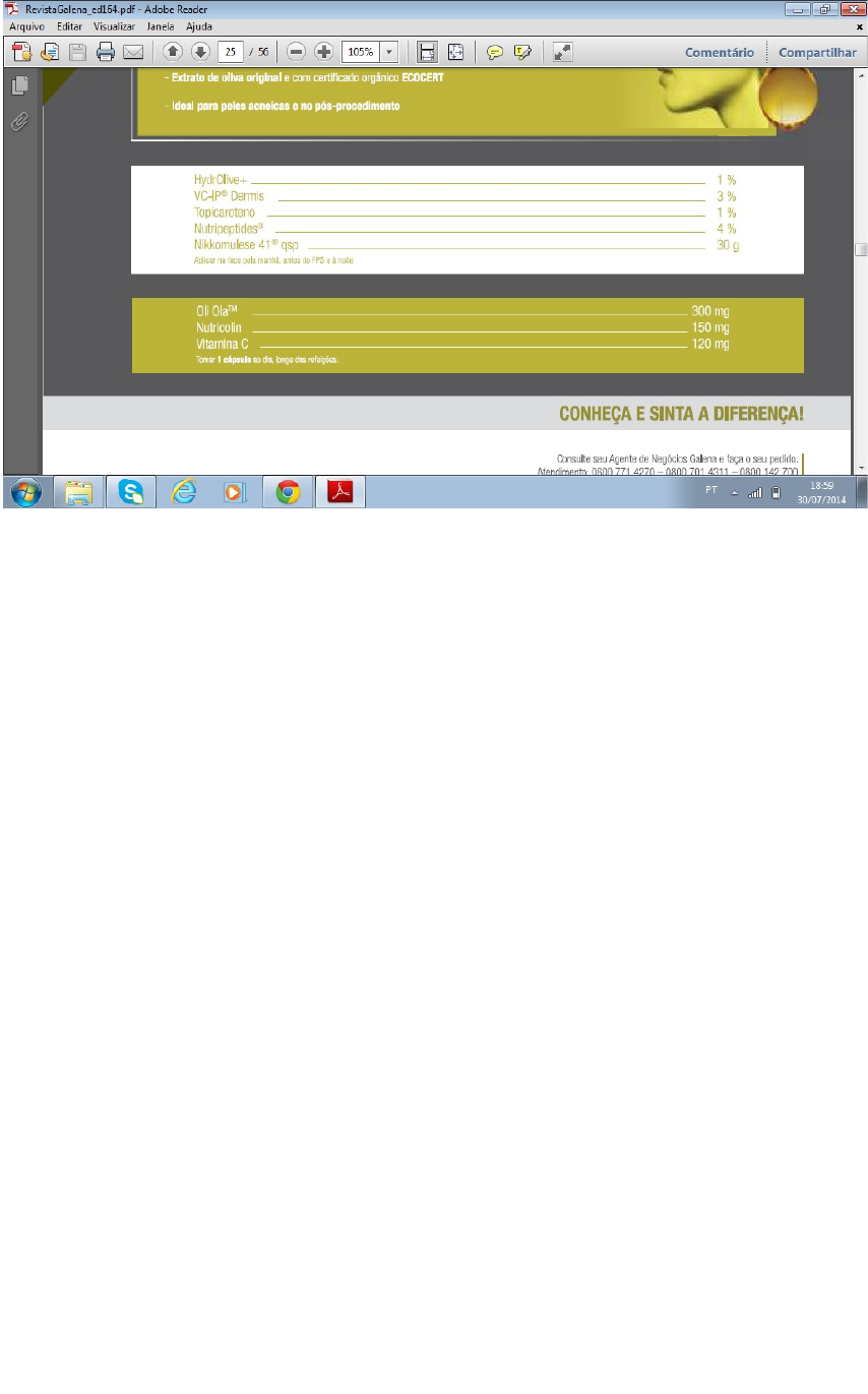 Gel Hidratante com Lipossomas Lipossomas 1% Hidroviton 1,5% Vitamina E 0,03% Gel de Hostacerin qsp 60 g Creme Hidratante com Pentaglycan Pentaglycan 2% Alantoína 0,5% Vitamina E 1% Creme Hidratante qsp 100 g Creme Hidratante com DSH - C e FARL Hialuronato de Dimetil Silanol 3% FARL 2% Creme Hidratante qsp 100 g Gel Hidratante com FARL Glicossomas 2% Fator Anti-Radicais Livres 3% Gel de Lubrajel qsp 60 g Creme Hidratante com Pentaglycan e Pentavitin Pentaglycan 3% Pentavitin 2% FARL 2% Creme Hidratante qsp 50 g ótmos produtos. O Active C [10] é a única vit. C que fez diferença a curto prazo na minha pele. Creme Hidratante com Ácido Hialurônico e Lipossomas Lipossomas 3% Acido Hialurônico 2% Extrato de Algas Marinhas 2% Creme Hidratante qsp 50 g Gel com Hydroxyprolisilane C Hydroxyprolisilane C 2% Vitamina E 0,3 % Alfa Bisabolol 0,1 % Gel de Sepigel qsp 100 g Loção Cremosa com Ácido Hialurônico Ácido Hialurônico 3% Galactosan 5% Passion Flower OH 2% Loção Cremosa qsp 60 ml Modo de Usar (formulações acima): aplicar no rosto após a limpeza da pele, com movimentos circulares. Meus favoritos da Skinceuticals no momento = 1. Advanced Pigment Corrector, informações sobre ele aqui. Rende muito (o meu não acaba nunca!), espalhabilidade excelente. Se colocar muito você desperdiça pois ele flocula e esfarela. Conta com ácidos elágico, hidroxifenil propriônico e salicílico. 2. Retinol 0.3, informações sobre ele aqui. Melhor Retinol que já usei. Está estocado. Na próxima viagem vou trazer o 0,5 e o 1,0 pois decidi não usar mais o ácido retinoico (vasinhos, vasinhos…) 3. Sheer Physical UV Defense FPS 50: Ele tem a textura que lembra o Bioré branquinho. No geral é melhor do que os outros protetores ocidentais que já usei mas não chega nem aos pés do Bioré na minha opinião, pois deixa minha pele meio empoada e ressalta os poros, possivelmente porque é pouco siliconado e não foi pensado para ser primer. Sozinho não rola usar por causa do acabamento. Mas por ser 100% físico vai me ajudar a prevenir que o melasma enlouqueça no verão, pois agora estou podendo usar bases mais transparentes então preciso reforçar a proteção física e passo o Sheer Physical por cima do Bioré ou do meu Allie. Informações sobre ele aqui. 4. A.G.E Eye Complex: Gostei bastante, a textura é ótima, hidrata muito, serve como primer (deixa o corretivo bem ‘soft’), mas não pretendo recomprá-lo porque o da La Roche tem um custo-benefício muitíssimo melhor e efeito até bem parecido. 5. A.G.E Interrupter (rosto): Ainda não tenho a idade indicada para usá-lo mas como não vou fazer procedimentos para evitar rugas, resolvi começar mais cedo. Tem 30% de Proxylan. Informações, aqui. Usei duas vezes por dia durante 6 meses e cai de amores por este produto. Atualmente estou no terceiro vidro e uso alternando meio aleatoriamente com o Substiane Rosto para reduzir o custo anual do tratamento. Beijos, M. Benefícios e Indicações: A Oxigenoterapia é eficiente no rejuvenecimento e regeneração celular. Por volta dos 30 anos de idade a nossa pele perde aproximadamente 65% do armazenamento de oxigênio, além disso, o metabolismo celular fica mais lento. O resultado é a redução na produção de Colágeno e Elastina, com o aparecimento de linhas de expressão e rugas. Sendo assim, nossa pele precisa de suplemento de oxigênio para rejuvenecer. Os lipossomas de Oxigênio são auxiliares no transporte de oxigênio, fazendo com que as substâncias presentes nele cheguem às camadas mais profundas da pele, atuando a nível de reestruturação celular e agente umedecedor, cobrindo as células da pele e possibilitando que se mantenha lisa, hidratada e saudável. A oxigenação da pele evita a perda de proteínas da matriz extracelular, o que consequentemente resulta numa pele mais jovial e com maior luminosidade e viço, além de dar firmeza e elasticidade à pele, pela ativação da produção de colágeno e elastina. Pode ser usado em qualquer tipo de pele, secas, oleosas, sensíveis, assim como em pré e pós menopausa. Para manter a pele sempre saudável, além da reposição de oxigênio, recomenda-se beber muita água, nunca dormir de maquiagem usar protetor solar pelo menos duas vezes ao dia, além de hidratantes. Composição: LipO2 2%; Aquaporine Active 4%; FPS30 qsp 30g. Modo de Usar: Após limpeza facial da manhã, aplique o produto na face com movimentos circulares até absorção total e reaplique a tarde. Benefícios e Indicações: Auxilia na redução de linhas de expressão, aumenta o volume local, em áreas desejadas, aumentando de forma benéfica o tecido adiposo subcutâneo pelo acúmulo de lipídeos, protege a degradação do colágeno da pele, aumenta a hidratação da pele, combate a flacidez cutânea e remodela a epiderme e tem efeito preenchedor e firmador. O Serum possui 3 ativos altamente eficazes que atuam em sinergismo: Hyaxel - Potente antiaging composto por Ácido Hialurônico vetorizado pelo Silício Orgânico, cuja função é intensificar a renovação epidérmica, acelerar o processo regenerativo e restaurar a elasticidade cutânea, atuando diretamente contra o envelhecimento cutâneo; Sculptessence - remodelador dérmico natural derivado de semente de linho, o qual compensa todas as desordens causadas pelo envelhecimento cutâneo de duas maneiras, aumentando a capacidade de absorção de água na pele, promovendo aumento na hidratação e por estimular a síntese de GAG's (glicosaminoglicanas); Adipofill - Induz o preenchimento de células adiposas e aumenta o tecido adiposo, desta forma, as rugas são preenchidas por este tecido e diminuem sua aparência. Composição: Hyaxel 5%; Sculptessence 3%; Adipofill 4% em Serum Hidratante qsp 15g. Modo de usar: Aplicar na área de olho e marcas de expressão, duas vezes ao dia, com movimentos circulares até completa absorção, ou conforme orientação de um profissional habilitado. Benefícios e Indic
