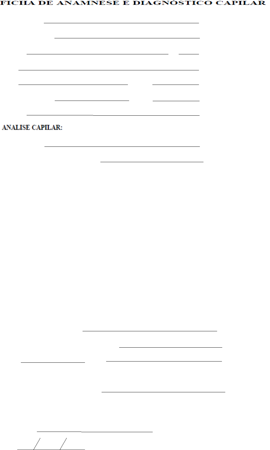 Nome completo Data de nascimento: Endereço: N. E-mail: Cidade: Estado: Telefone residencial: Celular: Indicação: Queixa principal: Já realizou algum tratamento capilar? Tipo de cabelo: Normal( ) oleoso ( ) seco( ) misto( ) Comprimento ( )curto ( )médio( ) longo Elasticidade ( )boa ( )media ( )ausência Tipo: Sensível( ) Seborreico( ) oleoso ( ) normal( ) seco( ) Complicações do cabelo: ( )descamações ( )dermatite ( )hipoidrose( )hiperdrose Alopecia/evolução do quadro (cosméticos/traumática, emocional,outros) Lesões? Qual? Histórico capilar: Produtos utilizados, cuidados diários: AS DECLARACOES ACIMA SÃO DE EXPRESSA VERDADE NÃO CABENDO A ESTETICISTA CAPILAR NENHUMA RESPONSABILIDADE POR FATOS OMITIDO OU FALSOS. ASS CLIENTE: DATA: ASSINATURA DO RESPONSAVEL PELO PROCESSO: DATA: FONTES:WWW.davirocha.net WWW.procedimentosesteticosblogspot.com.br ALUNA:PALOMA DA SILVA ROSA RGM:286583 TURMA 215AM PROF. JANAÍNA.