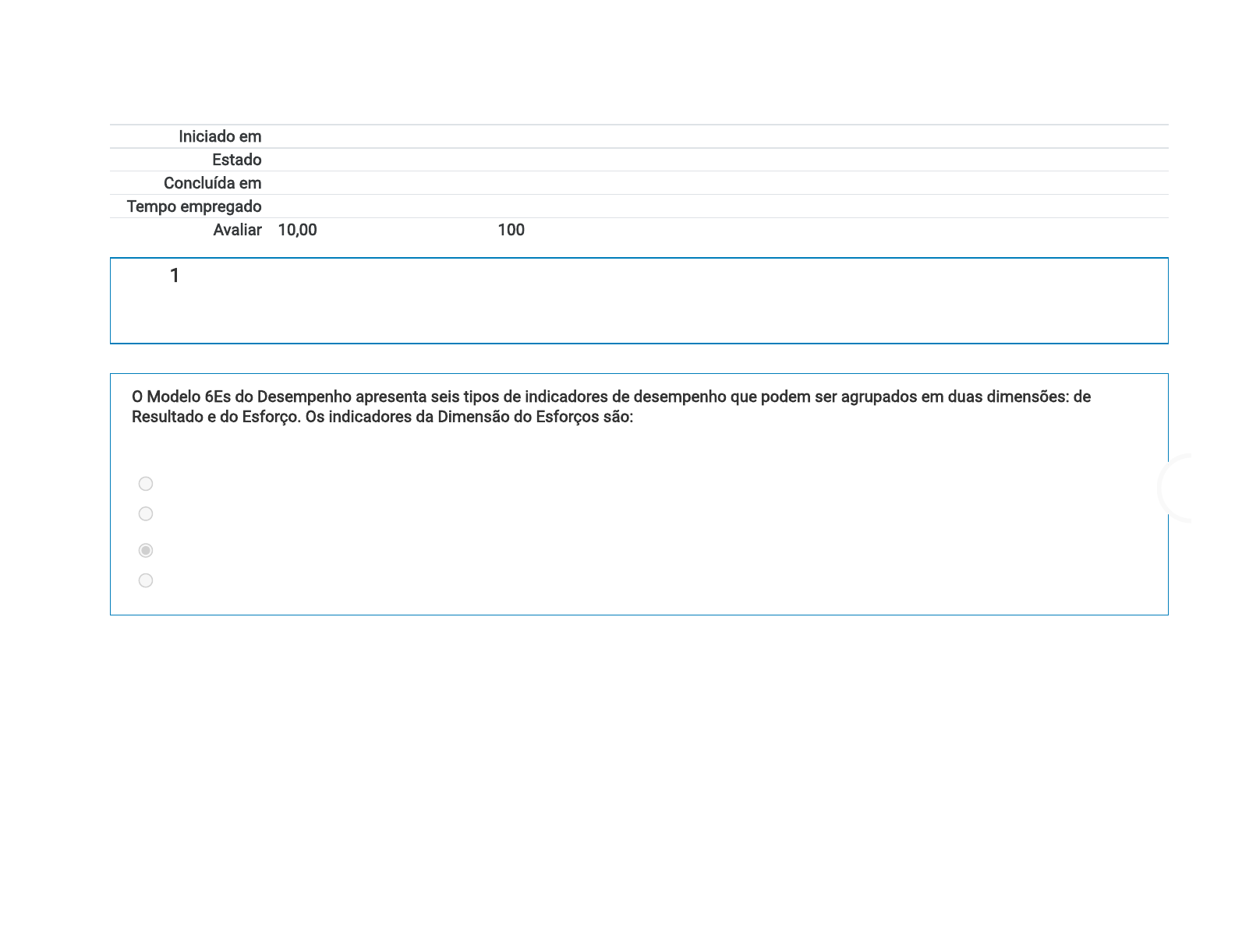 07/06/2020 Atividade 18 – Avaliação de Aprendizagem: Revisão da tentativa https://www.ead.pr.gov.br/mod/quiz/review.php?attempt=253640&cmid=32064 1/5 Iniciado em domingo, 7 Jun 2020, 16:12 Estado Finalizada Concluída em domingo, 7 Jun 2020, 16:15 Tempo empregado 3 minutos 15 segundos Avaliar 10,00 de um máximo de 10,00(100%) Questão 1 Correto Atingiu 2,00 de 2,00 O Modelo 6Es do Desempenho apresenta seis tipos de indicadores de desempenho que podem ser agrupados em duas dimensões: de Resultado e do Esforço. Os indicadores da Dimensão do Esforços são: Escolha uma: a. Economicidade, excelência e e�ciência. b. Execução, efetividade e economicidade. c. Execução, economicidade e excelência. d. E�cácia, e�ciência e efetividade. Sua resposta está correta. A resposta correta é: Execução, economicidade e excelência.. 07/06/2020 Atividade 18 – Avaliação de Aprendizagem: Revisão da tentativa https://www.ead.pr.gov.br/mod/quiz/review.php?attempt=253640&cmid=32064 2/5 Questão 2 Correto Atingiu 2,00 de 2,00 Julgue a a�rmativa a seguir em Verdadeiro ou Falso. A e�cácia diz respeito aos impactos gerados pelos produtos/serviços, processos ou projetos. Ou seja, envolve o grau de satisfação ou valor agregado. Escolha uma opção: Verdadeiro Falso A resposta correta é 'Falso'. 07/06/2020 Atividade 18 – Avaliação de Aprendizagem: Revisão da tentativa https://www.ead.pr.gov.br/mod/quiz/review.php?attempt=253640&cmid=32064 3/5 Questão 3 Correto Atingiu 2,00 de 2,00 Julgue a a�rmativa a seguir em verdadeiro ou falso. A E�ciência diz respeito à relação entre produtos/serviços gerados com os insumos empregados, usualmente sob a forma de custos ou produtividade. Escolha uma opção: Verdadeiro Falso A resposta correta é 'Verdadeiro'. 07/06/2020 Atividade 18 – Avaliação de Aprendizagem: Revisão da tentativa https://www.ead.pr.gov.br/mod/quiz/review.php?attempt=253640&cmid=32064 4/5 Questão 4 Correto Atingiu 2,00 de 2,00 O Modelo 6Es do Desempenho apresenta seis tipos de indicadores de desempenho que podem ser agrupados em duas dimensões: de Resultado e do Esforço. Os indicadores da Dimensão do Resultado são: Escolha uma: a. Economicidade, E�ciência e E�cácia. b. E�ciência, E�cácia e Excelência. c. E�ciência, E�cácia e Efetividade. d. Economicidade, Excelência e Execução. Sua resposta está correta. A resposta correta é: E�ciência, E�cácia e Efetividade.. 07/06/2020 Atividade 18 – Avaliação de Aprendizagem: Revisão da tentativa https://www.ead.pr.gov.br/mod/quiz/review.php?attempt=253640&cmid=32064 5/5 Questão 5 Correto Atingiu 2,00 de 2,00 Os Indicadores são amplamente utilizados na gestão de organizações, desde a popularização de métodos de gestão estratégica como o Balanced ScoreCard (BsC). Marque abaixo o item que não representa uma das �nalidades da utilização de Indicadores. Escolha uma: a. Acompanhar o alcance das metas. b. Identi�car avanços. c. Melhorar a qualidade. d. Distribuir a responsabilidade. Sua resposta está correta. A resposta correta é: Distribuir a responsabilidade.. https://www.ead.pr.gov.br/mod/lesson/view.php?id=32062&forceview=1 https://www.ead.pr.gov.br/mod/questionnaire/view.php?id=32142&forceview=1