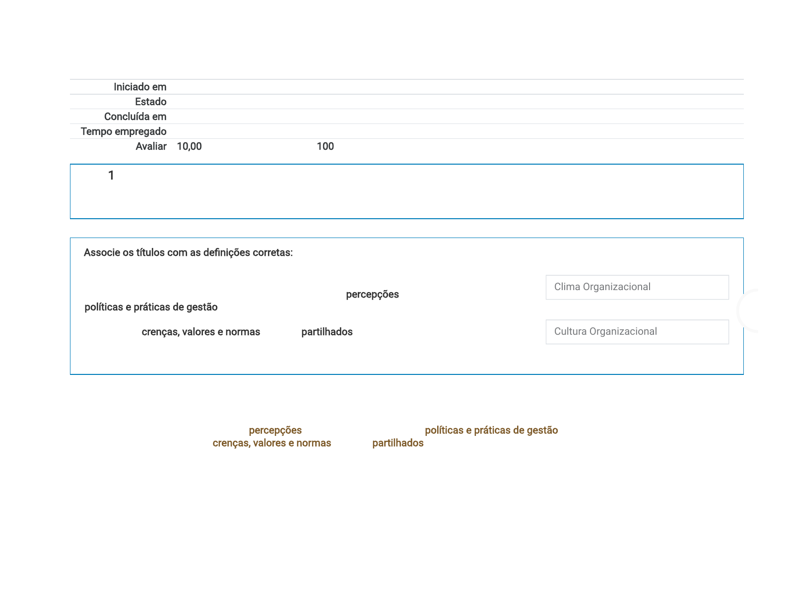 07/06/2020 Atividade 08 – Avaliação de Aprendizagem: Revisão da tentativa https://www.ead.pr.gov.br/mod/quiz/review.php?attempt=253410&cmid=31989 1/6 Iniciado em sábado, 6 Jun 2020, 18:56 Estado Finalizada Concluída em sábado, 6 Jun 2020, 19:11 Tempo empregado 14 minutos 24 segundos Avaliar 10,00 de um máximo de 10,00(100%) Questão 1 Correto Atingiu 2,00 de 2,00 Associe os títulos com as de�nições corretas: Refere-se a importantes características e atributos conectados ao ambiente e ao sistema de trabalho, geralmente medido ou gerenciado por meio das percepções dos indivíduos acerca das políticas e práticas de gestão da organização. Conjunto de crenças, valores e normas que são partilhados pelos colaboradores de uma organização e que afetam seus comportamentos e atitudes. Clima Organizacional Cultura Organizacional Sua resposta está correta. A resposta correta é: Refere-se a importantes características e atributos conectados ao ambiente e ao sistema de trabalho, geralmente medido ou gerenciado por meio das percepções dos indivíduos acerca das políticas e práticas de gestão da organização. → Clima Organizacional, Conjunto de crenças, valores e normas que são partilhados pelos colaboradores de uma organização e que afetam seus comportamentos e atitudes. → Cultura Organizacional. 07/06/2020 Atividade 08 – Avaliação de Aprendizagem: Revisão da tentativa https://www.ead.pr.gov.br/mod/quiz/review.php?attempt=253410&cmid=31989 2/6 Questão 2 Correto Atingiu 2,00 de 2,00 Preencha as lacunas: O Dimensionamento da Força de Trabalho quantitativo, para a projeção ideal, busca identi�car os de trabalho nos quais um cargo atua, em seu setor, os decorrentes, a de trabalho consumida para gera-los, computada em por , mês ou , gerando os totais anuais para serem comparados com a disponibilidade de horas de trabalho deste cargo, também anual, conforme sua , em um cenário (descontando-se um mês de férias) ou de (considerando-se picos de demanda ou mutirões, postergando as férias para o ano seguinte). processos produtos carga horas dia ano jornada normal sobrecarga Sua resposta está correta. A resposta correta é: Preencha as lacunas: O Dimensionamento da Força de Trabalho quantitativo, para a projeção ideal, busca identi�car os [processos] de trabalho nos quais um cargo atua, em seu setor, os [produtos] decorrentes, a [carga] de trabalho consumida para gera-los, computada em [horas] por [dia], mês ou [ano], gerando os totais anuais para serem comparados com a disponibilidade de horas de trabalho deste cargo, também anual, conforme sua [jornada], em um cenário [normal] (descontando-se um mês de férias) ou de [sobrecarga] (considerando-se picos de demanda ou mutirões, postergando as férias para o ano seguinte). 07/06/2020 Atividade 08 – Avaliação de Aprendizagem: Revisão da tentativa https://www.ead.pr.gov.br/mod/quiz/review.php?attempt=253410&cmid=31989 3/6 Questão 3 Correto Atingiu 2,00 de 2,00 Avalie como verdadeiro ou falso. O chamado “Iceberg Organizacional” é uma representação grá�ca da cultura organizacional, representando o modus operandi da organização submerso e as crenças e valores na superfície. Escolha uma opção: Verdadeiro Falso A resposta correta é 'Falso'. 07/06/2020 Atividade 08 – Avaliação de Aprendizagem: Revisão da tentativa https://www.ead.pr.gov.br/mod/quiz/review.php?attempt=253410&cmid=31989 4/6 Questão 4 Correto Atingiu 2,00 de 2,00 Escreva os títulos dos 7 passos do Dimensionamento. 3º Passo: 5º Passo: 6º Passo: 4º Passo: 7º Passo: 2º Passo: 1º Passo: Levantamento das informações Benchmark e pesquisas Compilação e Análise das informações Realização de o�cinas Alinhamento entre os envolvidos De�nição da equipe O�cinas explicativas Sua resposta está correta. A resposta correta é: 3º Passo: → Levantamento das informações, 5º Passo: → Benchmark e pesquisas, 6º Passo: → Compilação e Análise das informações, 4º Passo: → Realização de o�cinas, 7º Passo: → Alinhamento entre os envolvidos, 2º Passo: → De�nição da equipe, 1º Passo: → O�cinas explicativas. 07/06/2020 Atividade 08 – Avaliação de Aprendizagem: Revisão da tentativa https://www.ead.pr.gov.br/mod/quiz/review.php?attempt=253410&cmid=31989 5/6 Questão 5 Correto Atingiu 2,00 de 2,00 Preencha as lacunas: O Dimensionamento da Força de Trabalho busca estimar o de pessoal de uma organização, de uma área ou de um grupo que efetue determinado processo de trabalho, incluindo a de�nição das necessárias para o desempenho das tarefas requeridas, de forma a contribuir para o alcance das metas e o sucesso organizacional. O dimensionamento quantitativo pode ser , relacionado à projeção de aposentadorias, ou do tipo , que considera processos, carga de trabalho, jornada de trabalho, cenários, benchmark e demandas futuras. quadro ideal competências inercial projeção ideal Sua resposta está correta. A resposta correta é: Preencha as lacunas: O Dimensionamento da Força de Trabalho busca estimar o [quadro ideal] de pessoal de uma organização, de uma área ou de um grupo que efetue determinado processo de trabalho, incluindo a de�nição das [competências] necessárias para o desempenho das tarefas requeridas, de forma a contribuir para o alcance das metas e o sucesso organizacional. O dimensionamento quantitativo pode ser [inercial], relacionado à projeção de aposentadorias, ou do tipo [projeção ideal], que considera processos, carga de trabalho, jornada de trabalho, cenários, benchmark e demandas futuras. https://www.ead.pr.gov.br/mod/lesson/view.php?id=31988&forceview=1 https://www.ead.pr.gov.br/mod/url/view.php?id=31990&forceview=1 07/06/2020 Atividade 08 – Avaliação de Aprendizagem: Revisão da tentativa https://www.ead.pr.gov.br/mod/quiz/review.php?attempt=253410&cmid=31989 6/6