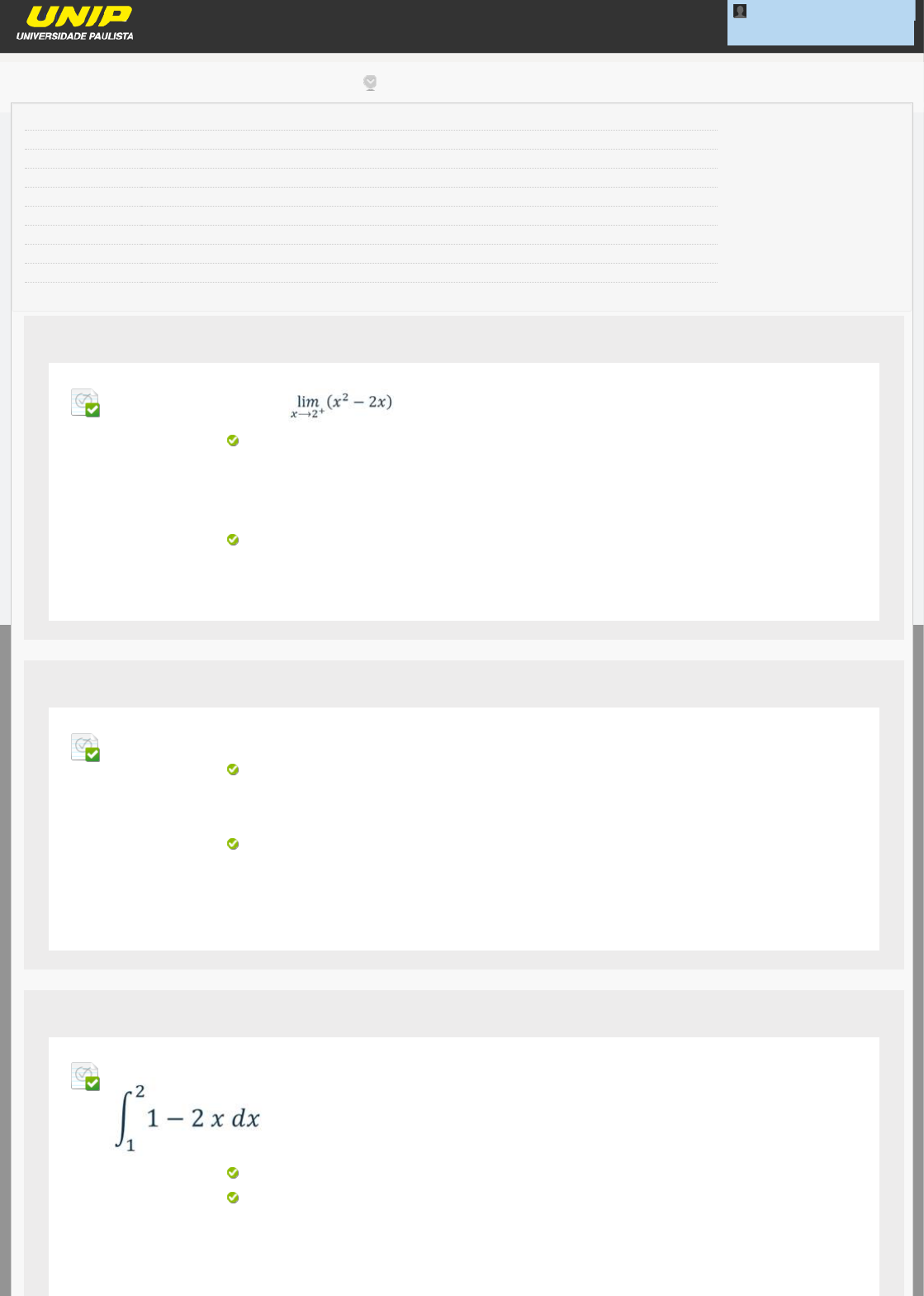 UNIP EAD BIBLIOTECAS MURAL DO ALUNO TUTORIAIS LABORATÓRIOS natalia.gurke @aluno.unip.brCONTEÚDOS ACADÊMICOS Revisar envio do teste: ATIVIDADE TELEAULA IVCÁLCULO INTEGRAL DE UMA VARIÁVEL 1453-90_15402_R_20201 CONTEÚDO Usuário natalia.gurke @aluno.unip.br Curso CÁLCULO INTEGRAL DE UMA VARIÁVEL Teste ATIVIDADE TELEAULA IV Iniciado 02/04/20 18:00 Enviado 02/04/20 18:02 Status Completada Resultado da tentativa 0 em 0 pontos Tempo decorrido 1 minuto Autoteste O aluno responde e o resultado do aluno não é visível ao professor. Resultados exibidos Todas as respostas, Respostas enviadas, Respostas corretas, Comentários, Perguntas respondidas incorretamente Pergunta 1 Resposta Selecionada: d. Respostas: a. b. c. d. e. Feedback da resposta: A expressão para o cálculo do limite em ENTRADA no Maxima é: limit (x^2-2*x, x, 2, plus) limit (x^2-2x, x, 2, minus) limit (x^2-2*x, x, 2, minus) limit (x^2-2x, x, 2, plus) limit (x^2-2*x, x, 2, plus) limit (x^2-2*x, x, 2, inf) Resposta: d) Pergunta 2 Resposta Selecionada: c. Respostas: a. b. c. d. e. Feedback da resposta: Para calcular a derivada da função f(x) = (2x – x 3) . (x – 5x 2), a sintaxe correta na janela diferenciar é: (2*x – x^3) * (x – 5*x^2) (2*x – x^3) * (x – 5x^2) (2x – x^3) * (x – 5*x^2) (2*x – x^3) * (x – 5*x^2) (2*x – x*3) * (x – 5*x^2) (2x – x^3) * (x – 5x^2) Resposta: c) Pergunta 3 Resposta Selecionada: a. Respostas: a. b. c. d. Para calcular a integral de!nida a seguir, a sintaxe que devemos digitar em Entrada da tela geral do Maxima é: integrate (1 – 2*x, x,1, 2) integrate (1 – 2*x, x,1, 2) integrate (1 – 2x, x,1, 2) integrate (1 – 2*x, x) integrate (1 – 2x, x) 0 em 0 pontos 0 em 0 pontos 0 em 0 pontos Segunda-feira, 8 de Junho de 2020 12h15min10s GMT-03:00 e. Feedback da resposta: integrate (1 – 2*x, x,0, 1) Resposta: a) Resolução: Pergunta 4 Resposta Selecionada: a. Respostas: a. b. c. d. e. Feedback da resposta: Para calcular, usando o Maxima, o valor da seguinte expressão, devemos digitar em ENTRADA: 15/sqrt (4^2 – 7) 15/sqrt (4^2 – 7) 15/sqrt (4^2) – 7 15/sqrt 4^2 – 7 (15/sqrt 4^2 – 7) 15/(sqrt 4^2 – 7) Resposta: a) Resolução: ȼ OK 0 em 0 pontos