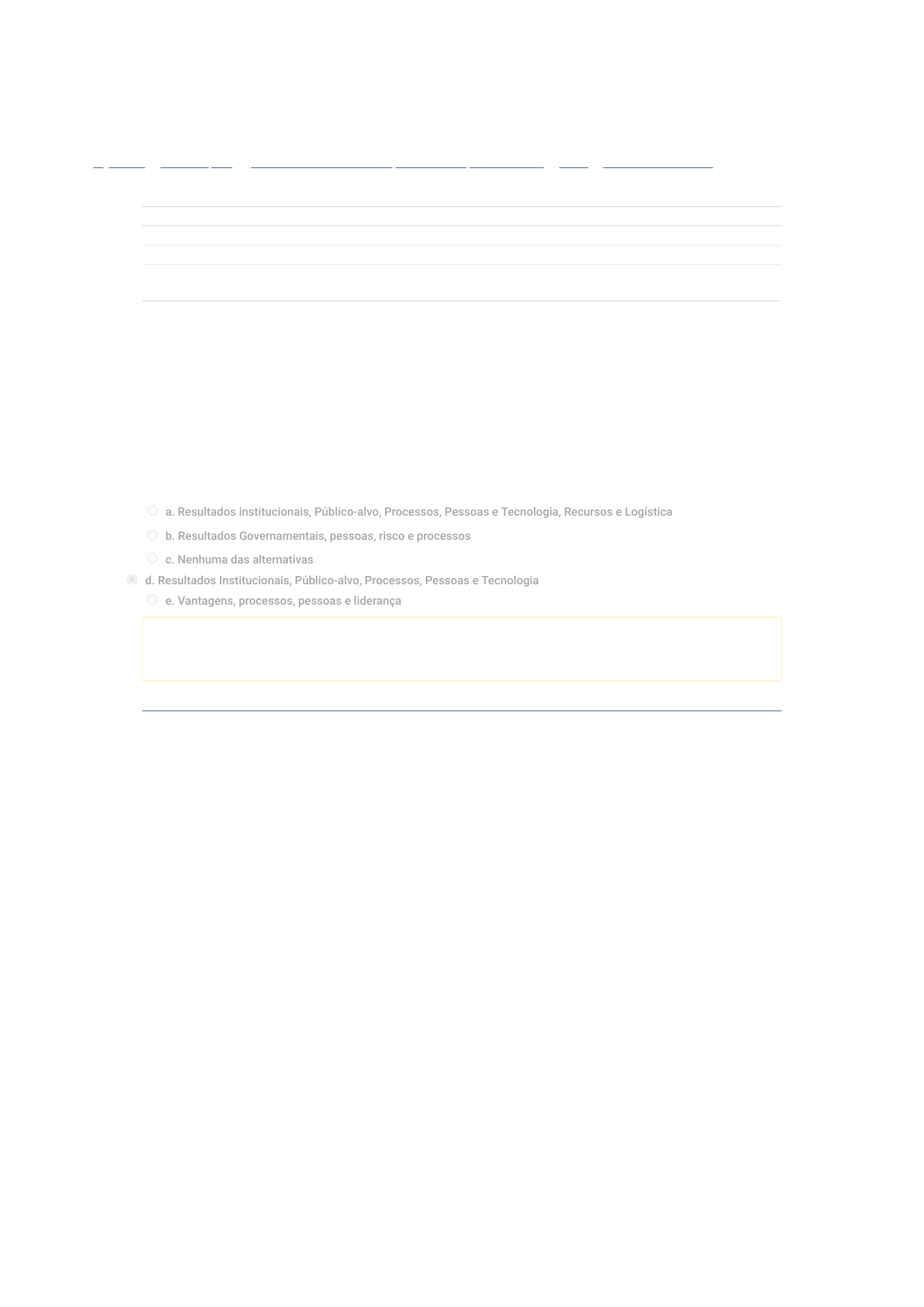 6/7/2020 Exercícios - ELP800-201 - 15: avaliação da tentativa https://faculdadetrevisan.mrooms.net/mod/quiz/review.php?attempt=142335&cmid=23009 1/4 Página inicial / Minhas disciplinas / (ELP800 / EAD / 1º semestre de 2020) ÉTICA E LEGISLAÇÃO PROFISSIONAL / Aula 15 / Exercícios - ELP800-201 - 15 Iniciado em domingo, 7 jun 2020, 19:57 Estado Finalizada Concluída em domingo, 7 jun 2020, 19:58 Tempo empregado 57 segundos Avaliar 5,00 de um máximo de 10,00(50%) Questão 1 Incorreto Atingiu 0,00 de 2,50 Qual alternativa abaixo, apresenta corretamente os grupos que forma o mapa estratégico do sistema CFC/CRCs? Escolha uma: a. Resultados institucionais, Público-alvo, Processos, Pessoas e Tecnologia, Recursos e Logística b. Resultados Governamentais, pessoas, risco e processos c. Nenhuma das alternativas d. Resultados Institucionais, Público-alvo, Processos, Pessoas e Tecnologia e. Vantagens, processos, pessoas e liderança Sua resposta está incorreta. A resposta correta é: Resultados institucionais, Público-alvo, Processos, Pessoas e Tecnologia, Recursos e Logística. https://faculdadetrevisan.mrooms.net/ https://faculdadetrevisan.mrooms.net/course/view.php?id=328 https://faculdadetrevisan.mrooms.net/course/view.php?id=328#section-17 https://faculdadetrevisan.mrooms.net/mod/quiz/view.php?id=23009 6/7/2020 Exercícios - ELP800-201 - 15: avaliação da tentativa https://faculdadetrevisan.mrooms.net/mod/quiz/review.php?attempt=142335&cmid=23009 2/4 Questão 2 Correto Atingiu 2,50 de 2,50 I. Conforme estabelecido no Regulamento Geral dos Conselhos de Contabilidade, aprovado pela Resolução CFC No 1370/2011, julgue os itens abaixo como Verdadeiros (V) ou Falsos (F) e, em seguida, assinale a opção CORRETA. II. Qualquer que seja a forma de sua organização, a pessoa jurídica somente poderá explorar serviços contábeis, próprios ou de terceiros, depois que provar no CRC de sua jurisdição que os responsáveis pela parte técnica e os que executam trabalhos técnicos, no respectivo setor ou serviço, são pro�ssionais em situação ativa e regular perante o CRC de seu registro. III. É dispensado do registro pro�ssional perante o CRC, o pro�ssional que ocupe, nos órgãos da administração pública, direta ou indireta e fundacional e nas empresas públicas, cargo ou função que envolva atividades que constituem prerrogativas dos contadores e dos técnicos em contabilidade. III. Em relação à aplicação de penalidades por infrações cometidas, os sócios respondem solidariamente pelos atos relacionados ao exercício da pro�ssão contábil praticados por pro�ssionais ou por leigos em nome da organização contábil. A sequência CORRETA é: Escolha uma: a. F, V, F. b. F, V, V c. V, F, F. d. V, F, V. e. F,F,V Sua resposta está correta. A resposta correta é: V, F, V.. 6/7/2020 Exercícios - ELP800-201 - 15: avaliação da tentativa https://faculdadetrevisan.mrooms.net/mod/quiz/review.php?attempt=142335&cmid=23009 3/4 Questão 3 Correto Atingiu 2,50 de 2,50 Questão 4 Incorreto Atingiu 0,00 de 2,50 A �scalização do exercício da pro�ssão do Contabilista será exercida pelos: Escolha uma: a. Conselho Federal da Contabilidade e Sindicato dos Contabilistas. b. Conselhos Regionais de Contabilidade e Sindicato dos Contabilistas. c. Conselhos Regionais de Contabilidade e Associação dos Contabilistas. d. Conselho Federal de Contabilidade e Conselhos Regionais de Contabilidade e. Conselho Federal de Contabilidade e Associação dos Contabilistas. Sua resposta está correta. A resposta correta é: Conselho Federal de Contabilidade e Conselhos Regionais de Contabilidade. A Resolução CFC n.º 1.370/2011, que trata do Regulamento Geral dos Conselhos de Contabilidade, estabelece a competência dos Conselhos de Contabilidade, nos termos da delegação conferida pelo Decreto n.º 9.295/1946. Considerando-se a Resolução CFC n.º 1.370/2011, assinale a alternativa que NÃO constitui competência dos Conselhos de Contabilidade. Escolha uma: a. Registrar, �scalizar, orientar e disciplinar tecnicamente o exercício da pro�ssão contábil em todo o território nacional. b. Regular sobre o Exame de Su�ciência, o Cadastro de Quali�cação Técnica e os Programas de Educação Continuada. c. Ajuizar responsabilização civil de Pro�ssional da Contabilidade que tenha incorrido em prática inconsistente com as normas de relatório �nanceiro em vigor. d. Editar Normas Brasileiras de Contabilidade de natureza técnica e pro�ssional, bem como os Princípios Contábeis. e. Registrar, �scalizar, orientar e disciplinar, eticamente, o exercício da pro�ssão contábil em todo o território nacional. Sua resposta está incorreta. A resposta correta é: Ajuizar responsabilização civil de Pro�ssional da Contabilidade que tenha incorrido em prática inconsistente com as normas de relatório �nanceiro em vigor.. 6/7/2020 Exercícios - ELP800-201 - 15: avaliação da tentativa https://faculdadetrevisan.mrooms.net/mod/quiz/review.php?attempt=142335&cmid=23009 4/4 ◄ Palavra do Mestre Seguir para... Saiba Mais ► https://faculdadetrevisan.mrooms.net/mod/page/view.php?id=20505&forceview=1 https://faculdadetrevisan.mrooms.net/mod/page/view.php?id=20506&forceview=1